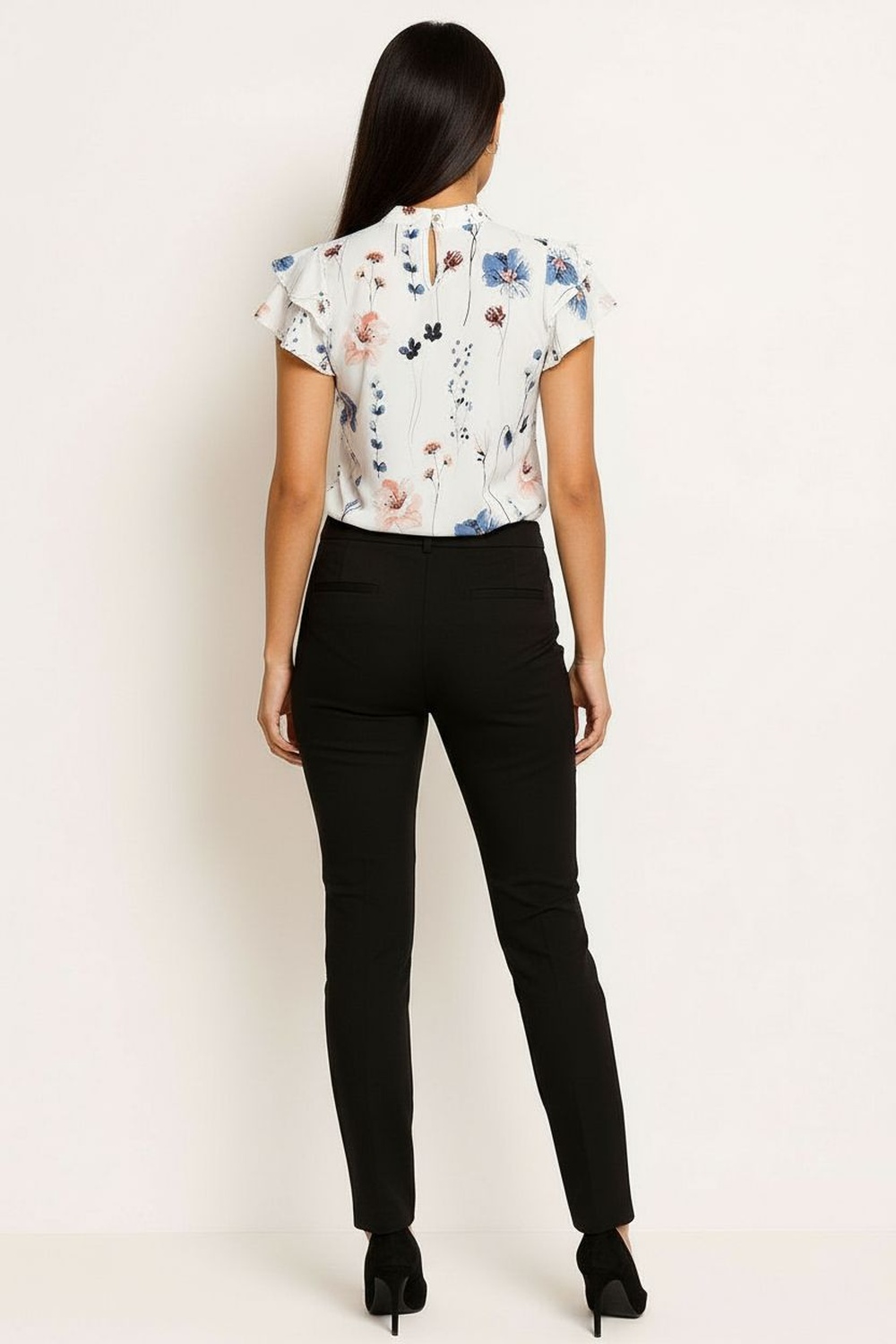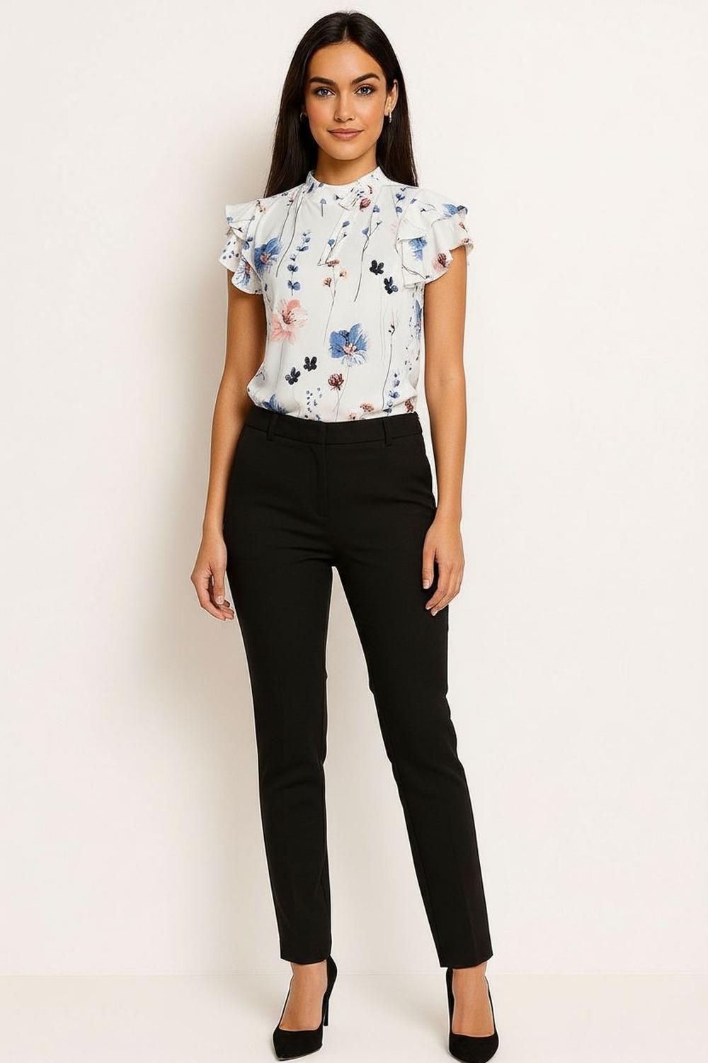 Playera estilo wrap con estampado floral mini, escote en V profundo estiliza el cuello y realza el escote con elegancia, mientras que el lazo lateral permite ajustar la silueta a la medida perfecta, las mangas cortas y el delicado volante en el bajo aportan movimiento y un aire romántico, ideal para eventos formales