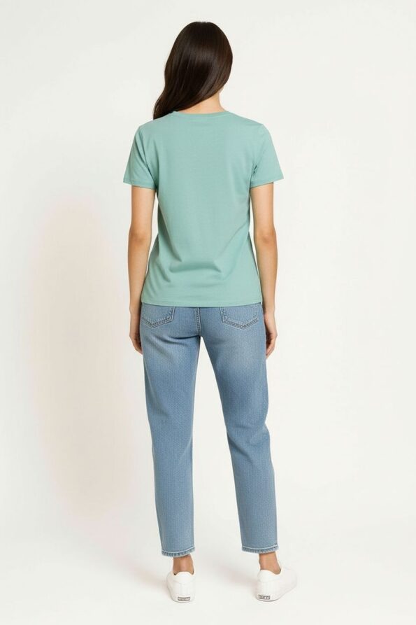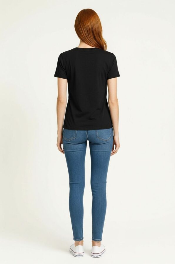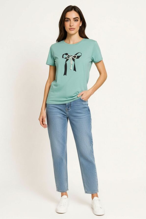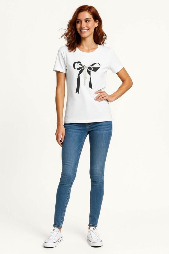 Playera de manga corta confeccionada en algodón suave que brinda comodidad y transpirabilidad, diseño con aplicación frontal de moño decorado con perlas que aporta un toque delicado y moderno, cuello redondo con acabado reforzado que mantiene la forma tras cada lavado, confección ligera y práctica ideal para uso diario con estilo