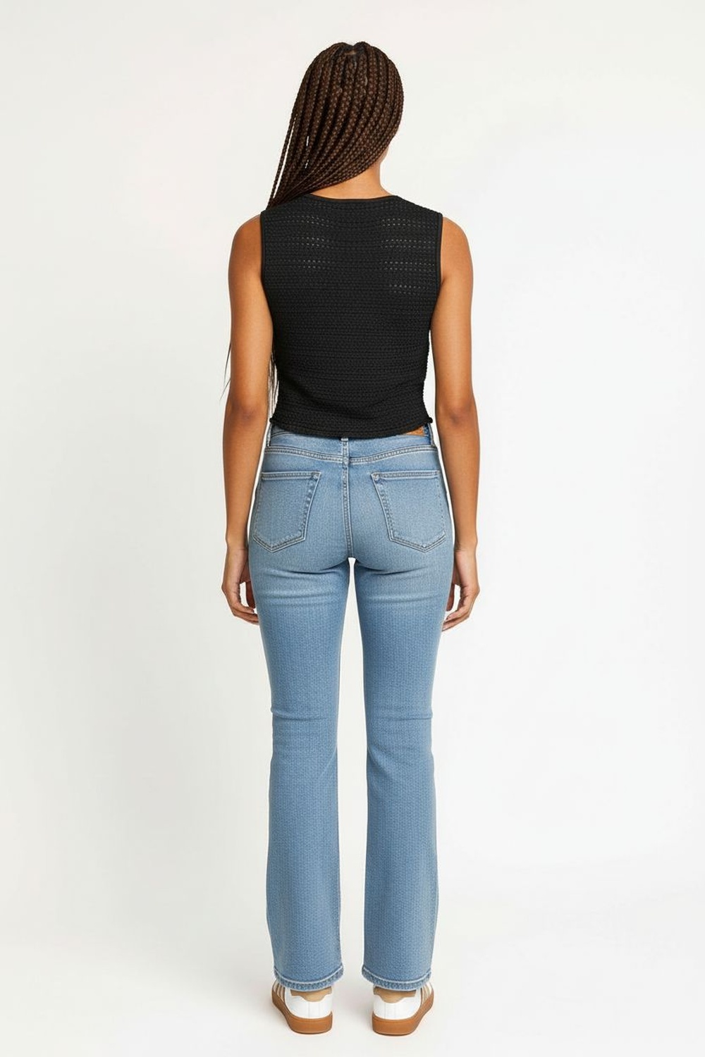 Playera sin mangas con aberturas frontales y moños decorativos en contraste, confección en tejido con relieve que aporta textura visual, cuello redondo con terminación discreta, corte entallado que resalta la silueta