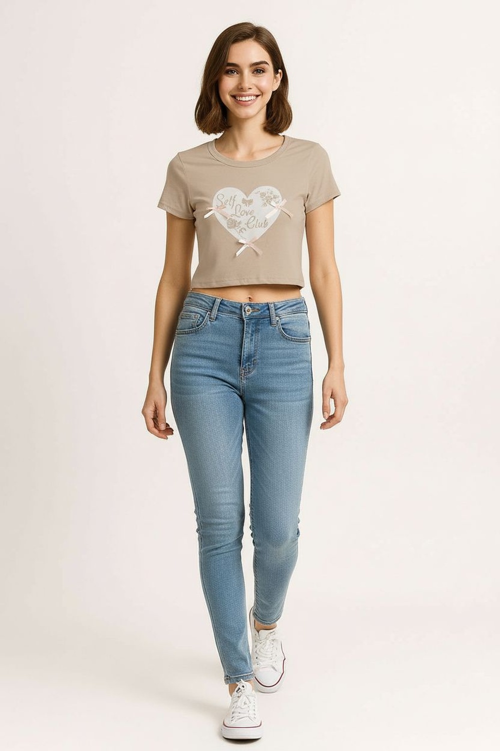 Playera de manga corta con largo a la cintura, cuello redondo de acabado limpio, confección en tejido de algodón de tacto suave, aplicación frontal con detalles decorativos integrados a la prenda, estructura ligera que brinda comodidad durante el uso
