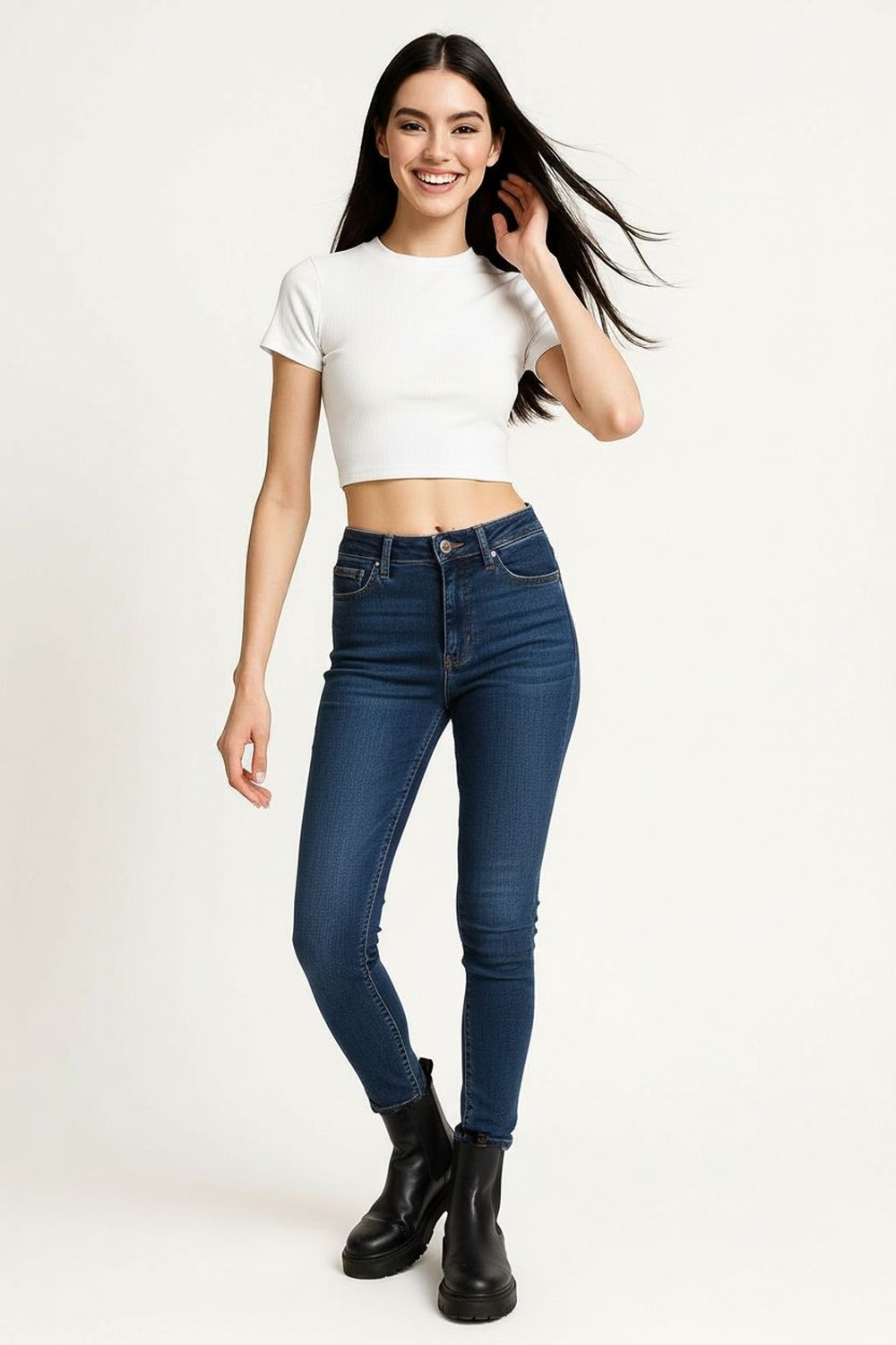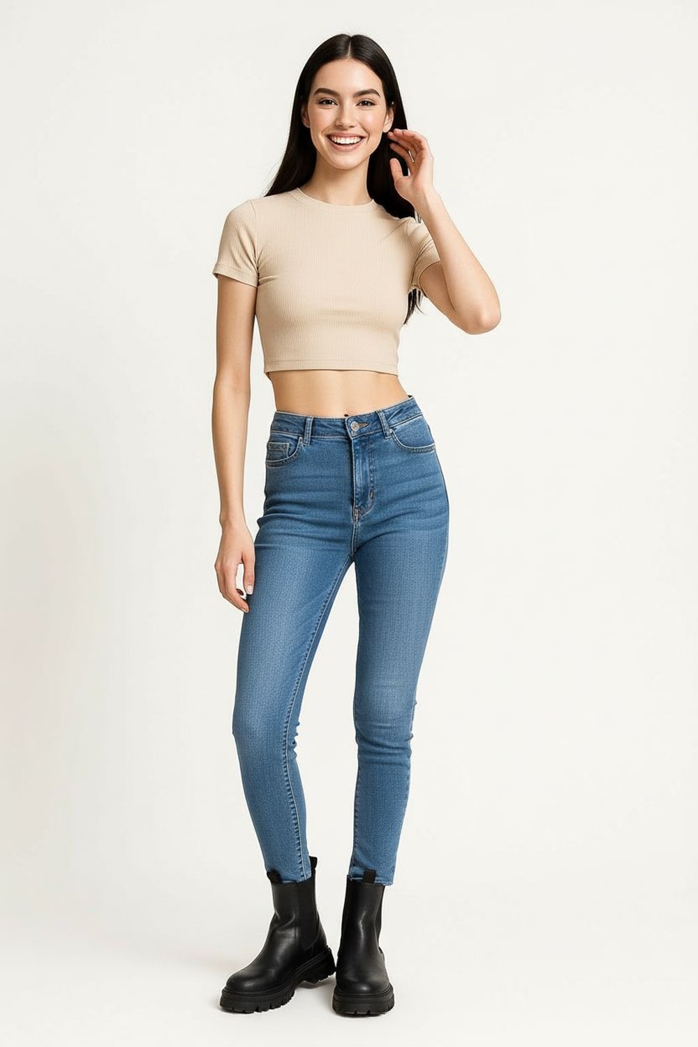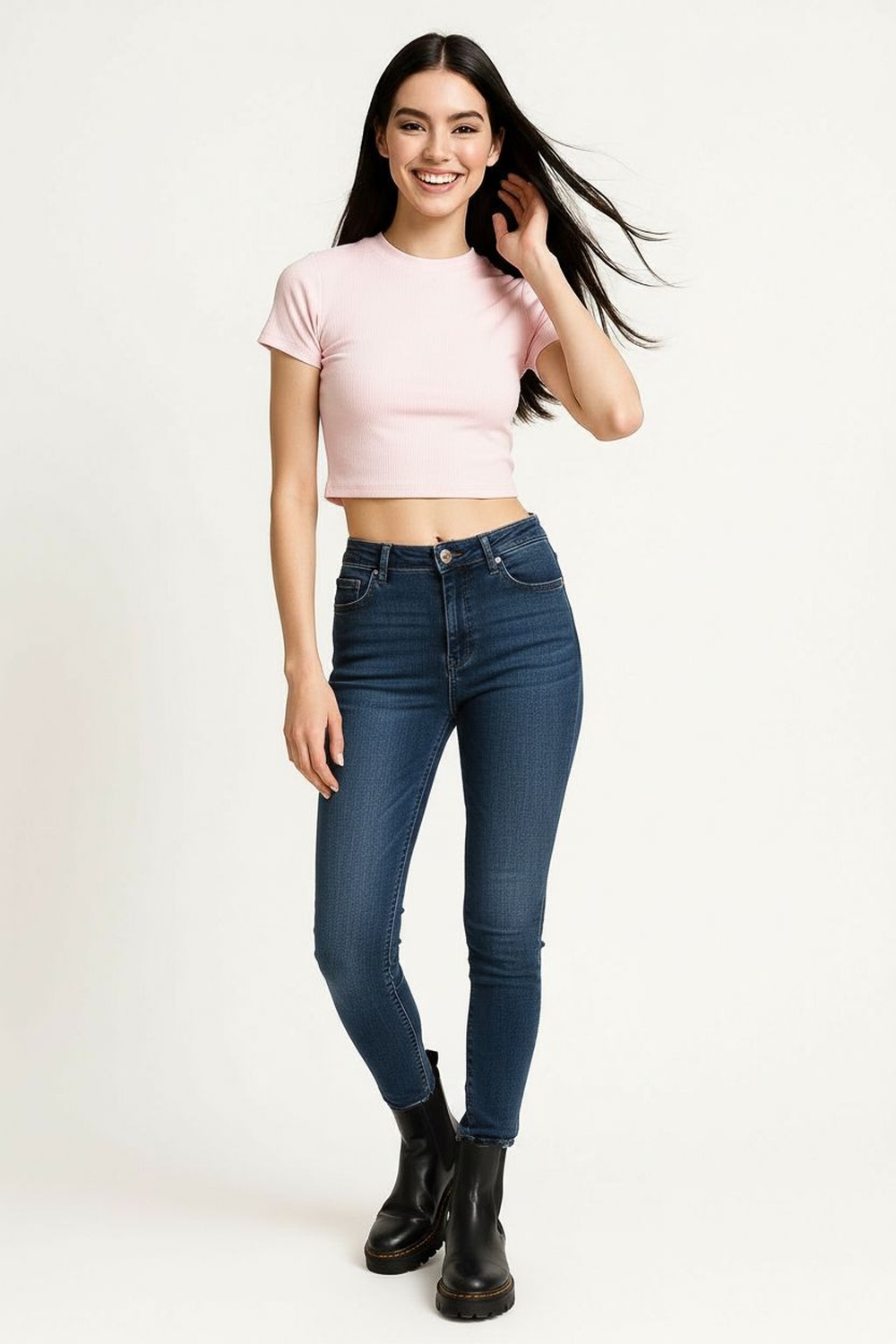 Playera corta de manga corta con cuello redondo clásico, silueta ajustada que resalta la forma natural, largo por encima de la cintura, confección en tejido elástico de tacto suave y ligero