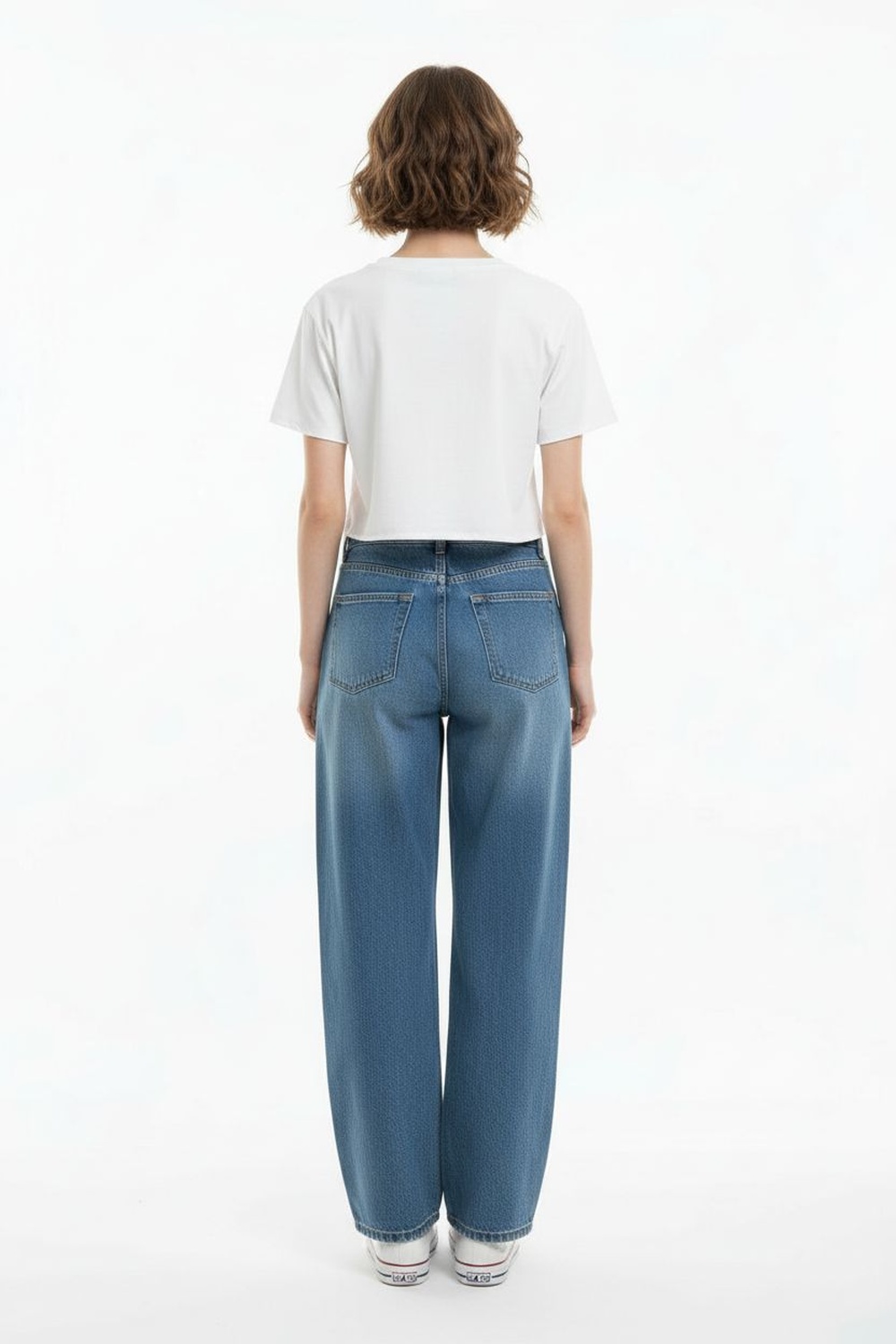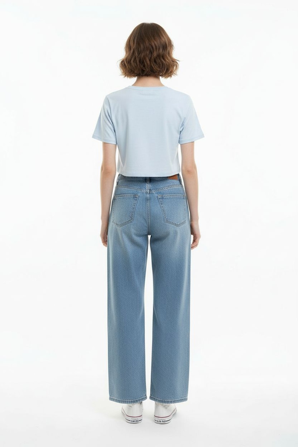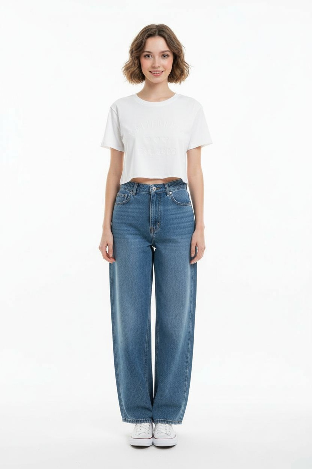 Playera corta de manga corta con cuello redondo y detalle frontal en relieve, silueta recta y terminación a la cintura