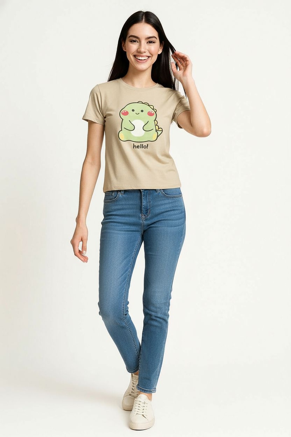 Playera corta de algodón con diseño frontal animado, cuello redondo y mangas cortas que brindan frescura, confección ligera de tacto suave que garantiza comodidad durante el uso diario