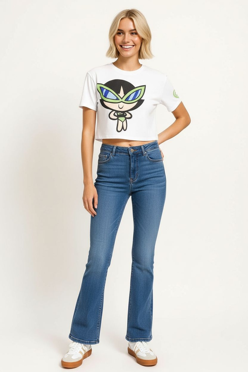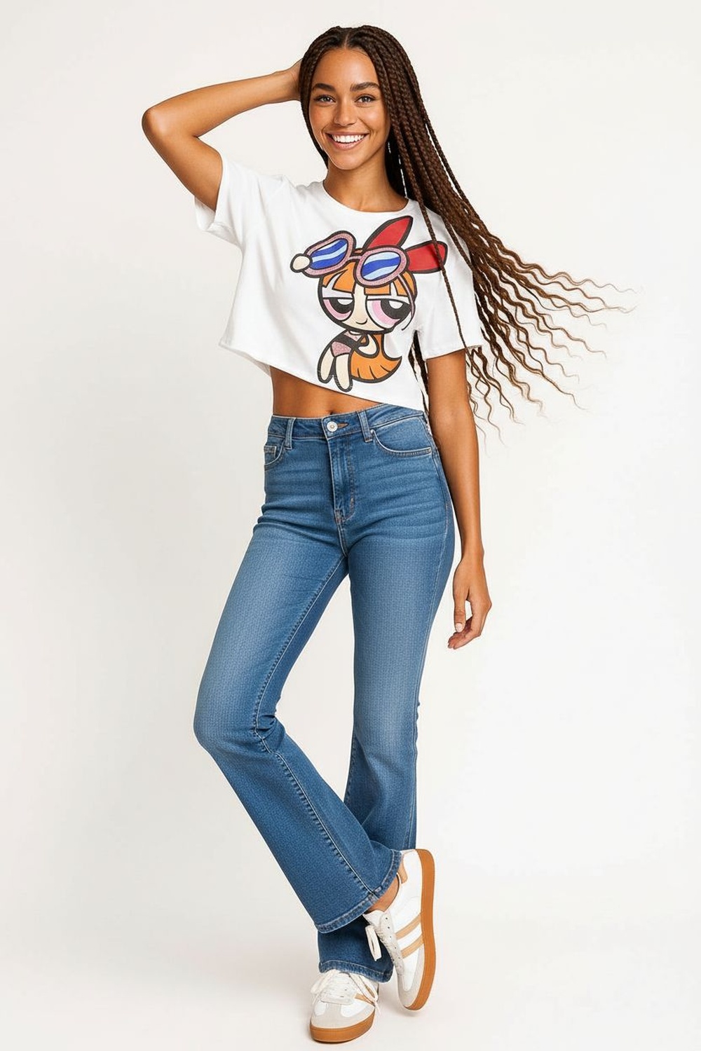 Playera corta de manga corta con diseño frontal inspirado en personajes animados, confección en algodón suave que brinda frescura y comodidad, cuello redondo reforzado y dobladillo recto que aportan durabilidad y estilo juvenil, corte suelto que ofrece libertad de movimiento