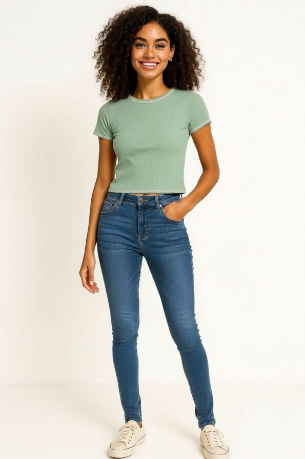 Playera corta de manga corta confeccionada en tejido rib que se ajusta suavemente al cuerpo, cuello redondo y mangas con terminaciones en contraste que aportan un detalle moderno, diseño corto por encima de la cintura que realza la figura y brinda un look juvenil, confección en tela elástica y ligera que asegura comodidad y libertad de movimiento, acabado suave al tacto que garantiza confort durante el día