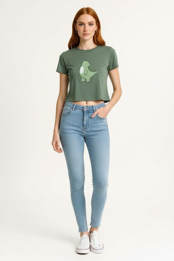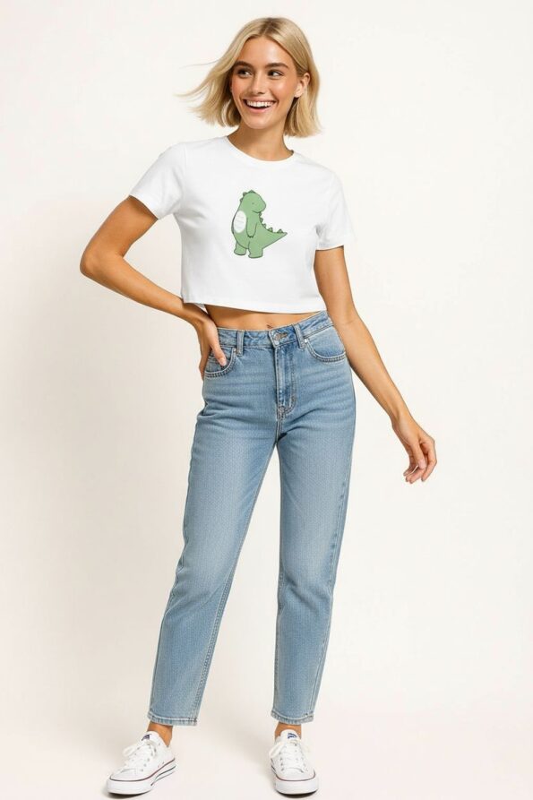 Playera corto de manga corta con corte ajustado que resalta la figura, cuello redondo con terminación sencilla que brinda un acabado limpio, diseño juvenil con ilustración al frente que aporta un toque divertido, largo por encima de la cintura que favorece un look fresco y moderno, confección en tela suave y ligera que asegura comodidad durante todo el día