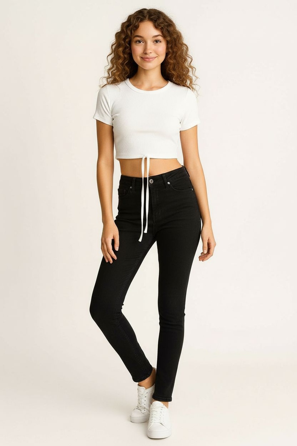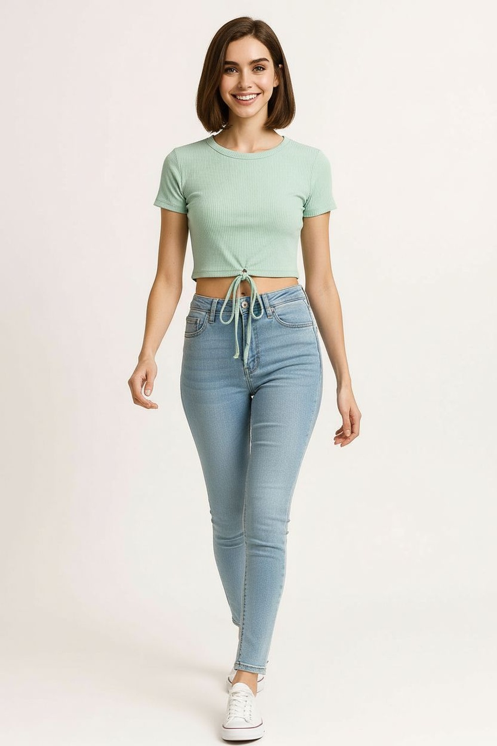 Playera crop manga corta, cuello redondo, tejido acanalado flexible, amarre frontal ajustable, terminación corta, confección cómoda
