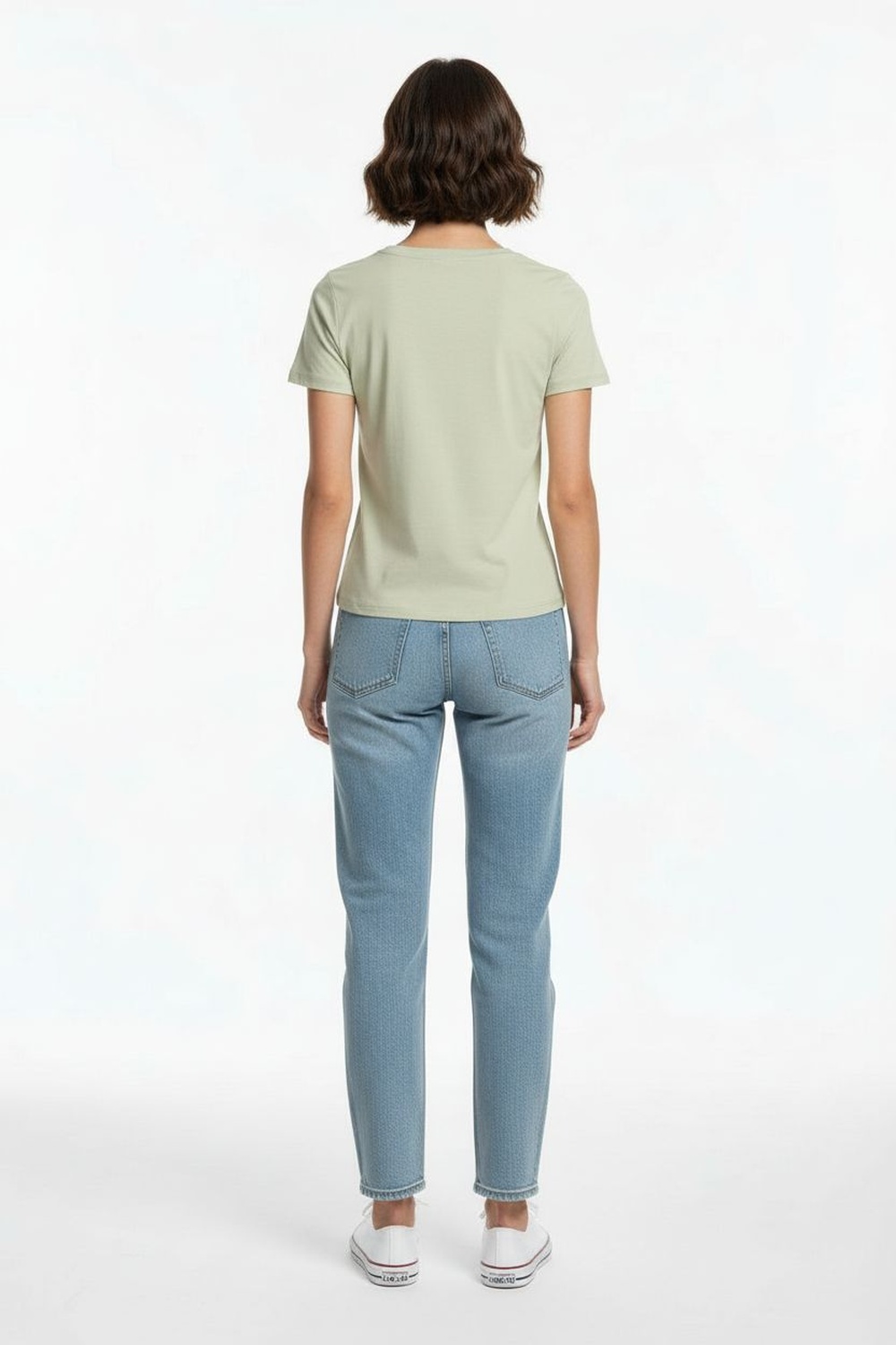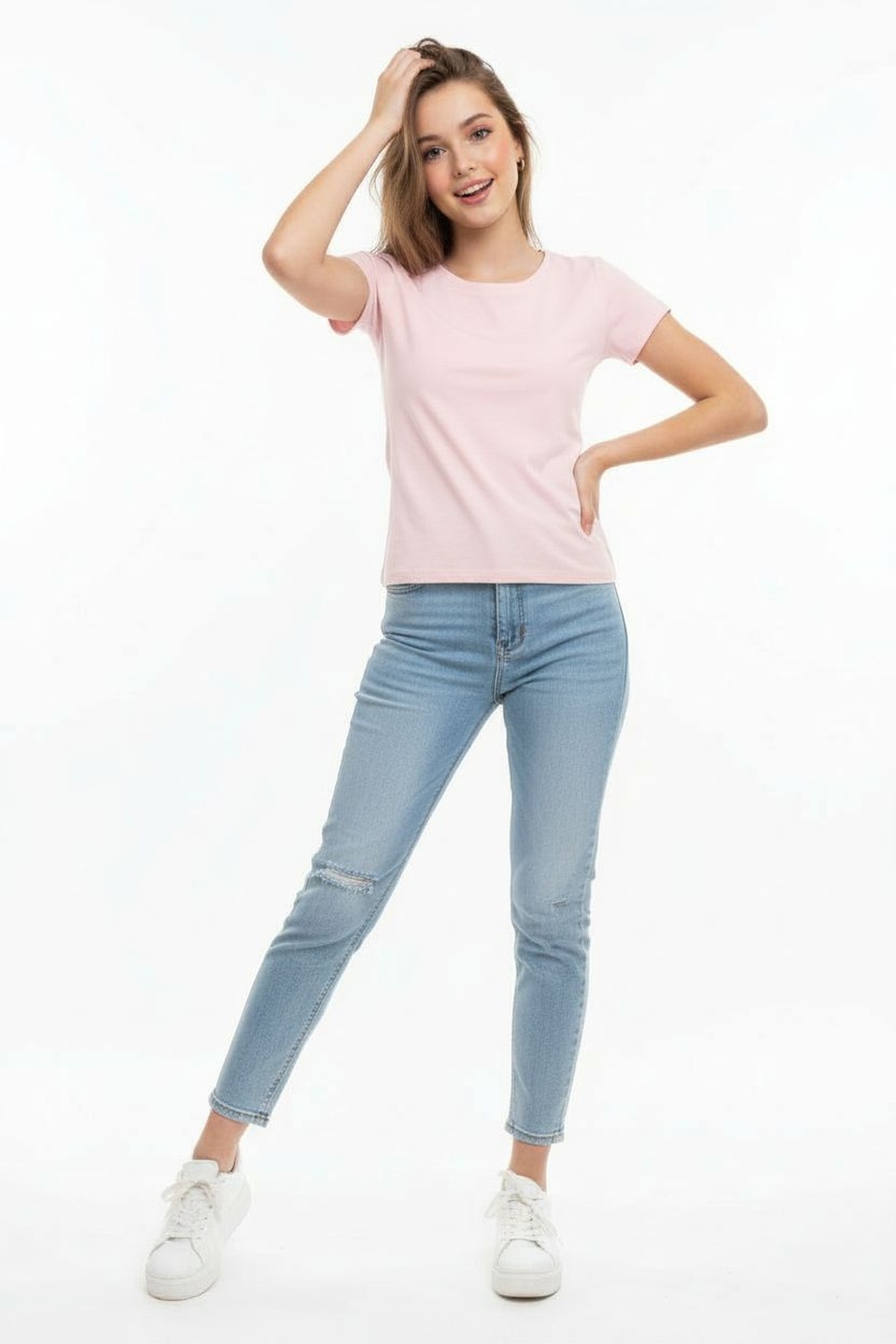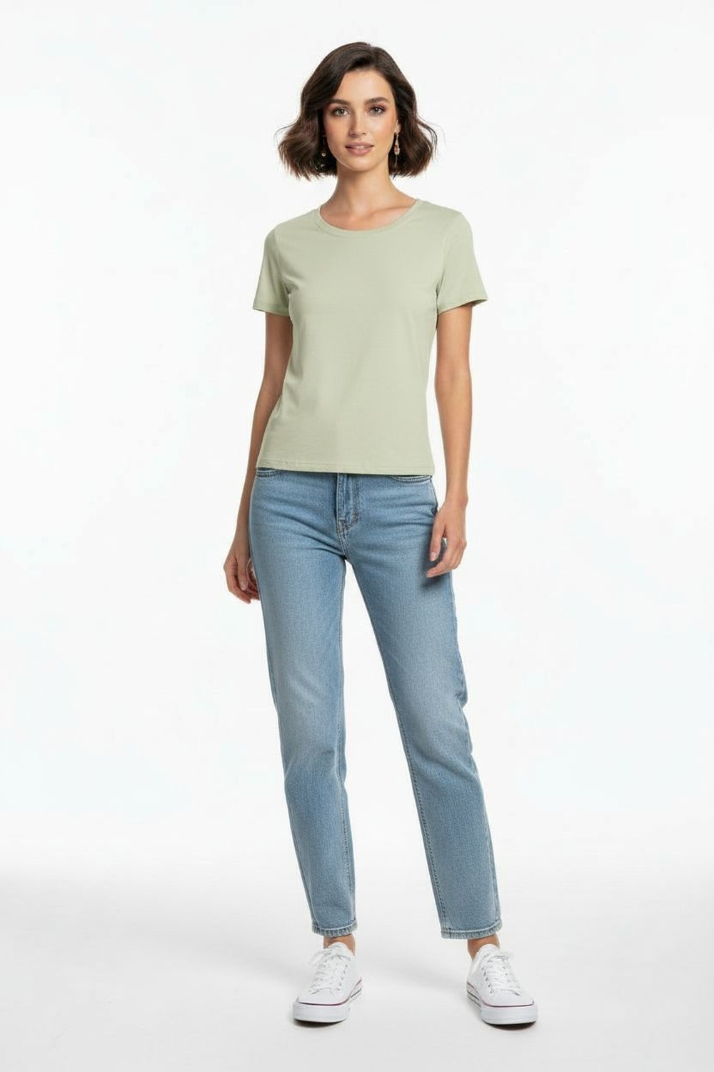 Playera tipo crop con cuello redondo, manga corta, estructura ligera, corte recto con caída suave, acabado limpio en bordes y confección cómoda para uso diario