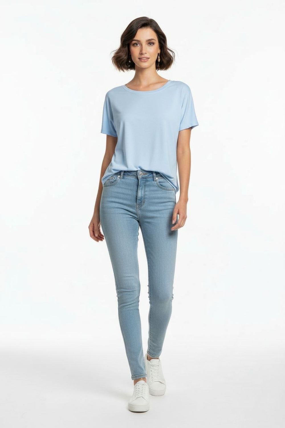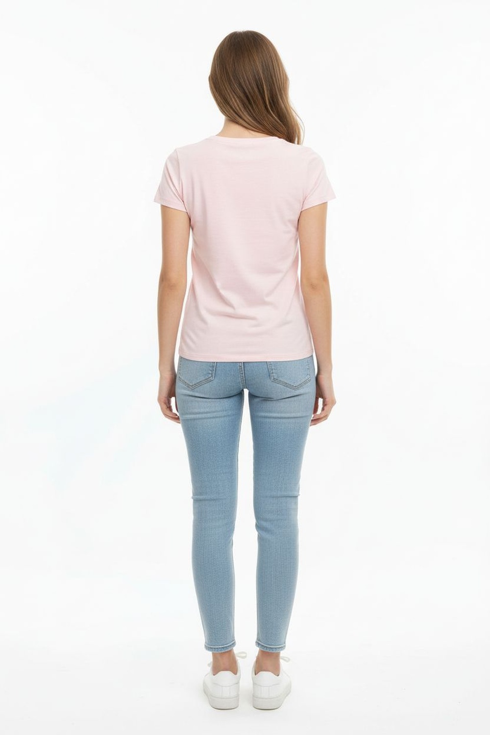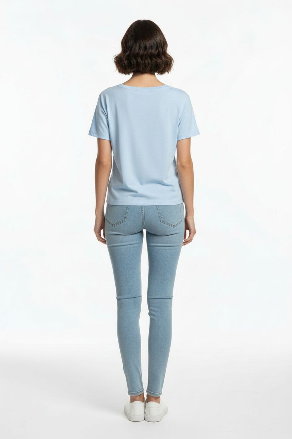 Playera tipo crop con cuello redondo, manga corta, estructura ligera, corte recto con caída suave, acabado limpio en bordes y confección cómoda para uso diario