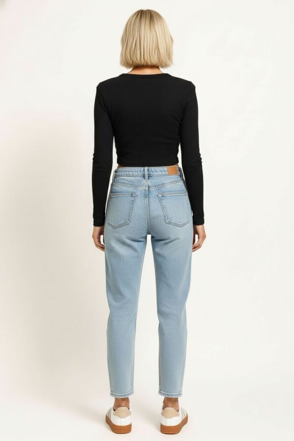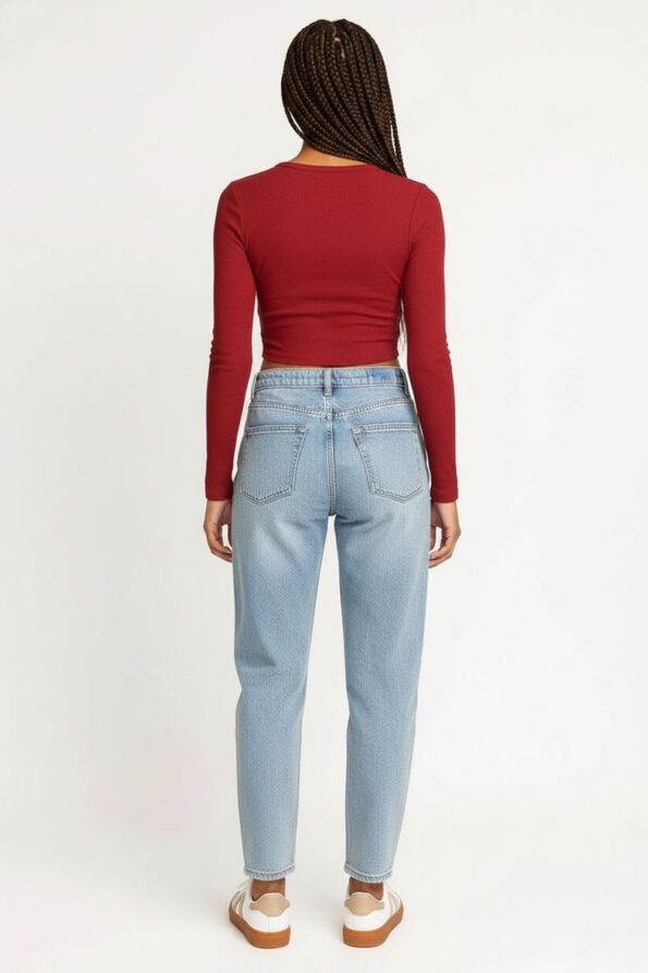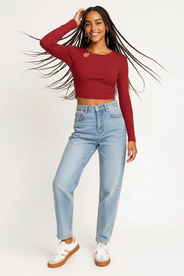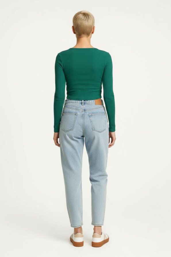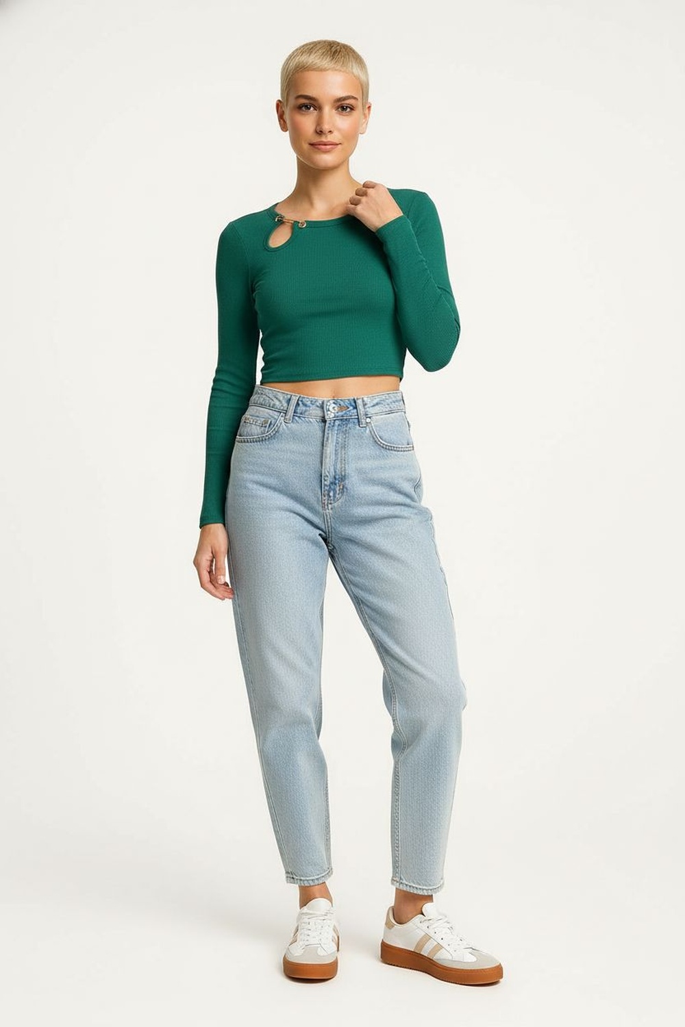 Playera crop confeccionada en tejido rib de grosor medio que brinda estructura y suavidad, diseño de manga larga con escote asimétrico decorado con aplicación metálica que aporta un toque moderno, pretina ajustada que define la cintura y favorece la figura, confección elástica que ofrece libertad de movimiento y mantiene su forma tras cada uso
