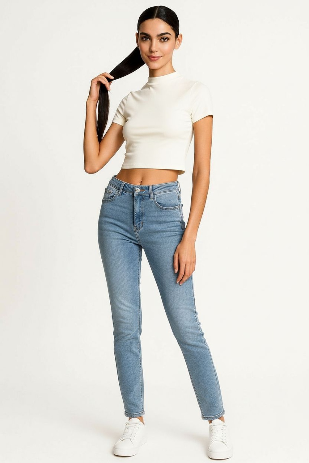 Playera crop de cuello alto con ajuste ceñido que define la parte superior, manga corta integrada que aporta equilibrio visual, largo a la cintura que resalta la silueta, confección en tejido elástico de tacto suave que permite libertad de movimiento, acabado limpio en dobladillo que brinda mayor estructura