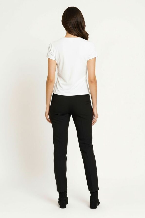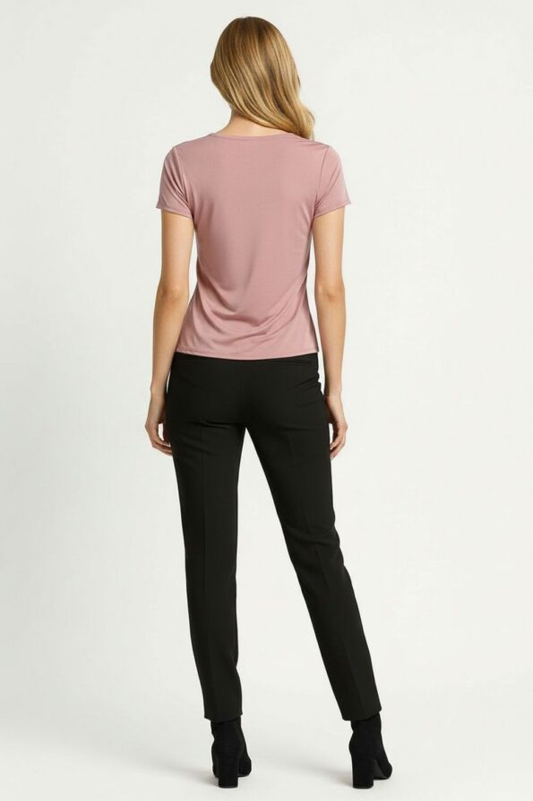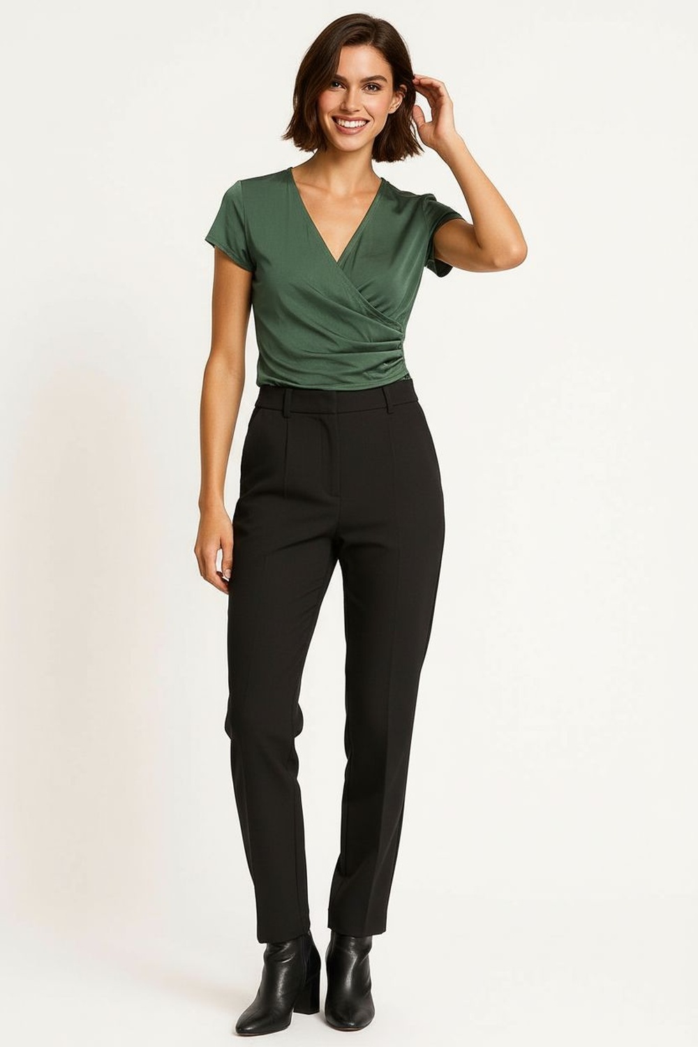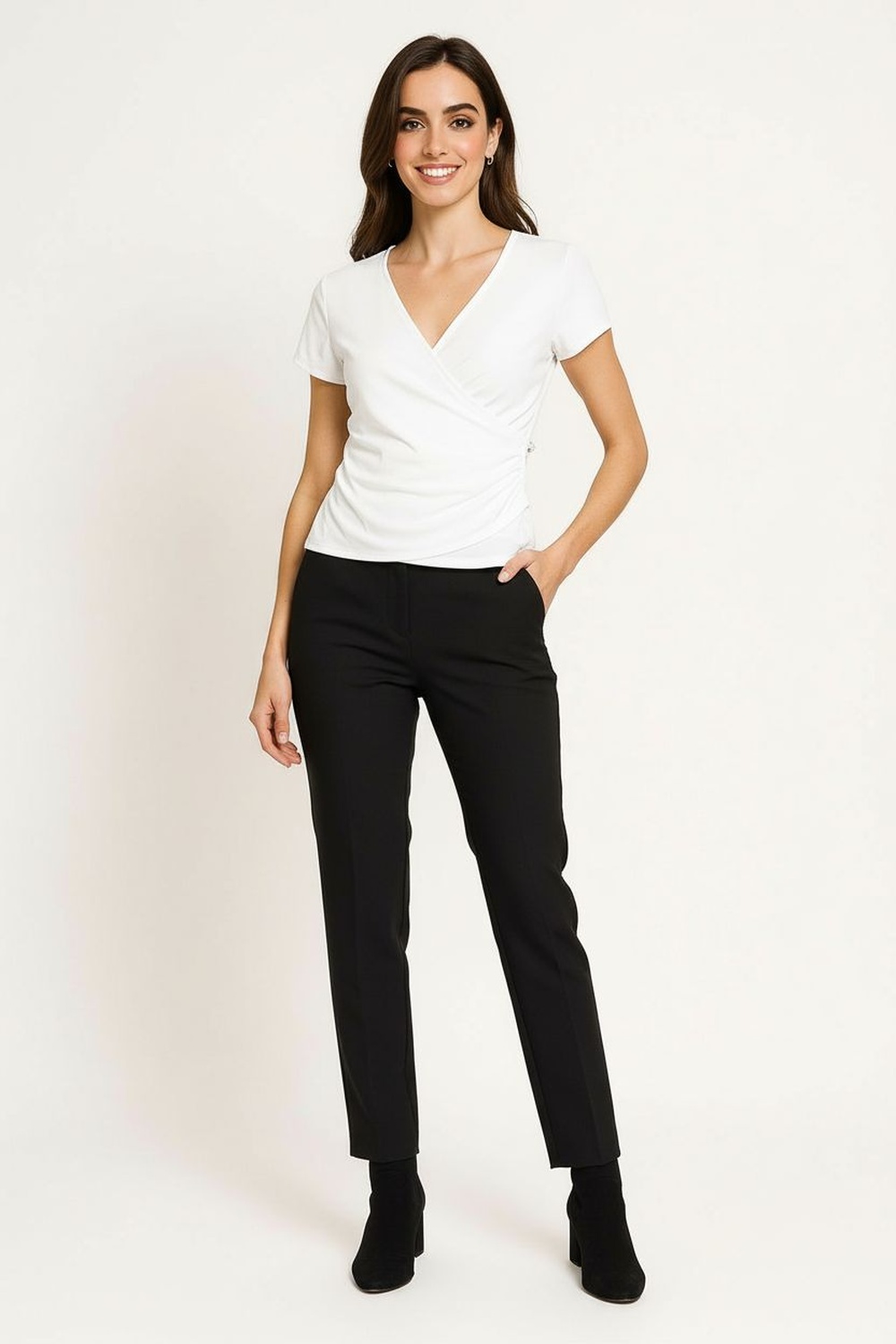 Playera con diseño cruzado al frente que realza el escote y estiliza la silueta, confeccionada en tejido suave con caída natural que ofrece comodidad, manga corta con terminación limpia que favorece el movimiento, corte entallado que define la figura y aporta un toque moderno y femenino
