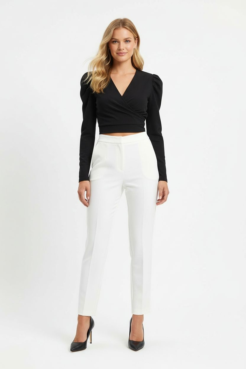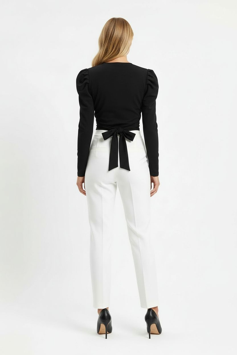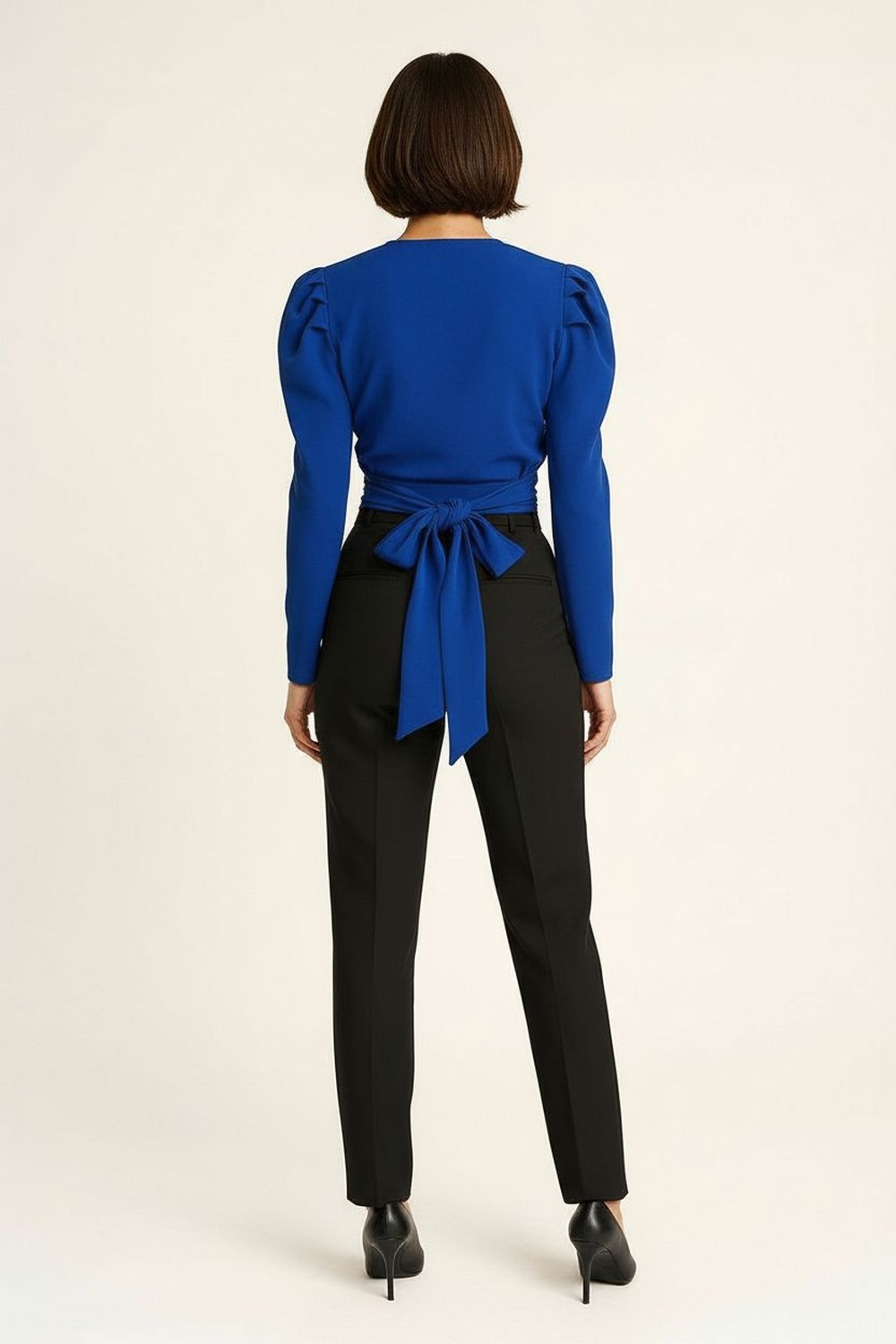 Playera de manga larga con escote en V cruzado que estiliza la silueta, hombros con ligero frunce que aportan volumen femenino, amarre en cintura que permite ajustar la prenda y resaltar la figura, confección en tela suave y cómoda que brinda frescura, ideal para outfits casuales o combinaciones elegantes de temporada