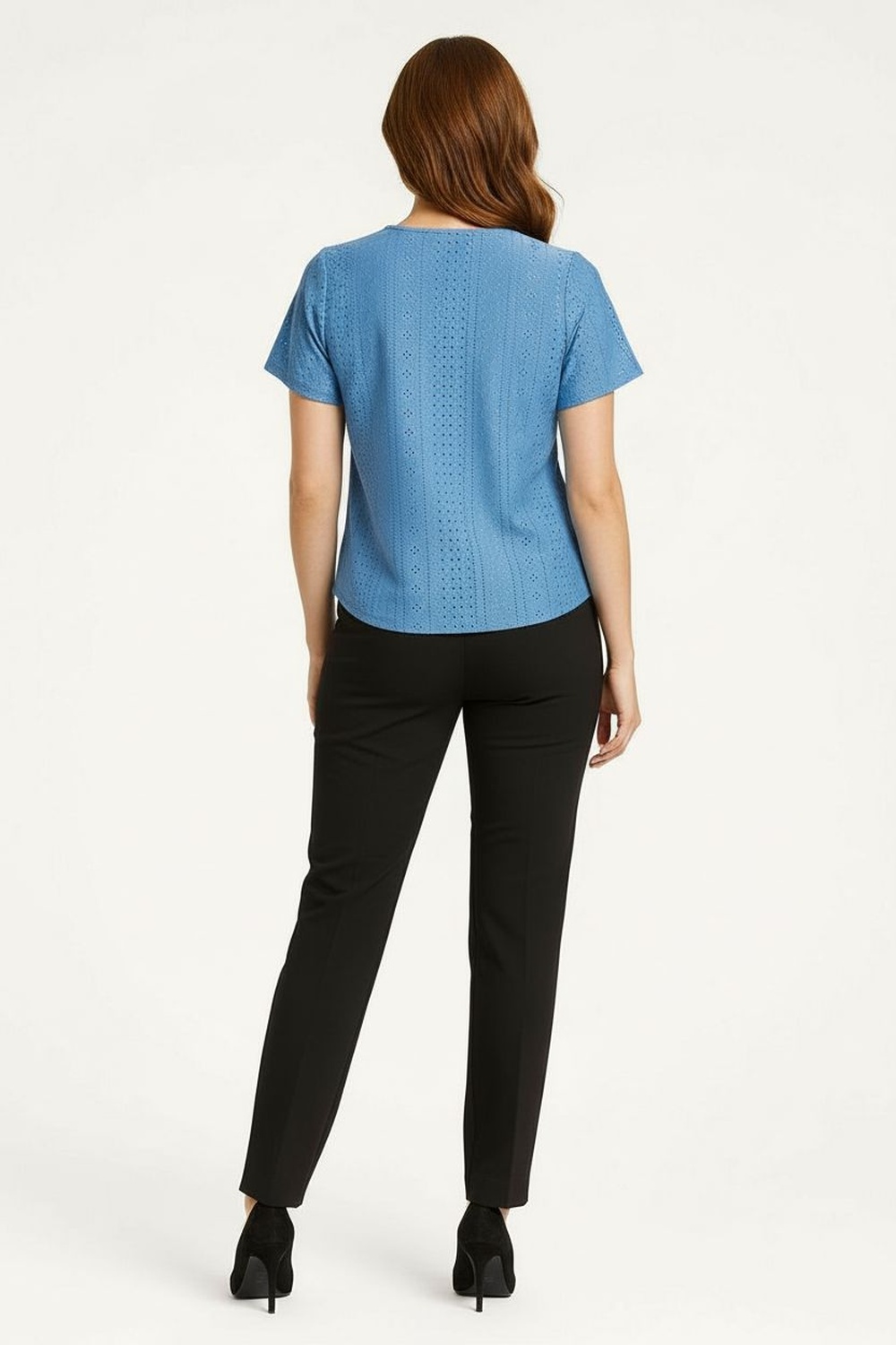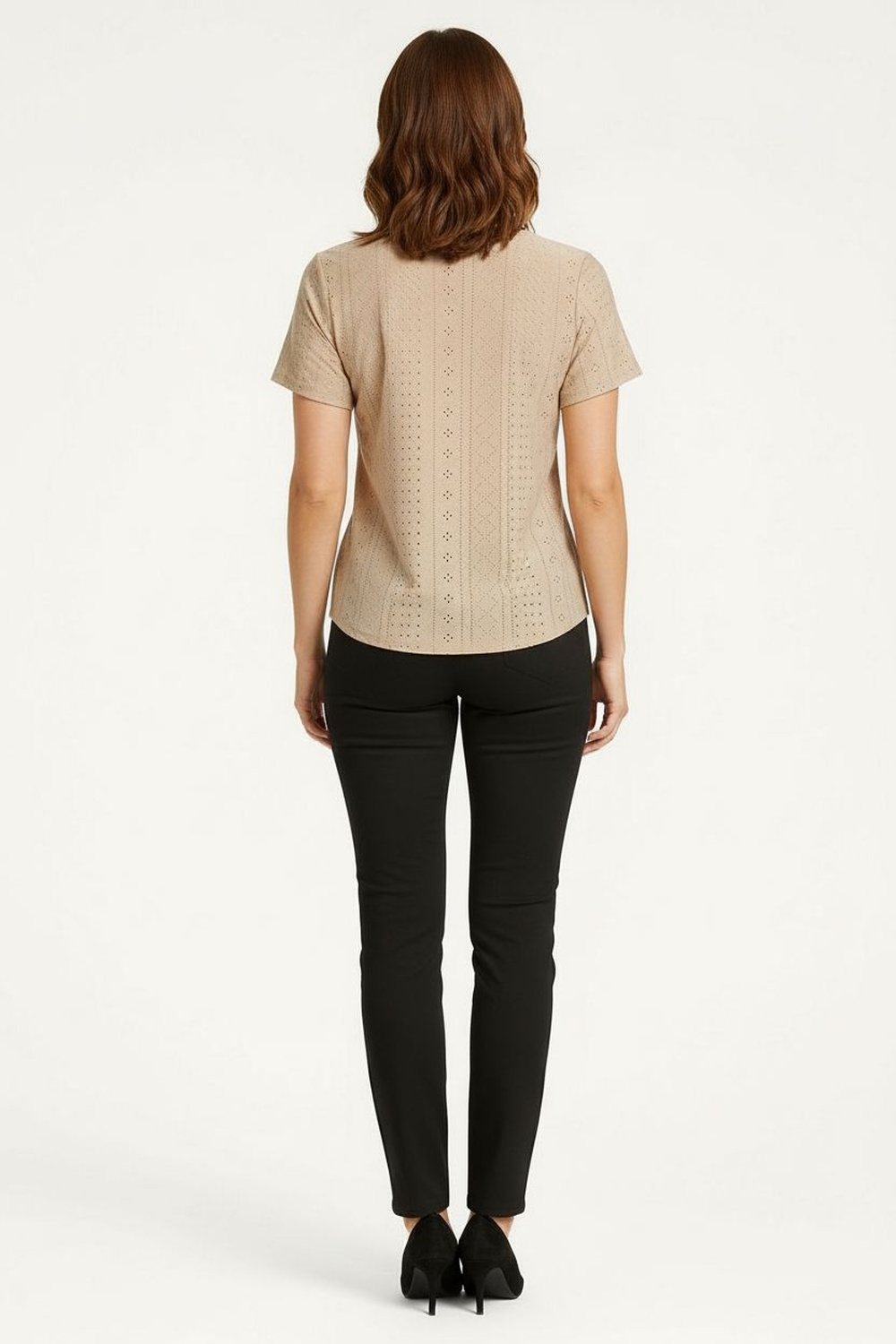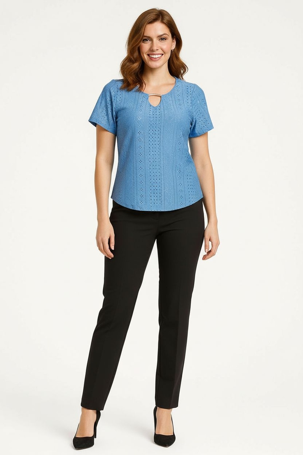 Playera de corte recto con escote redondo y abertura frontal decorativa, manga corta que brinda frescura, estructura ligera que se adapta al cuerpo, confección en tejido calado de tacto suave con buena transpirabilidad