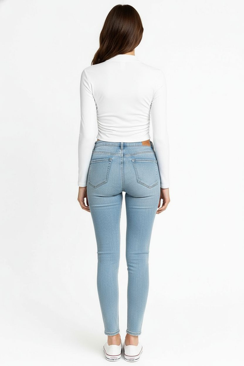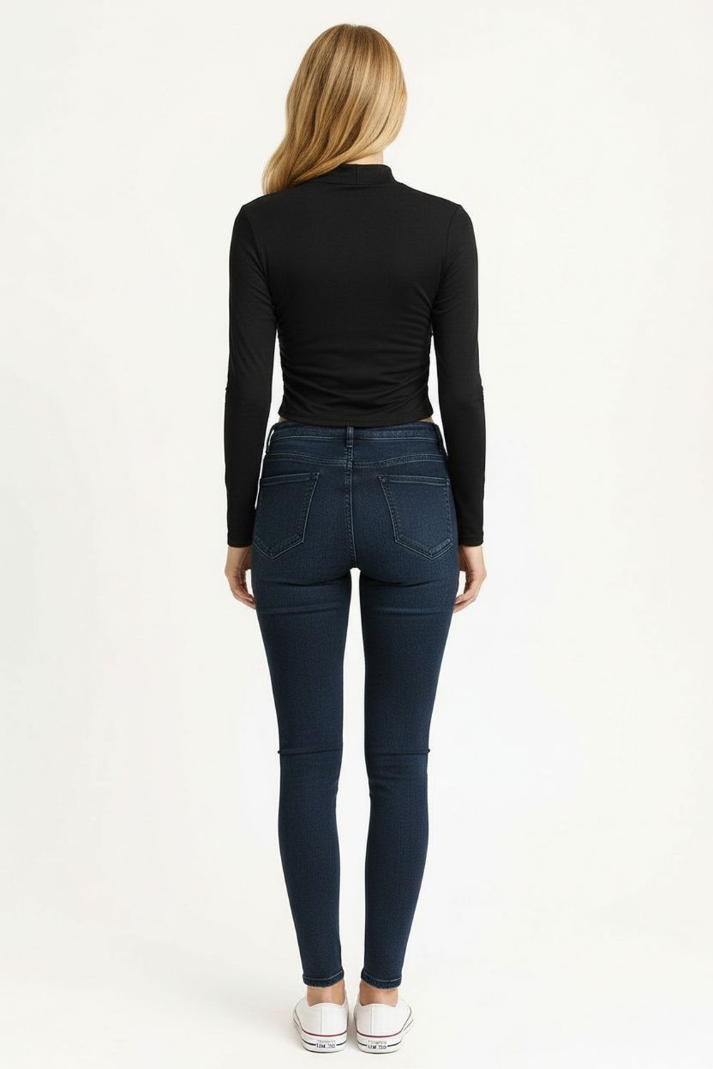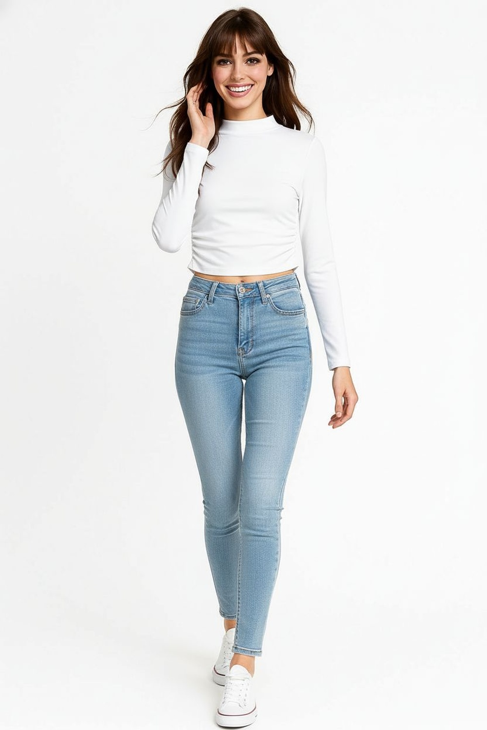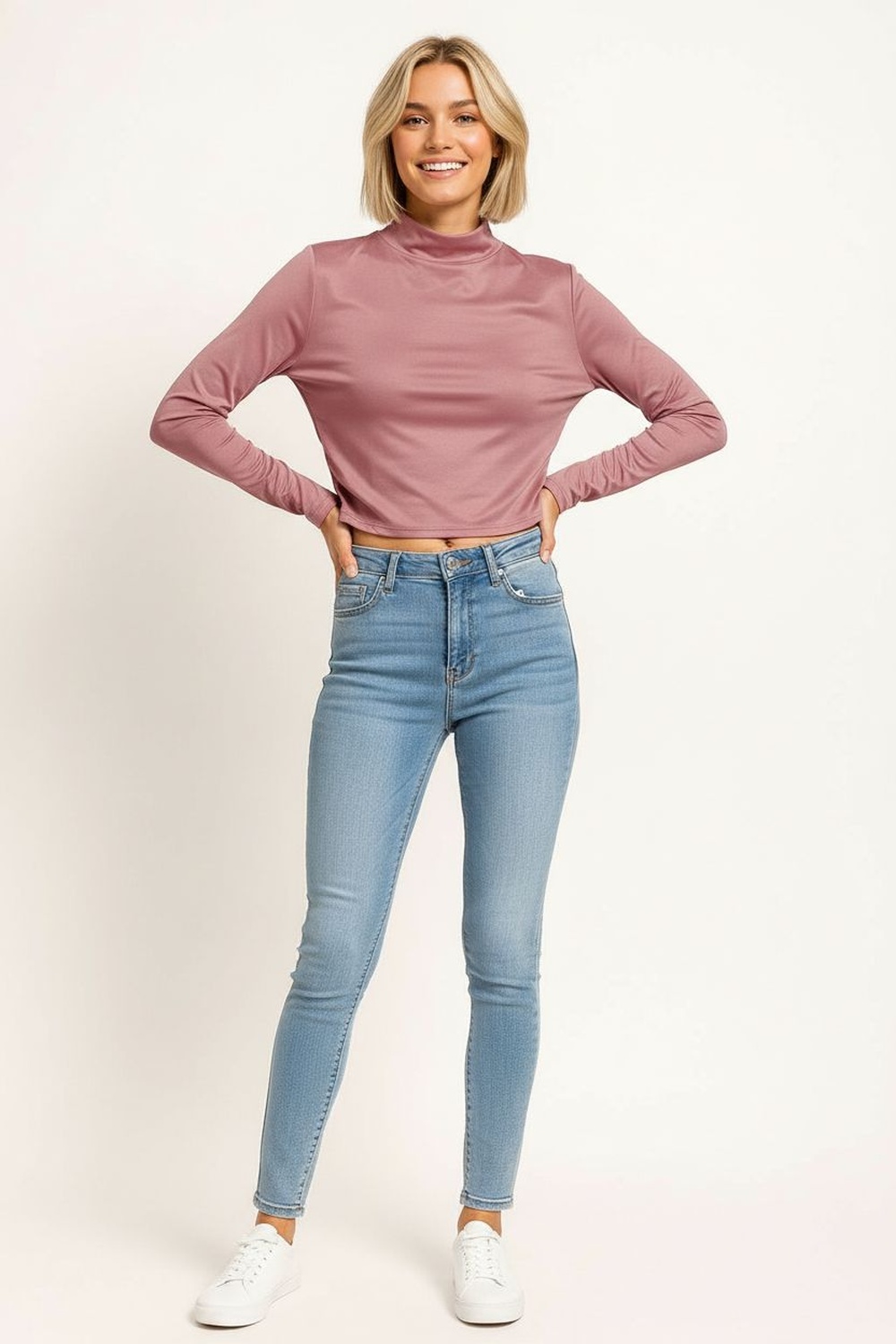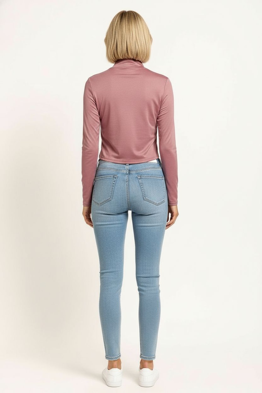 Playera de manga larga con cuello subido que aporta estructura, confección suave al tacto con textura cepillada que brinda comodidad, diseño entallado que define la figura, largo a la cintura con dobladillo discreto que mantiene un acabado limpio