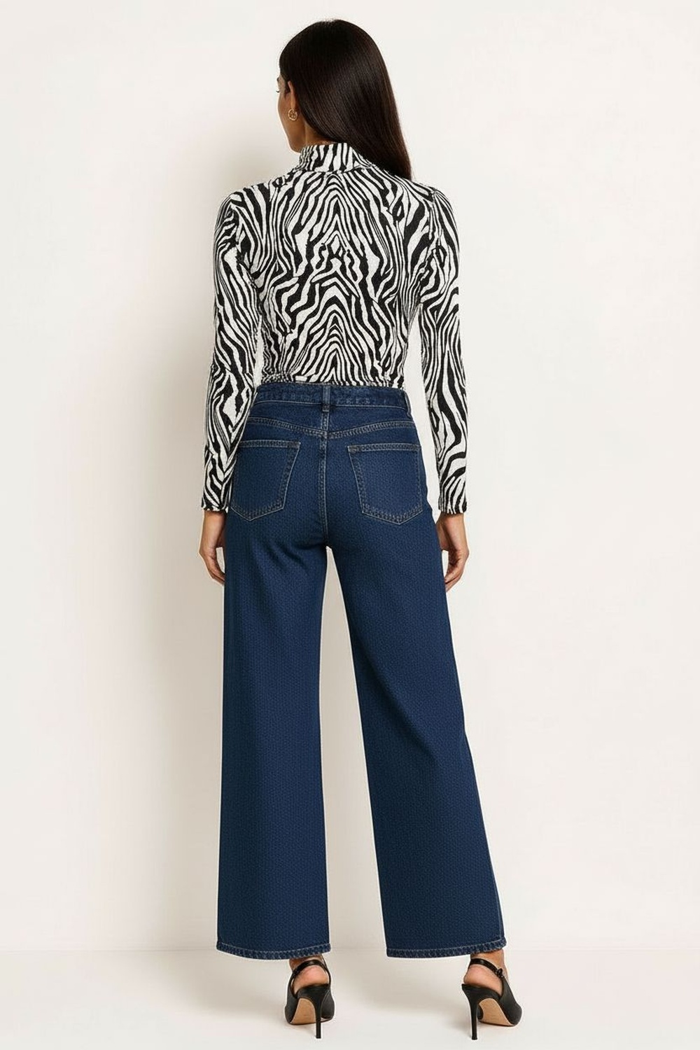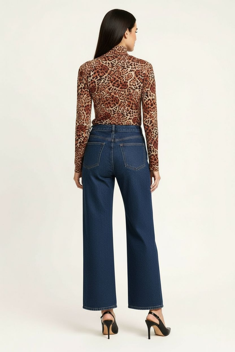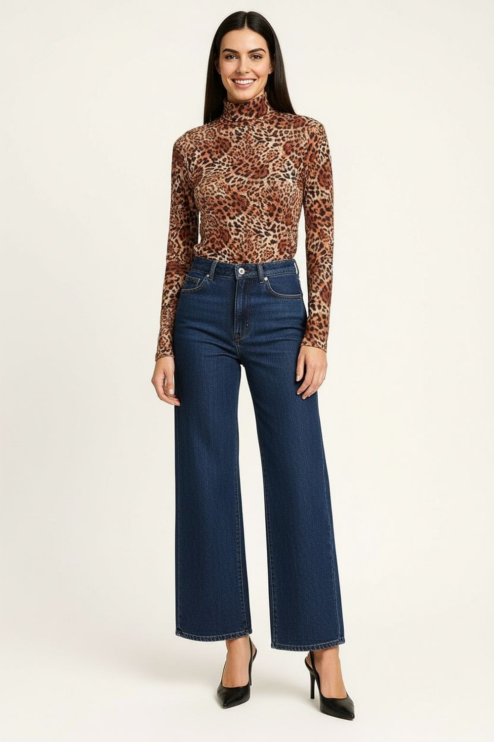 Pantalón largo de silueta acampanada, confeccionado en tejido tipo crepe de tacto suave, pretina lisa con ajuste cómodo, caída fluida que estiliza la forma y permite libertad de movimiento