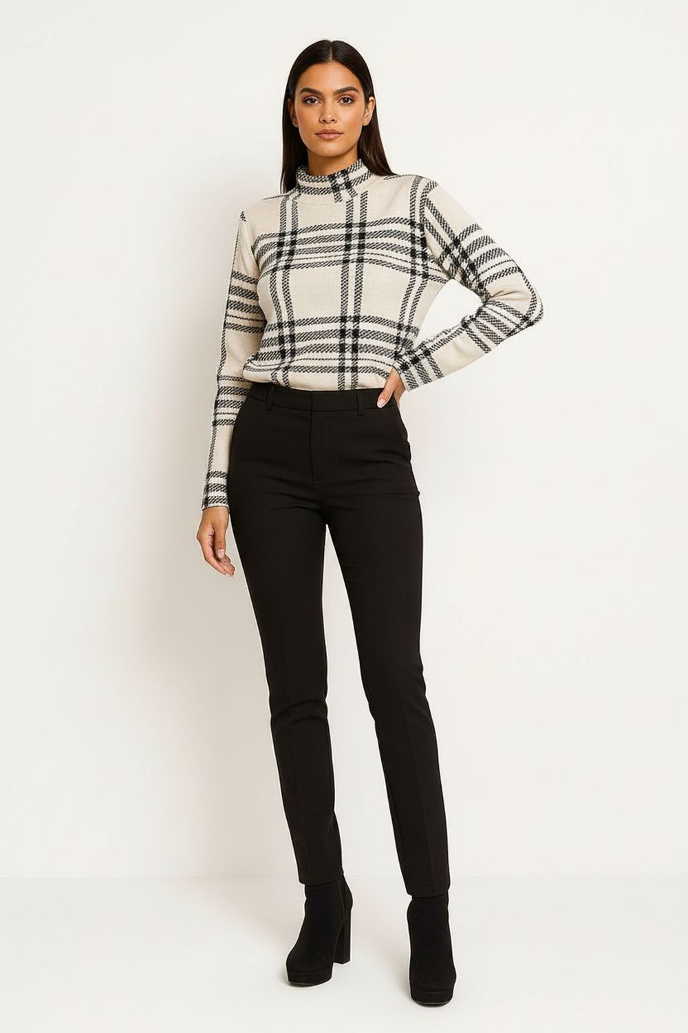 Playera de manga larga con cuello alto, confeccionada en tejido de punto suave que ofrece comodidad durante todo el día, diseño de cuadros amplios que añaden estilo contemporáneo, acabado limpio en puños y dobladillo