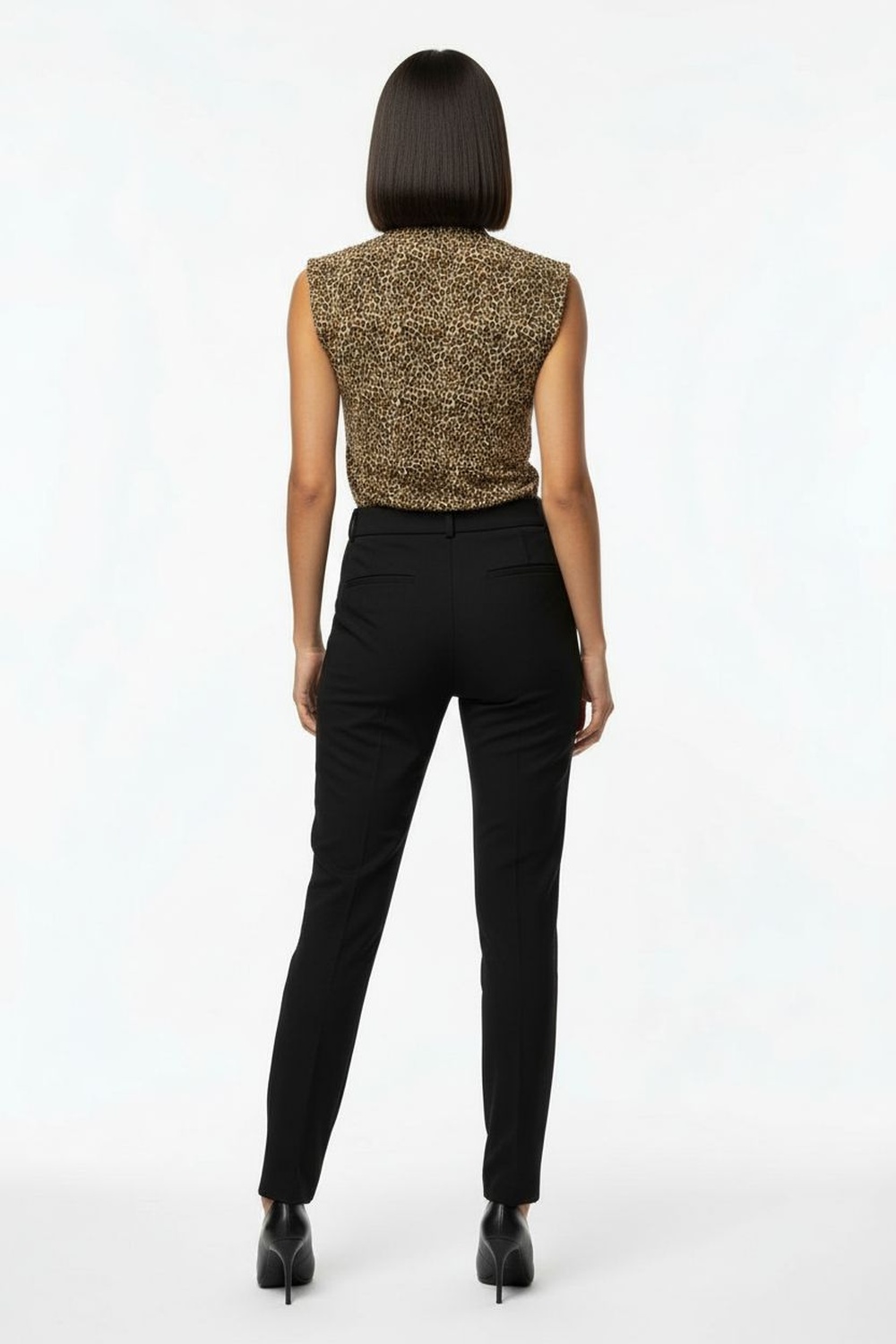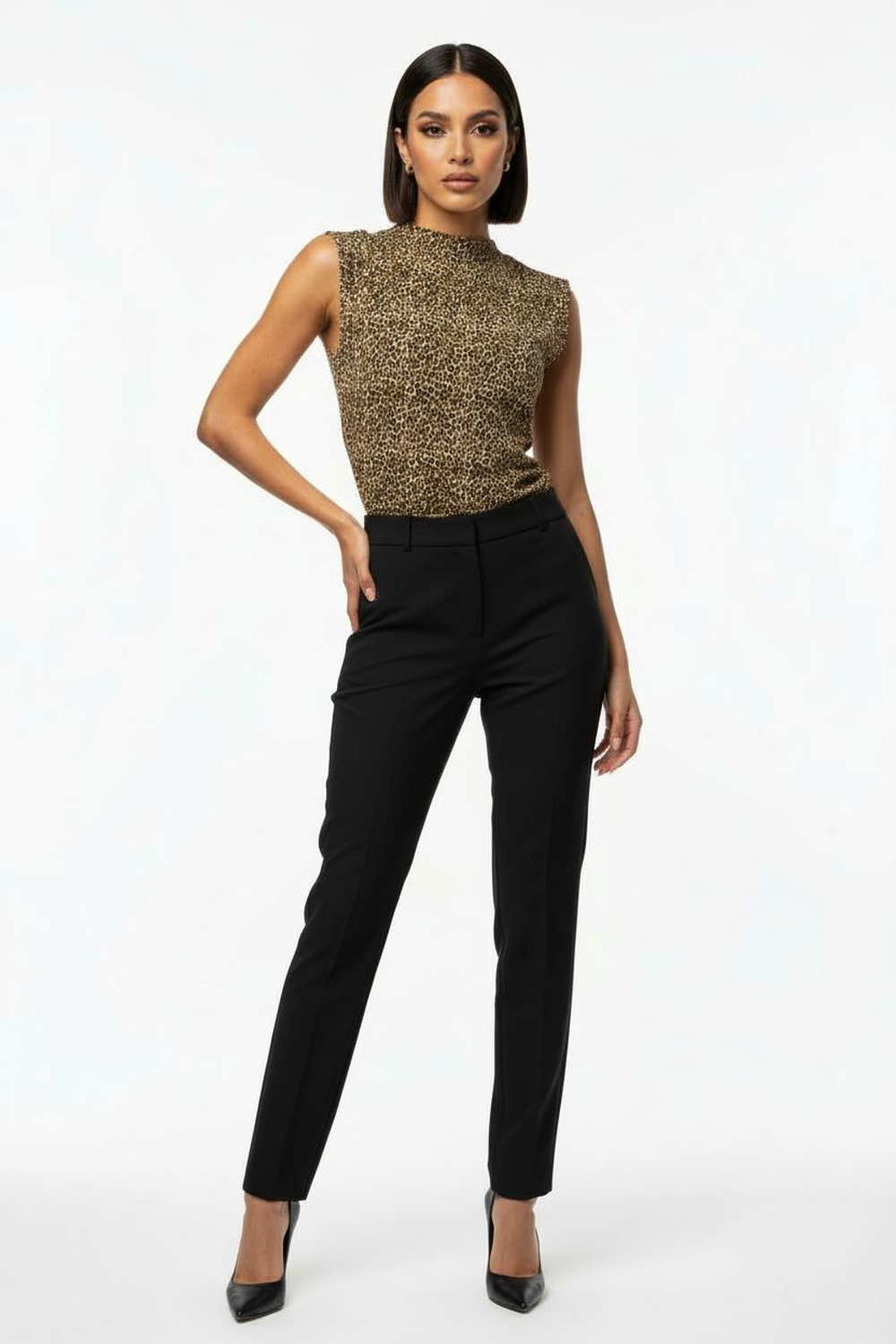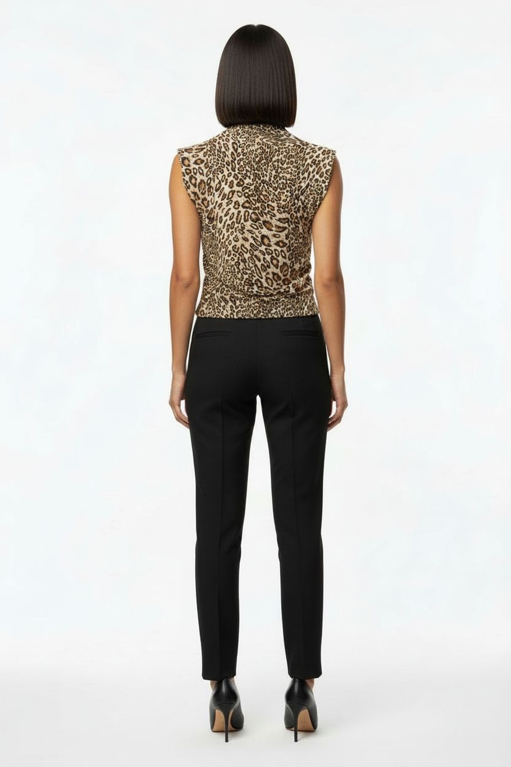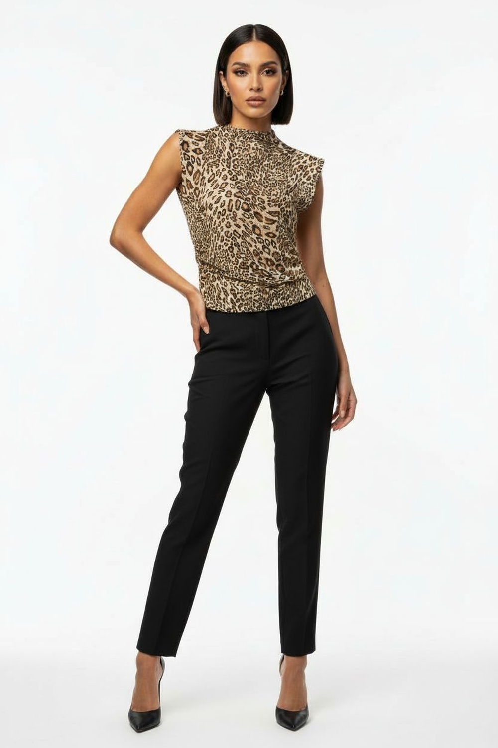Playera sin mangas con cuello alto y detalle plisado al frente, ajuste cómodo que estiliza la figura, tela ligera con caída natural, terminados suaves para mayor confort