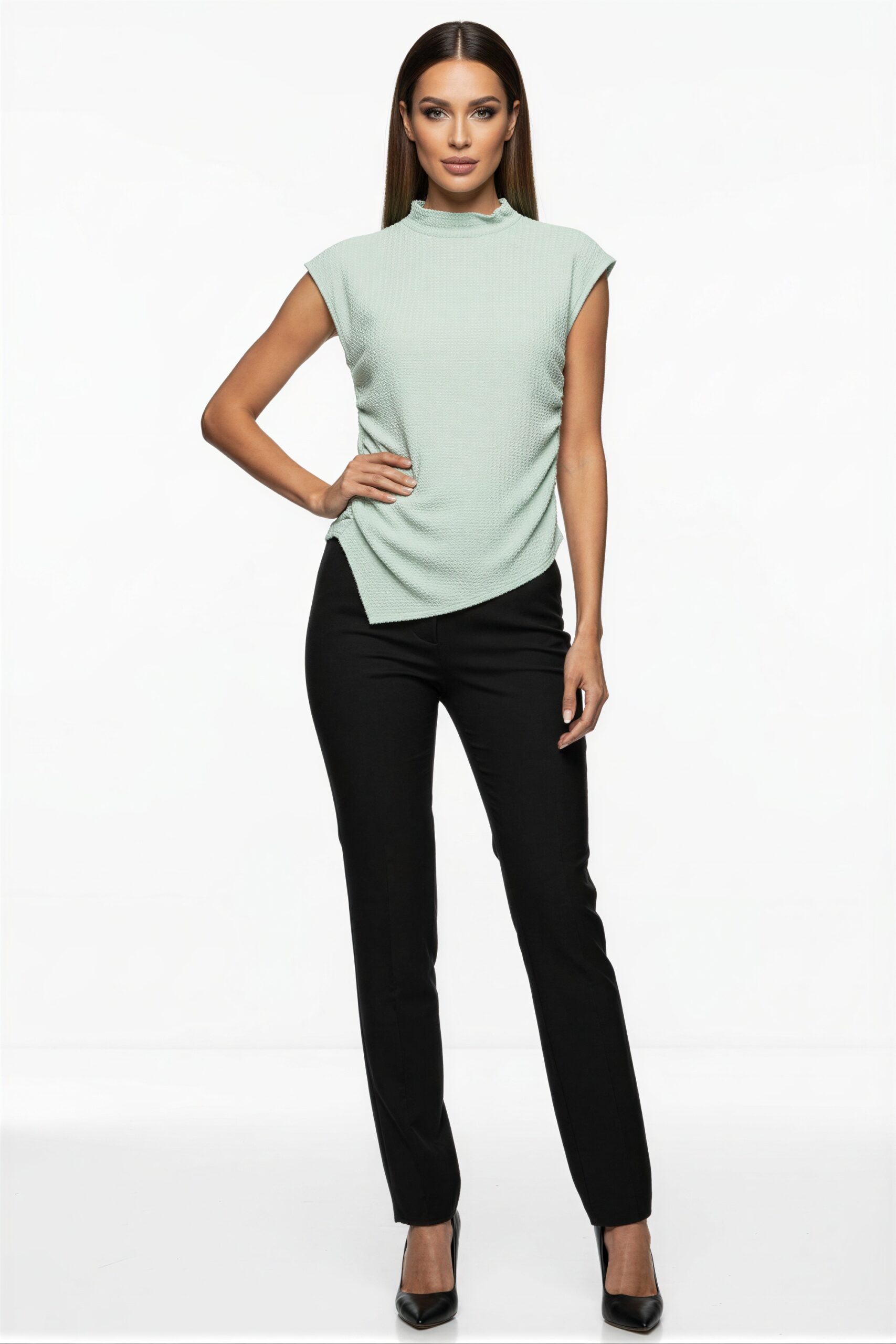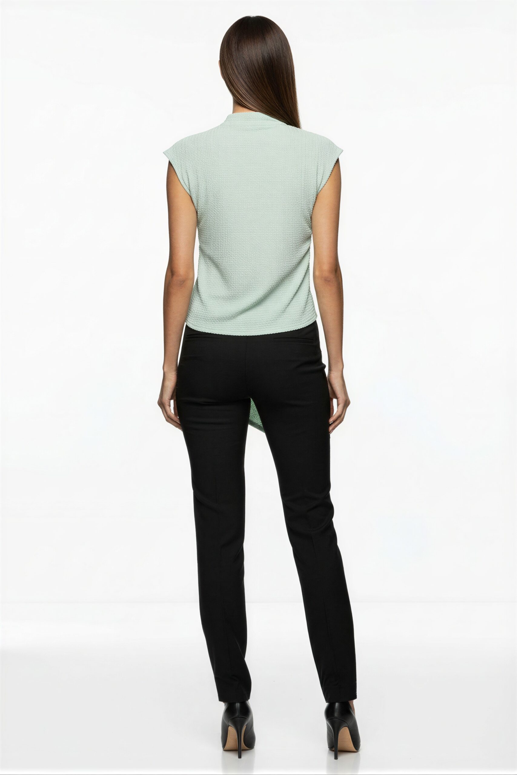 Blusa sin manga con cuello alto y lazo ajustable al frente que aporta detalle elegante, corte recto con caída fluida que estiliza la figura, pinzas sutiles que mejoran el ajuste en busto, abertura frontal discreta y acabado limpio en dobladillo, confección en tejido ligero de textura suave al tacto