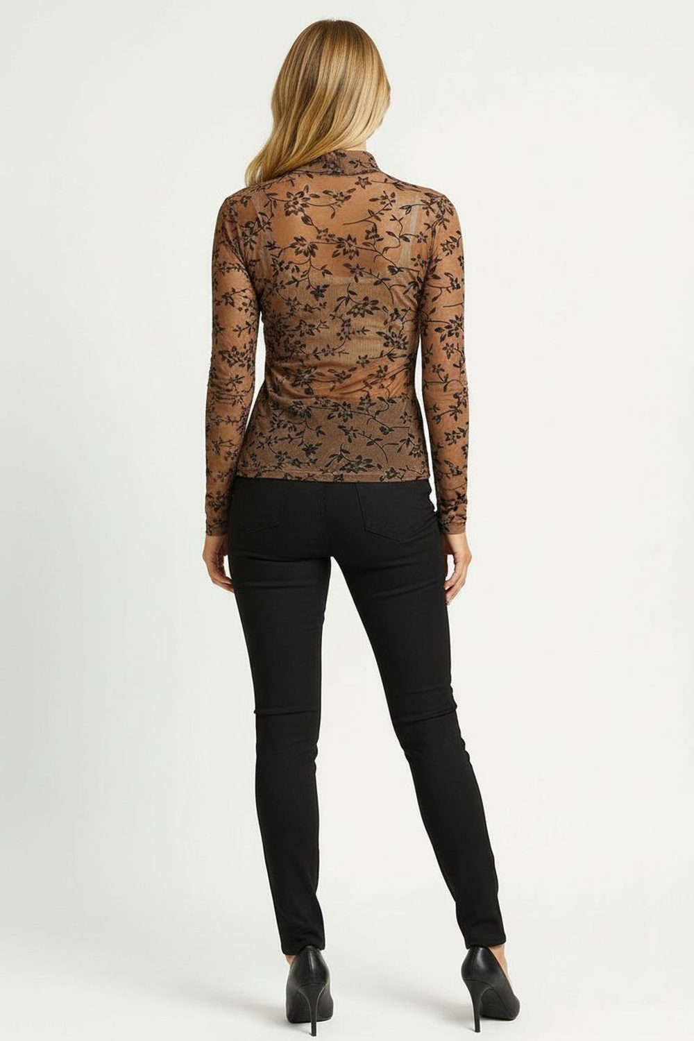 Playera de manga larga con cuello alto que aporta un estilo sofisticado y moderno, confección en malla ligera con acabado aterciopelado que realza la textura, ajuste ceñido que estiliza la silueta y resalta la figura, terminación recta en bajo y mangas que brinda versatilidad para distintos looks, ideal para outfits de noche y combinaciones elegantes de temporada