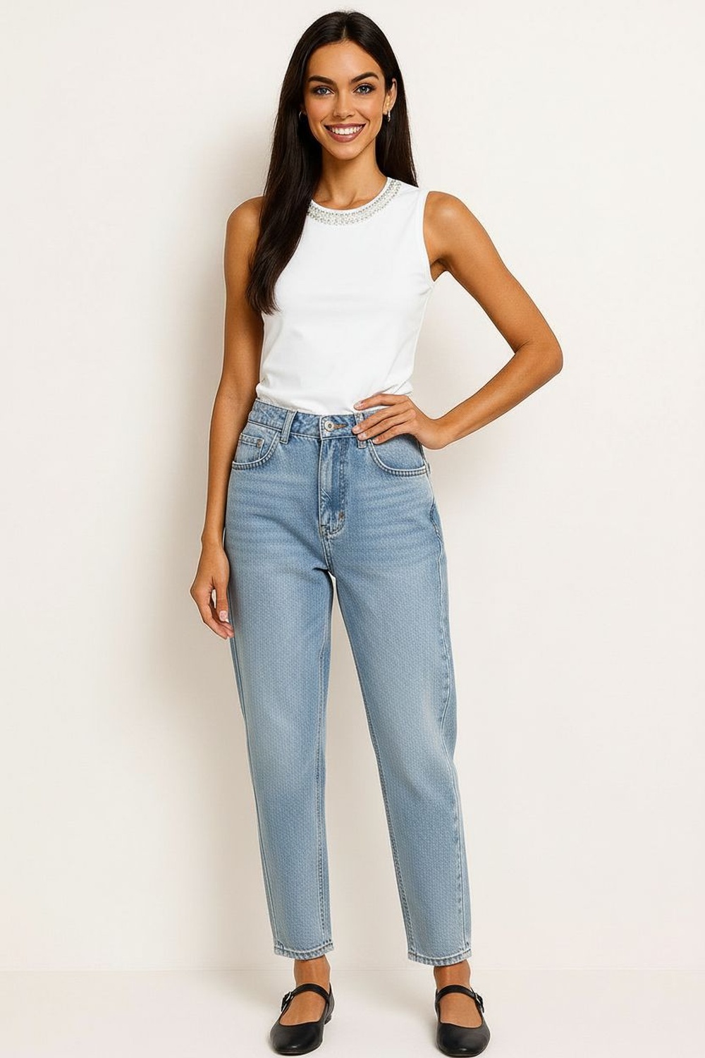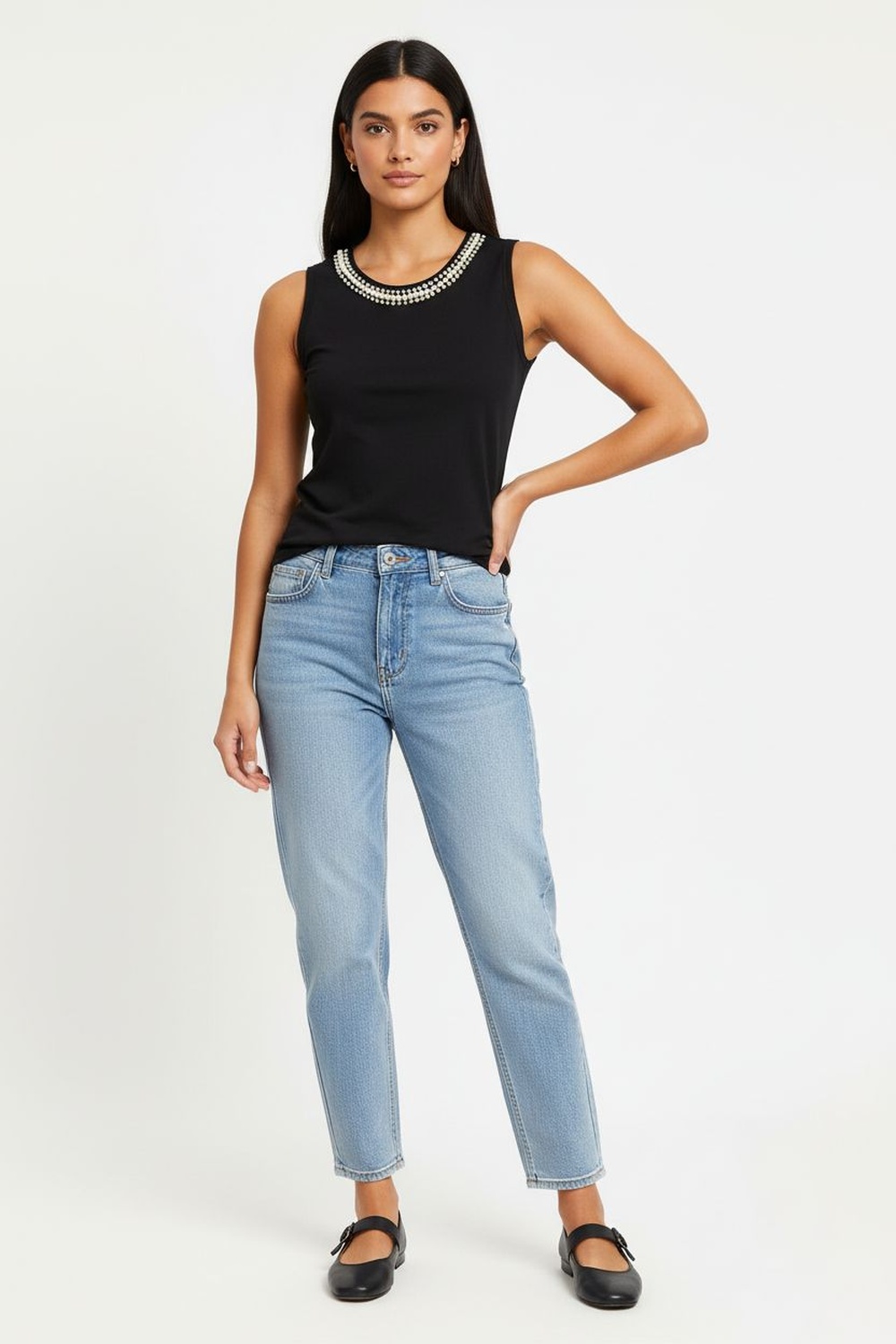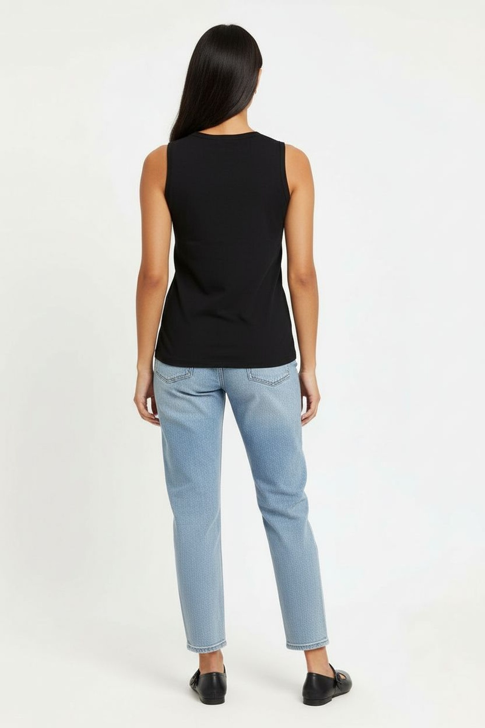 Playera sin mangas con cuello redondo y aplicación decorativa integrada, corte recto que brinda comodidad, largo a la cadera que facilita el uso diario, confección en tejido suave con caída natural, terminados prolijos que conservan la forma