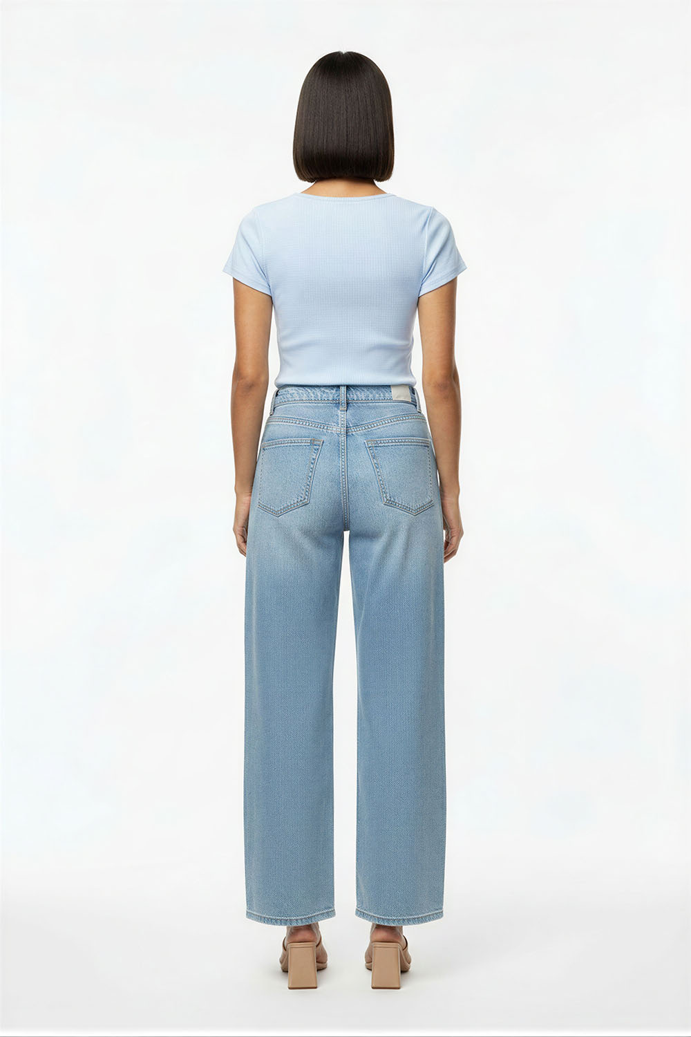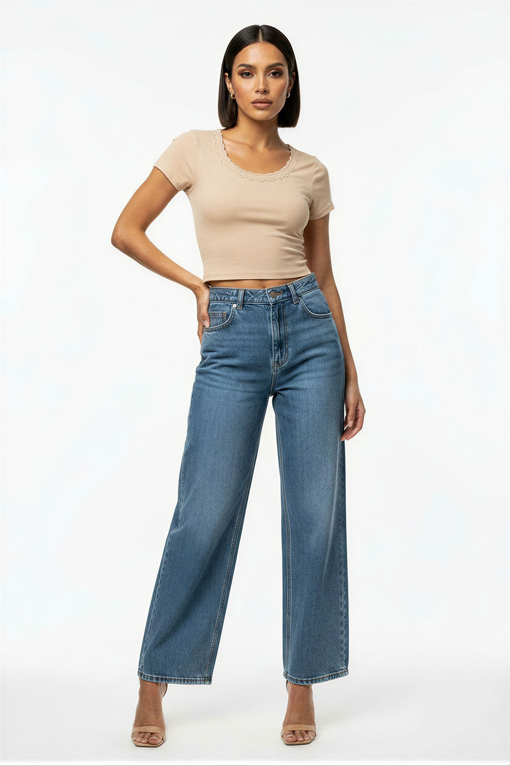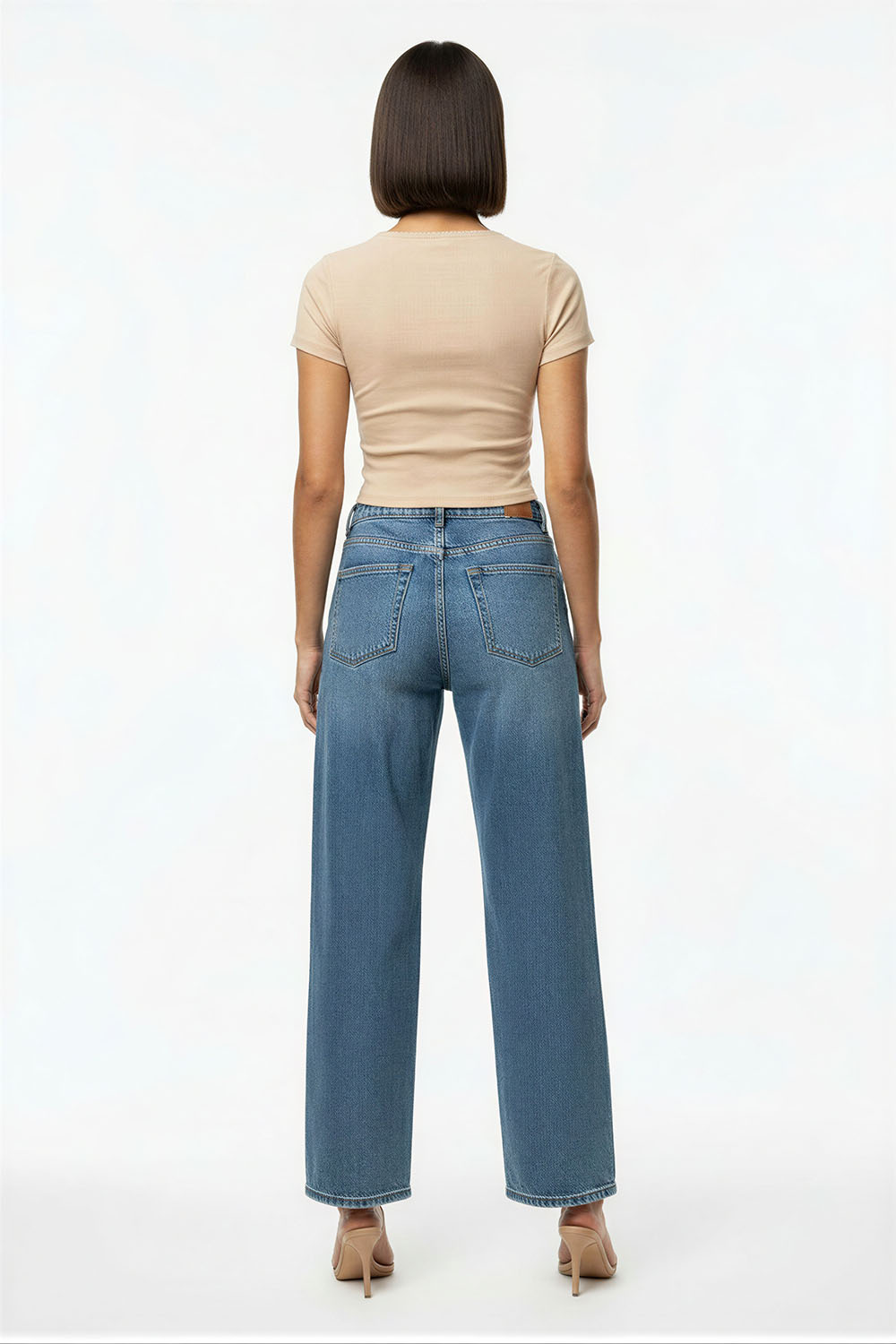 Jeans de mezclilla rígida con tiro alto que brinda soporte y define la cintura, corte recto que estiliza la pierna, diseño de cinco bolsas funcionales que aportan practicidad, cierre frontal con botón metálico que asegura ajuste firme, confección resistente que mantiene su forma con el uso continuo