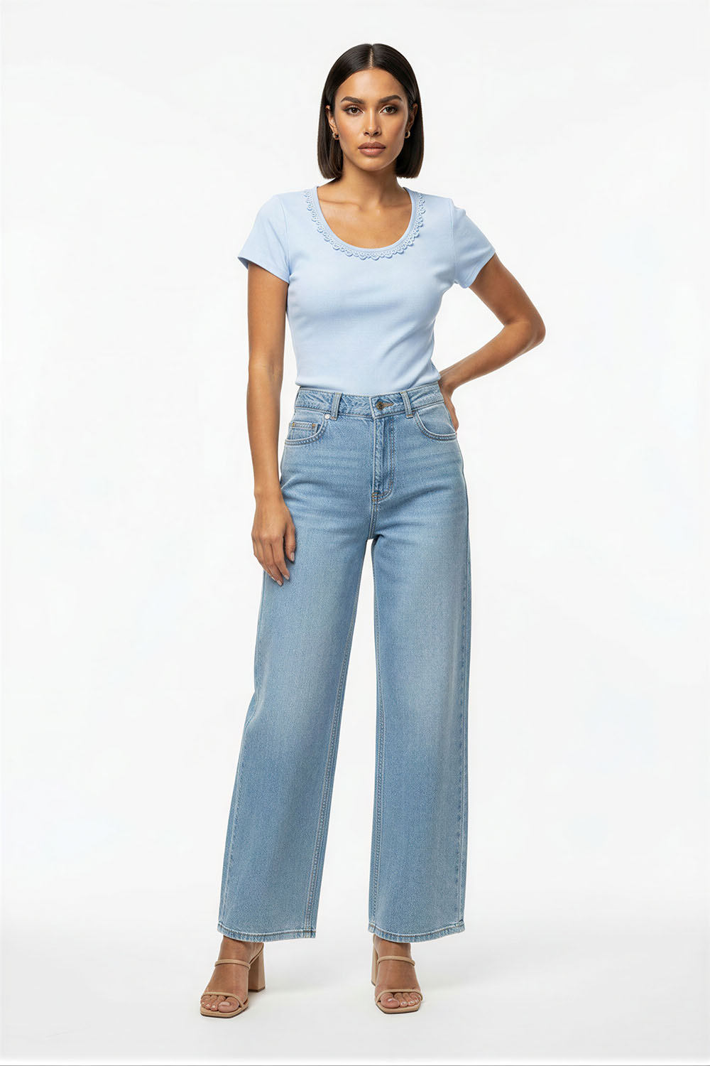 Playera de corte recto con ajuste cómodo al cuerpo, cuello redondo con detalle decorativo que aporta acabado delicado, manga corta que brinda frescura, confección en tejido ligero con textura suave, diseño práctico para uso diario