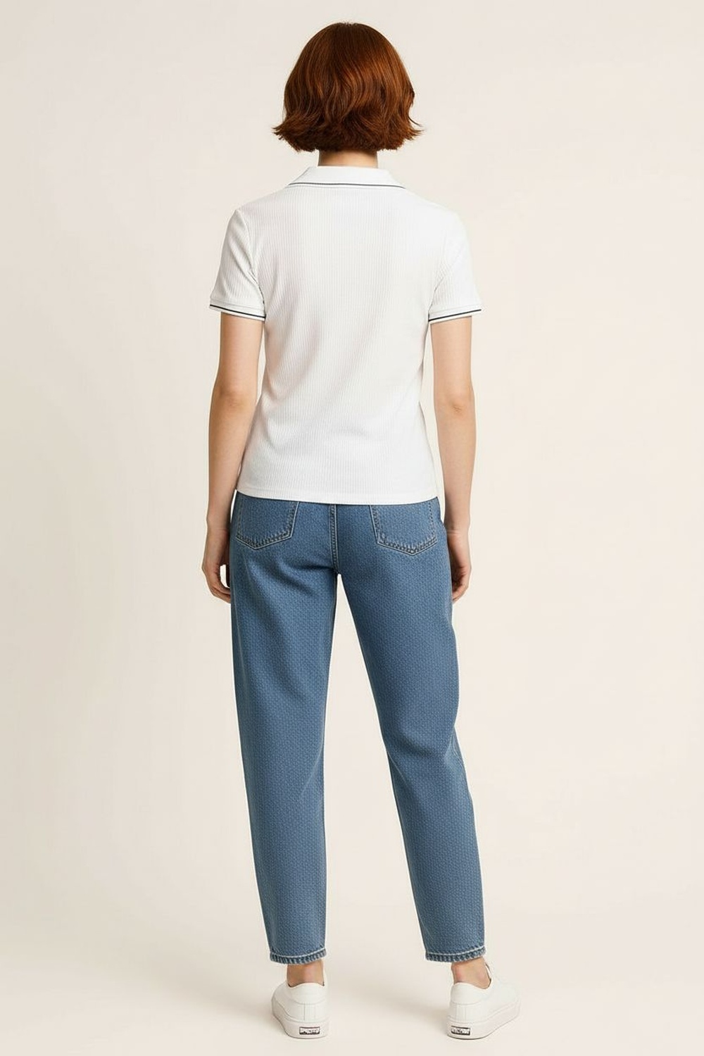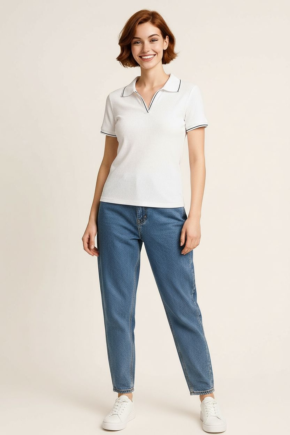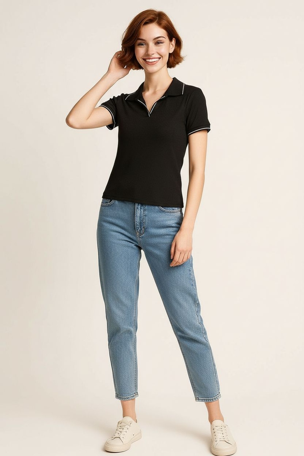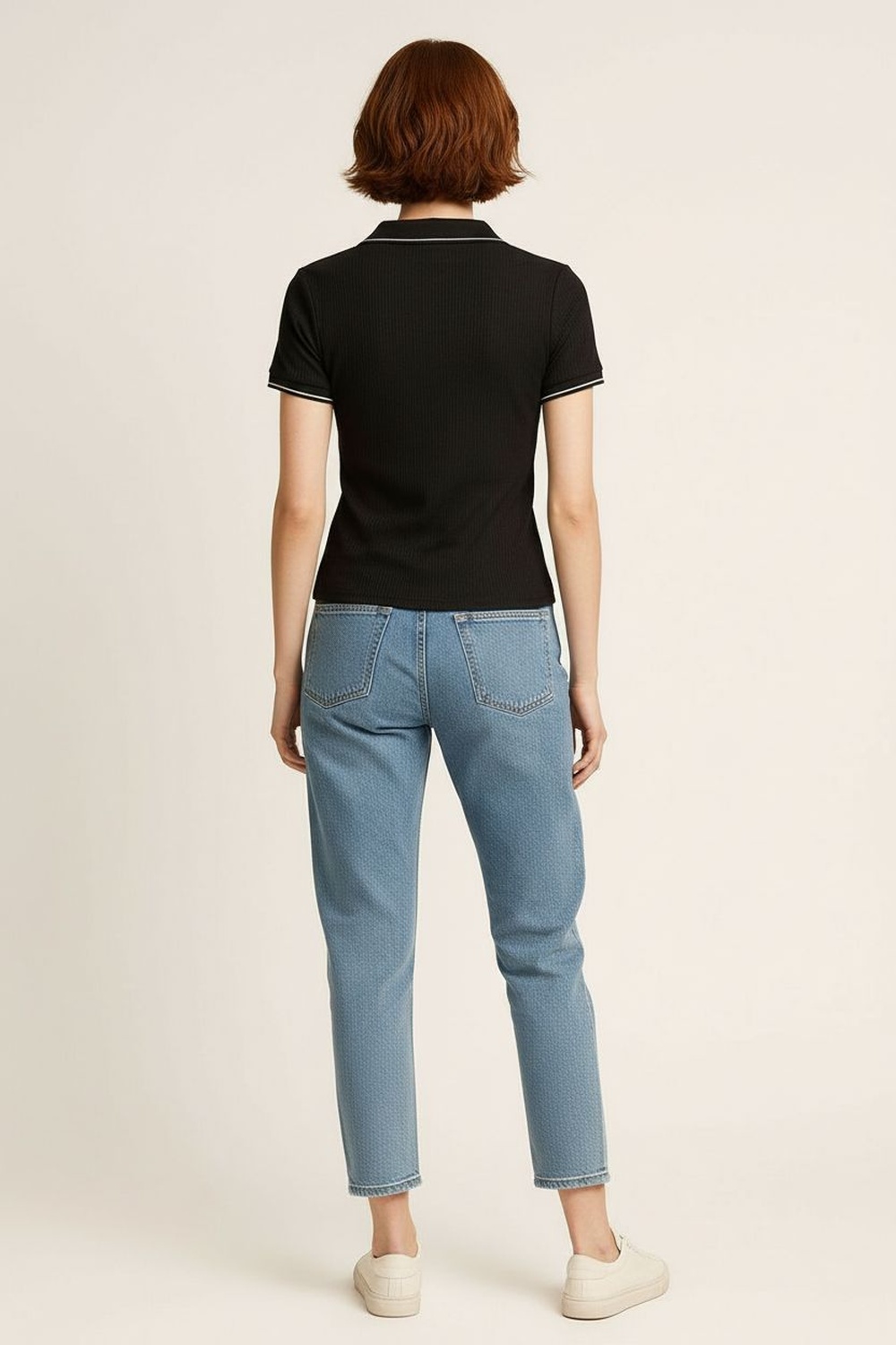 Playera de manga corta con cuello tipo polo y apertura frontal discreta, corte recto que se adapta al torso sin ceñir, confección en tejido acanalado que aporta elasticidad y comodidad, terminación recta en bajo y mangas con acabado limpio que mantiene la estructura de la prenda