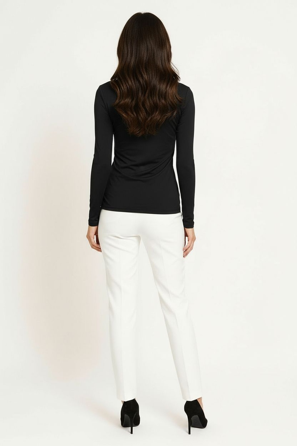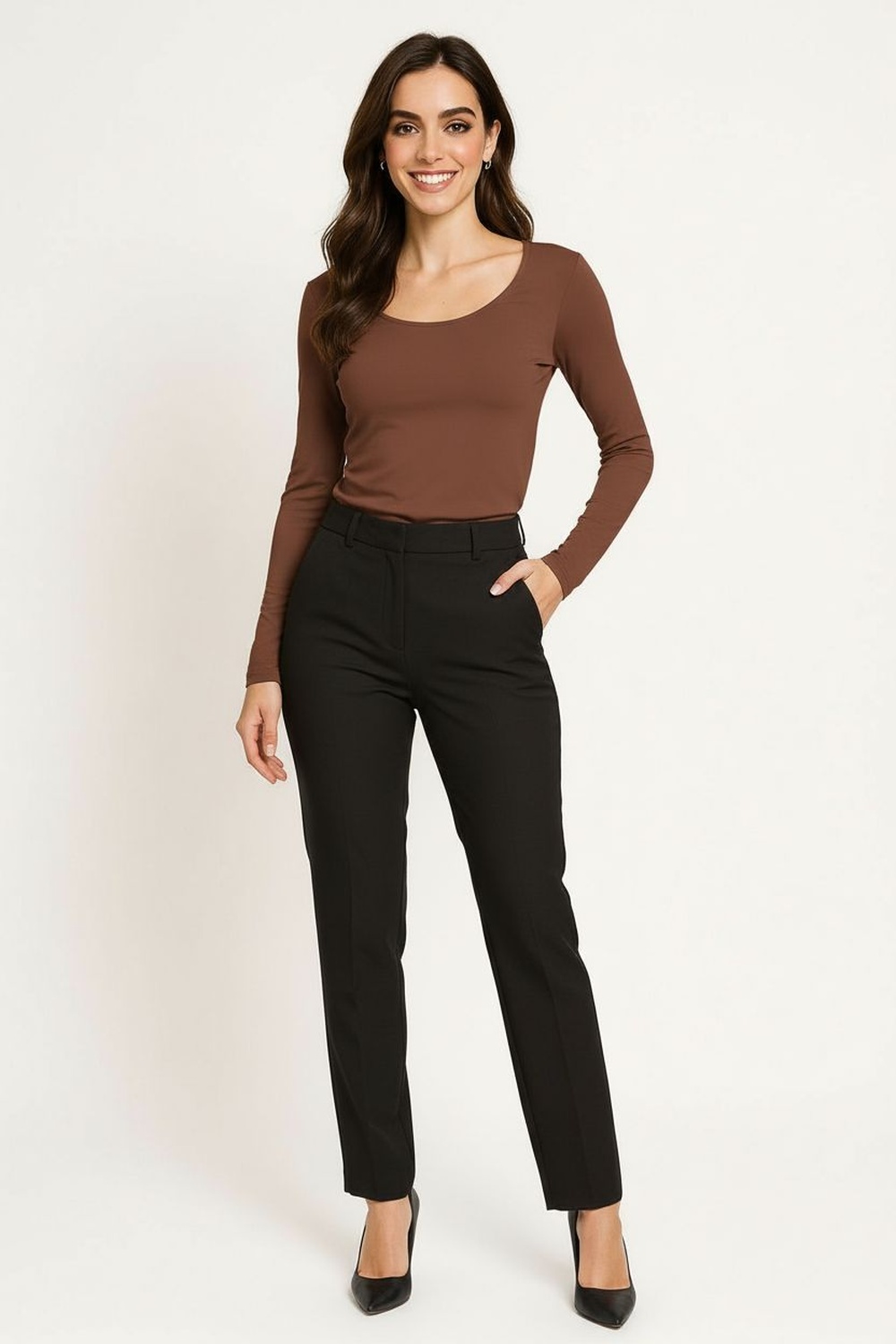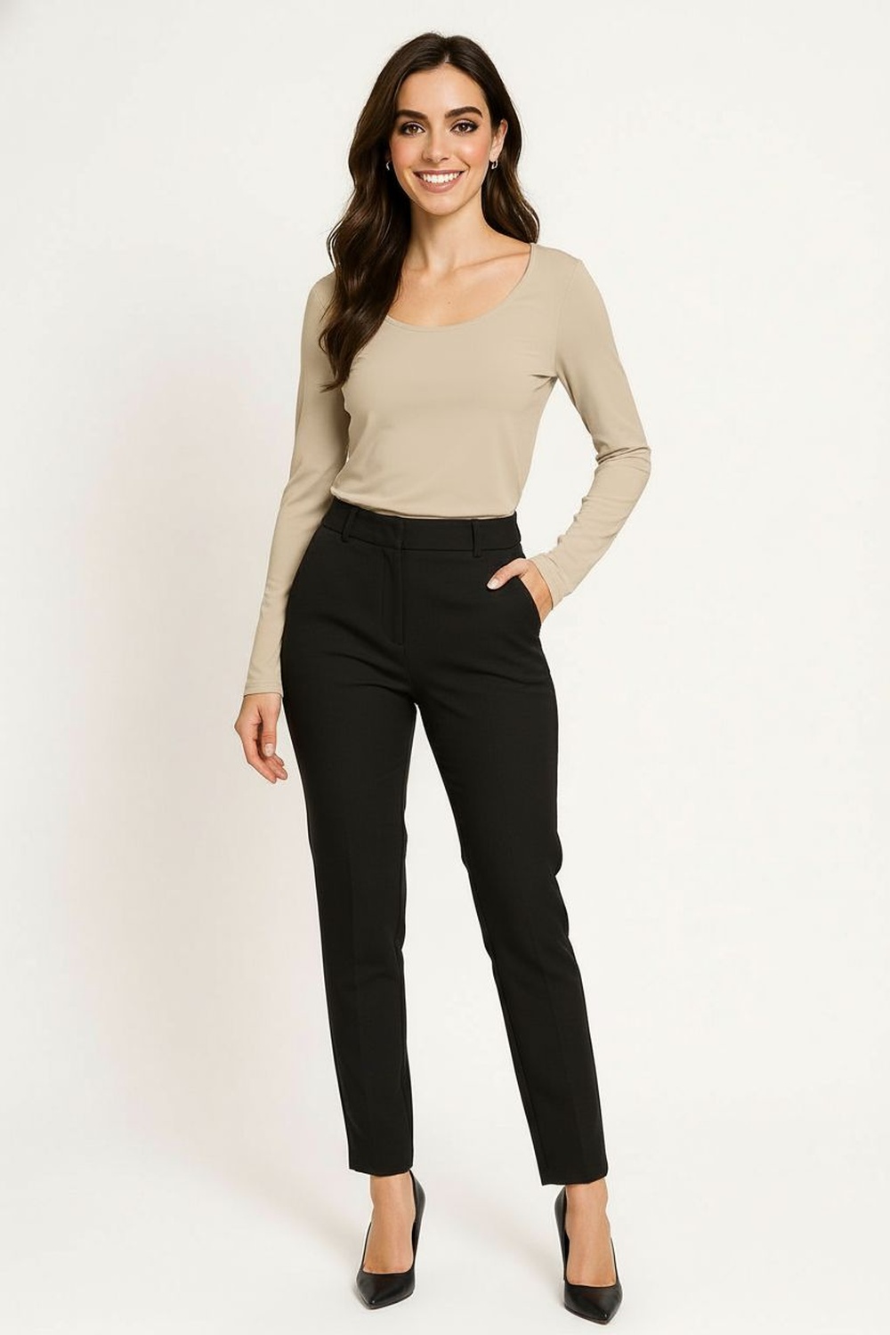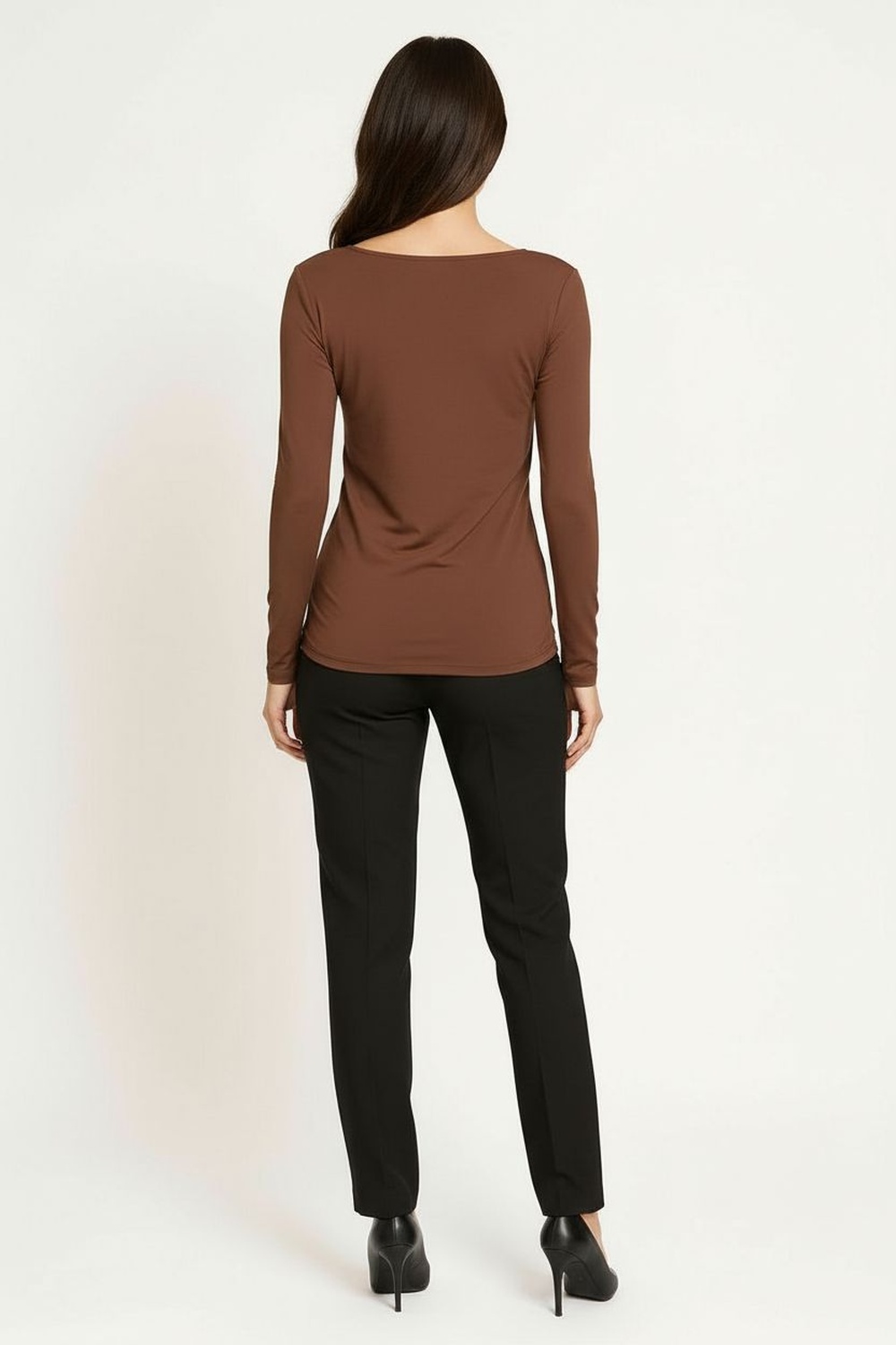 Playera de manga larga con cuello redondo amplio, doble tela que aporta mayor firmeza y evita transparencias, corte clásico con caída recta, confección suave que mantiene la forma, terminación inferior recta que ofrece un acabado limpio