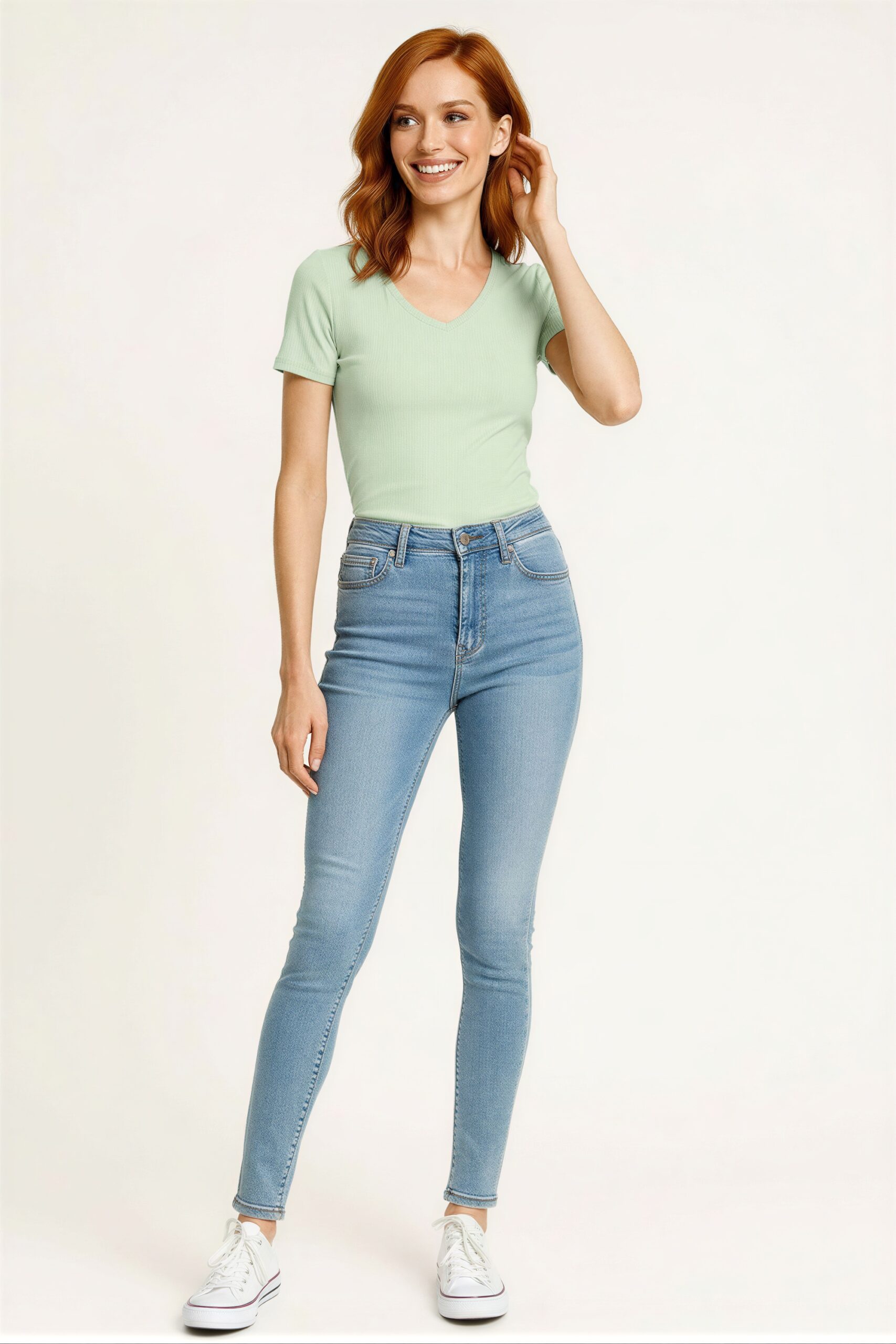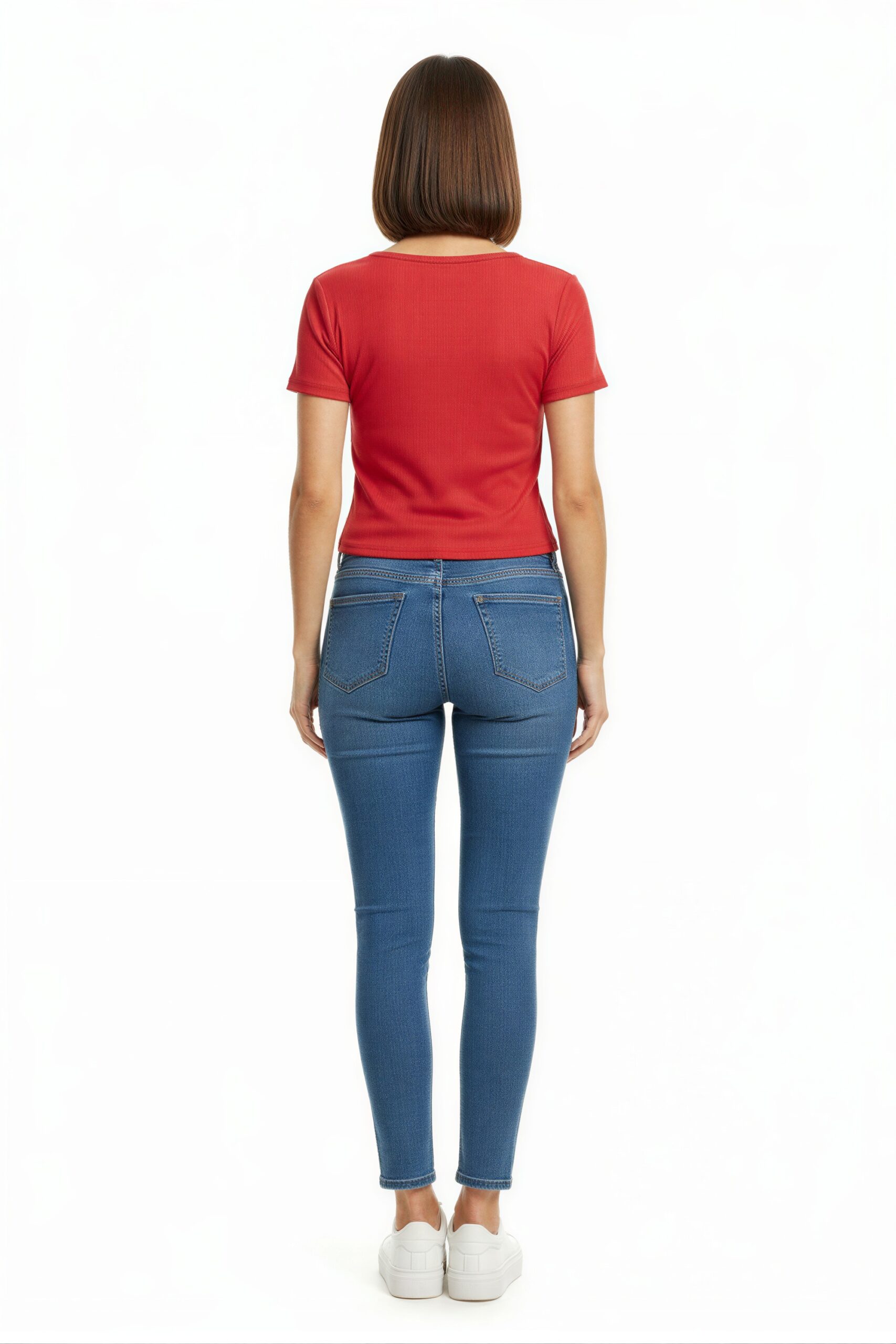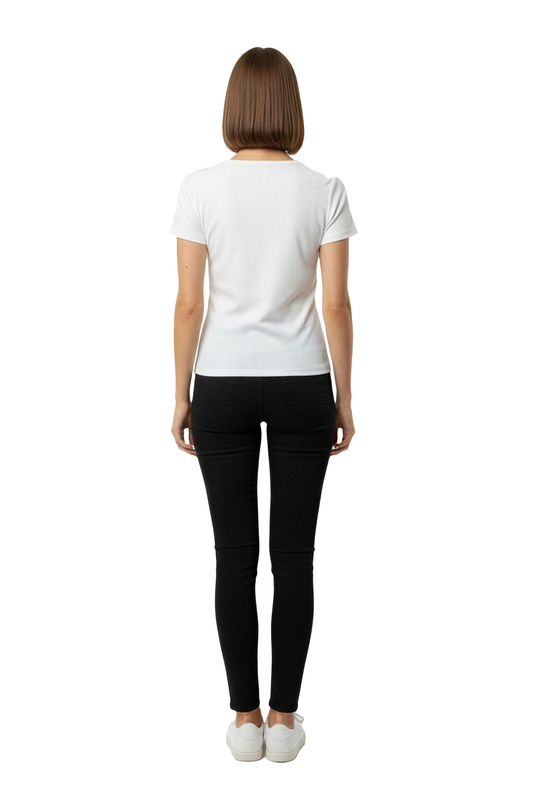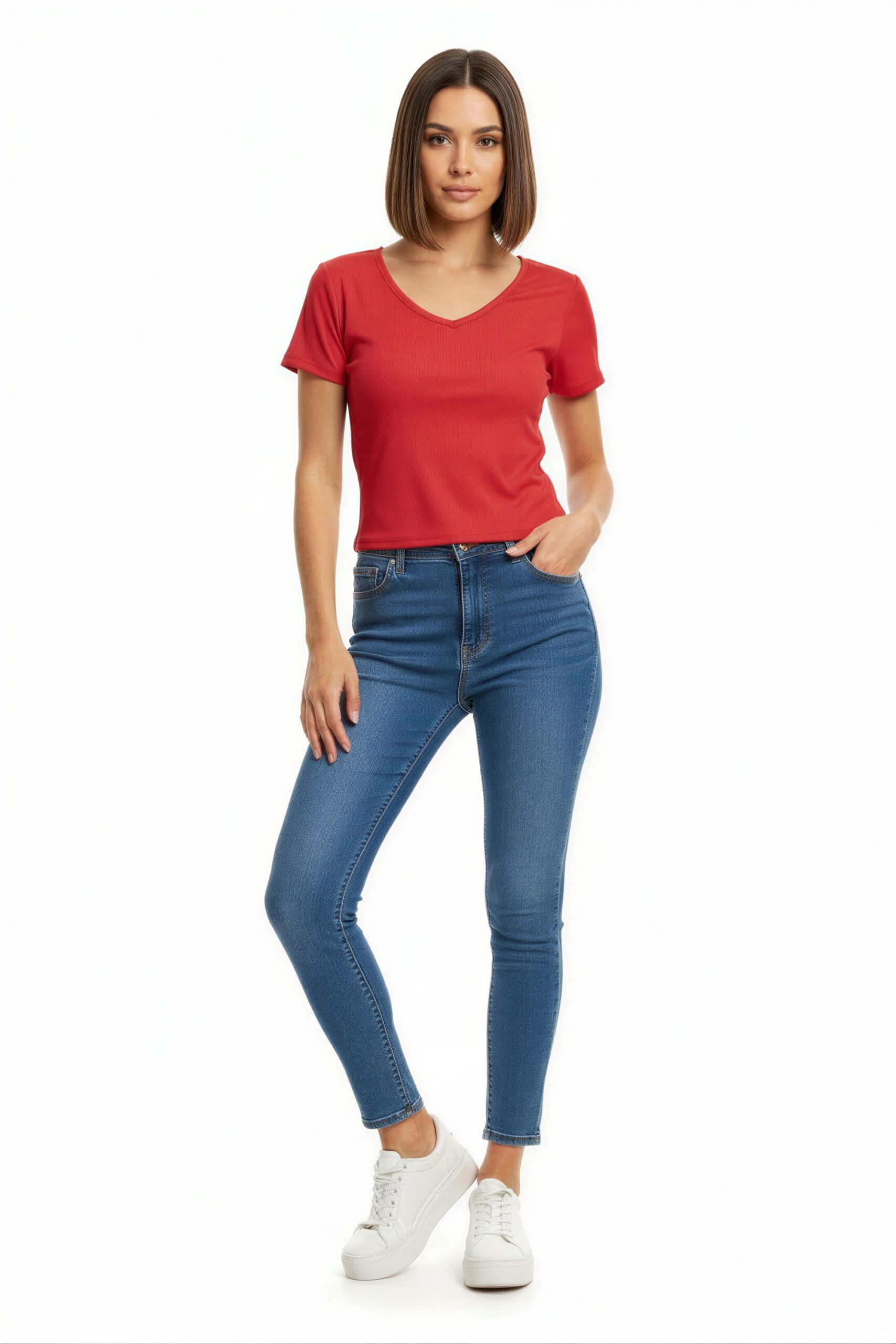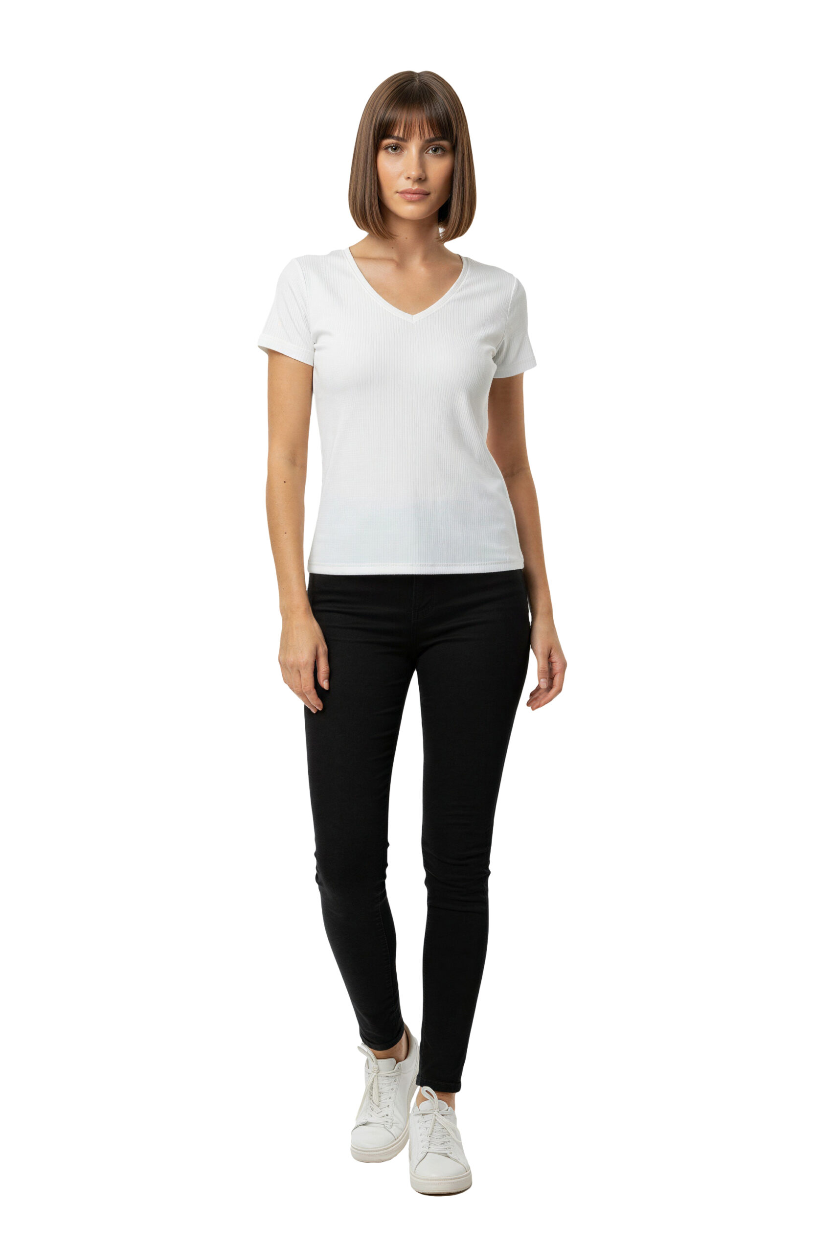 Playera de manga corta con escote en V, diseño liso de líneas limpias, corte recto que permite ajuste cómodo, prenda versátil para uso diario