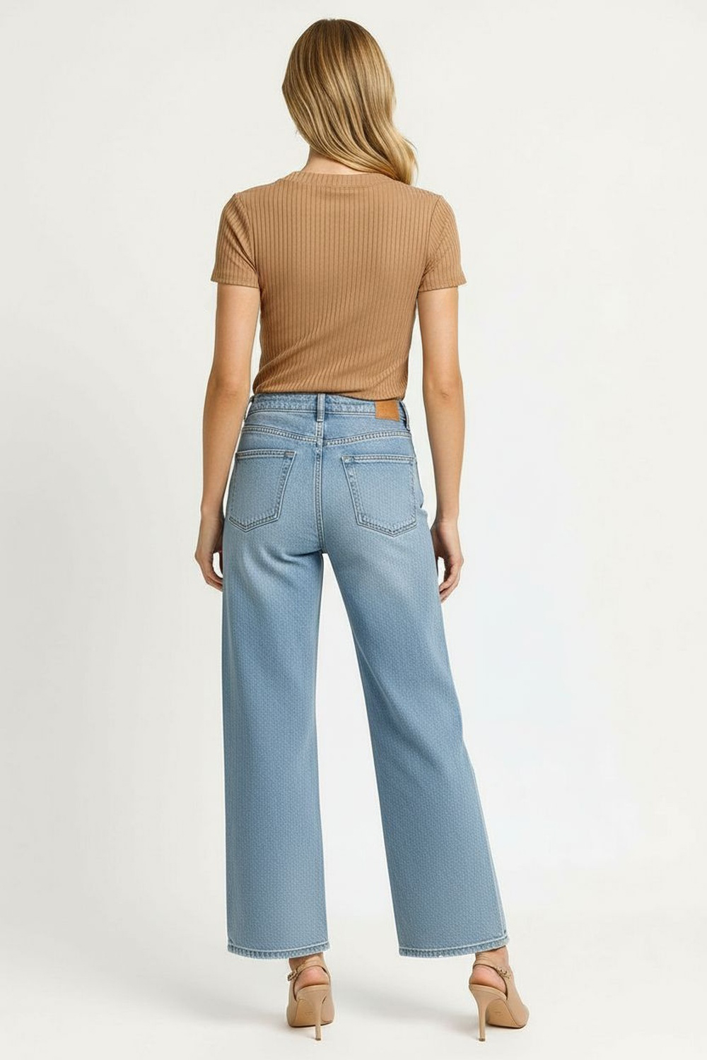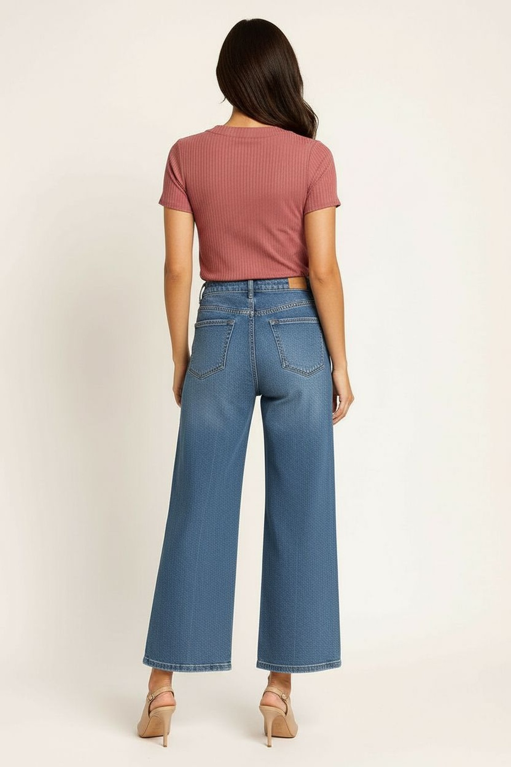 Pantalón de tiro alto con silueta acampanada que equilibra la figura, cintura estructurada con hebilla decorativa integrada que aporta firmeza, largo completo que estiliza la línea de la pierna, confección en tejido con elasticidad moderada para mayor confort, terminación limpia en bajos