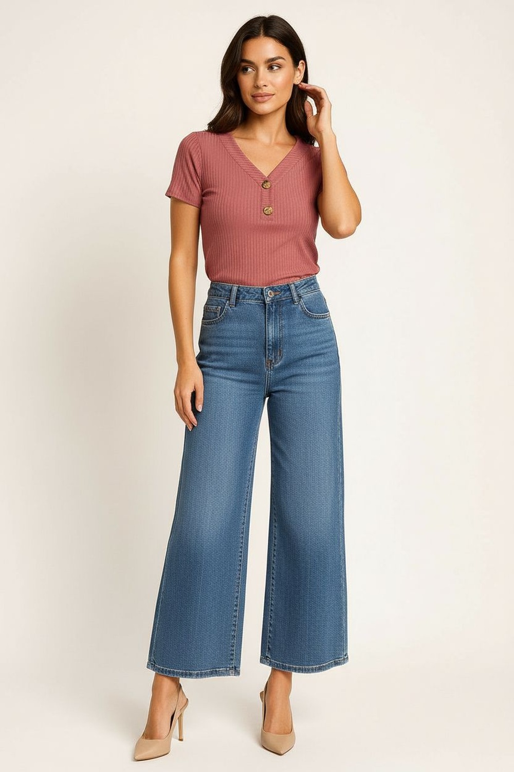 Playera de manga corta con escote en V que estiliza la parte superior, tapeta frontal con botones funcionales que aportan detalle práctico, confección en tejido acanalado de tacto suave, corte recto que brinda ajuste cómodo, terminaciones limpias que mantienen la forma