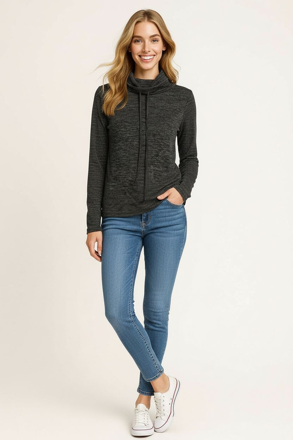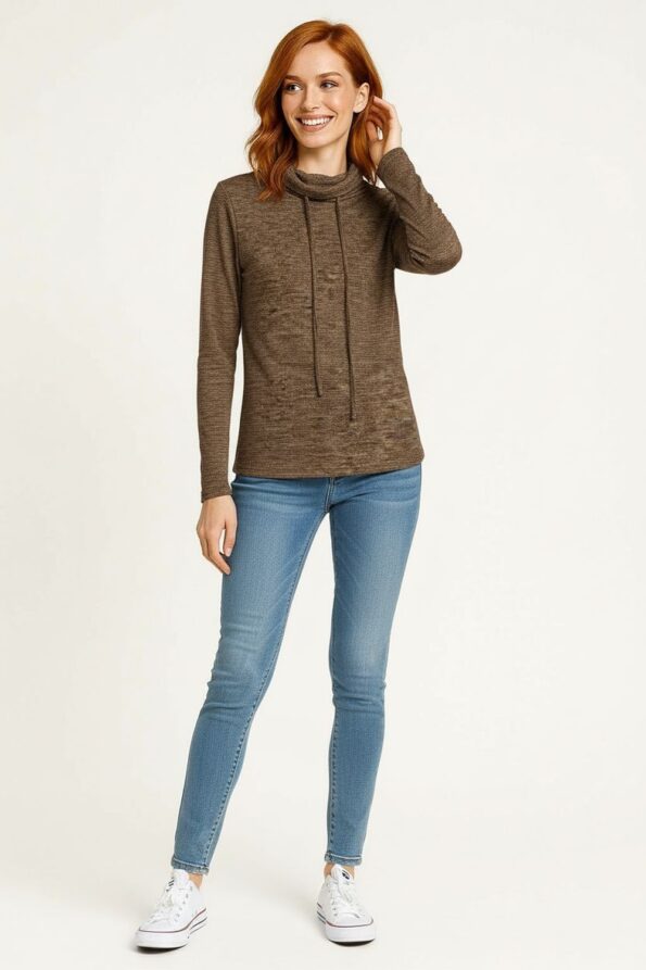 Playera de manga larga con cuello alto ajustable mediante jareta, confeccionada en tejido suave de textura ligera que aporta calidez y comodidad, corte recto que permite libertad de movimiento, terminado con costuras reforzadas que garantizan durabilidad y estructura definida, ideal para mantener un look moderno y funcional