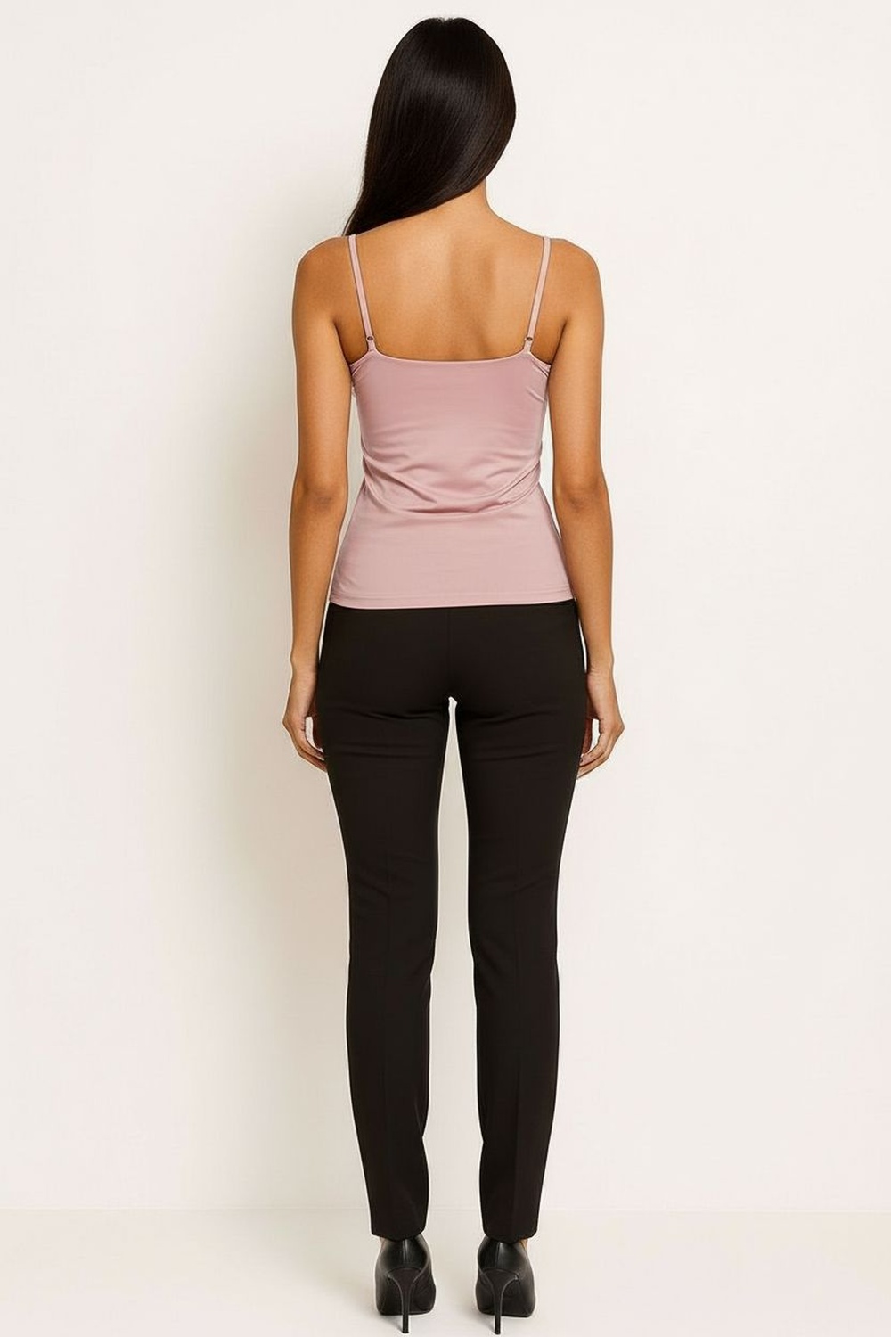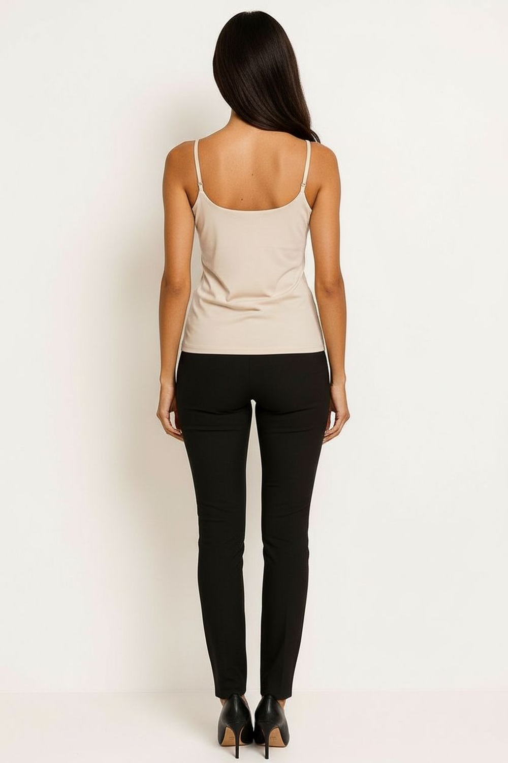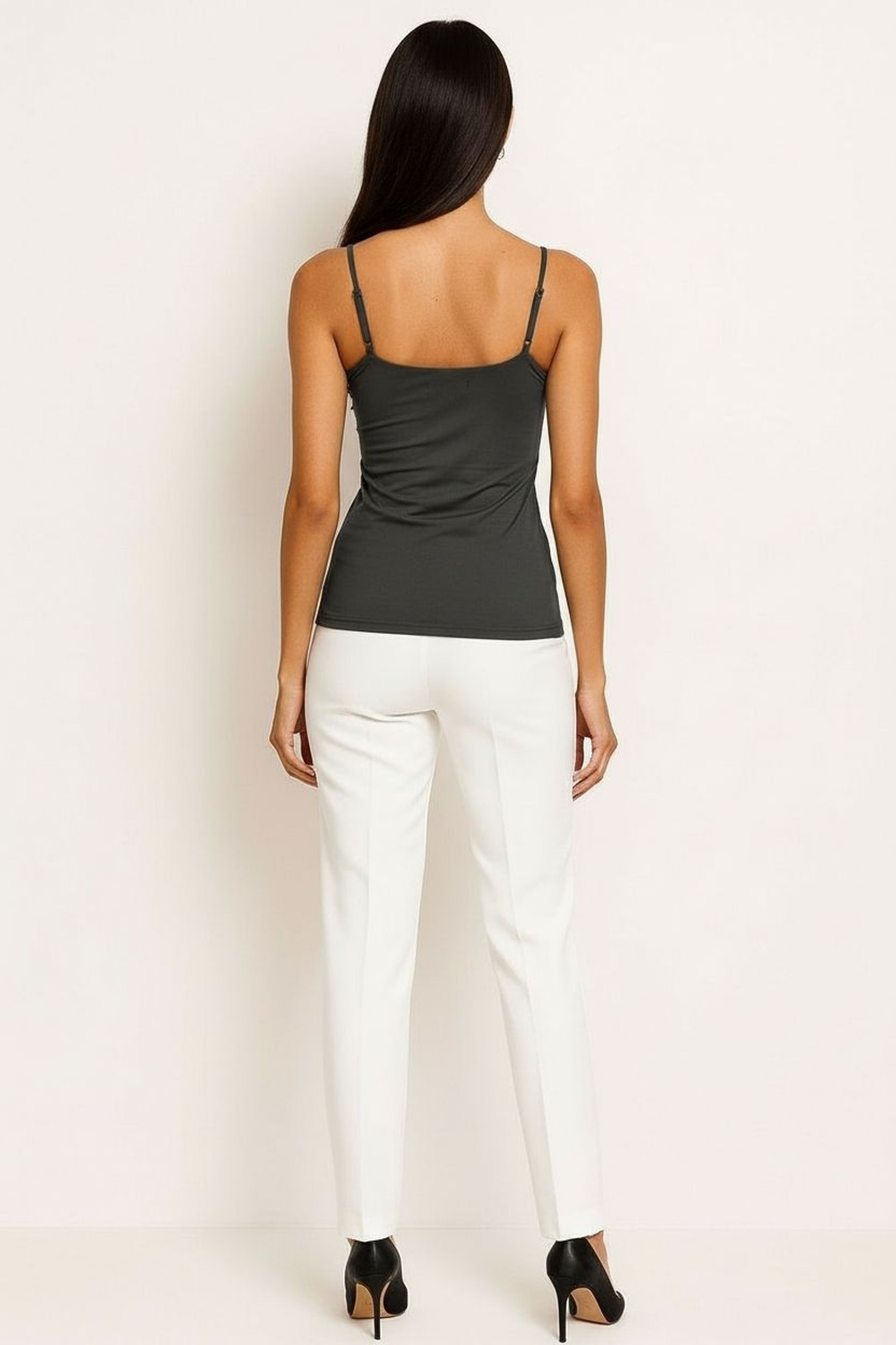 Playera de tirantes delgados, escote recto, ajuste al cuerpo, confección elástica, caída ligera, terminados suaves, ajuste cómodo