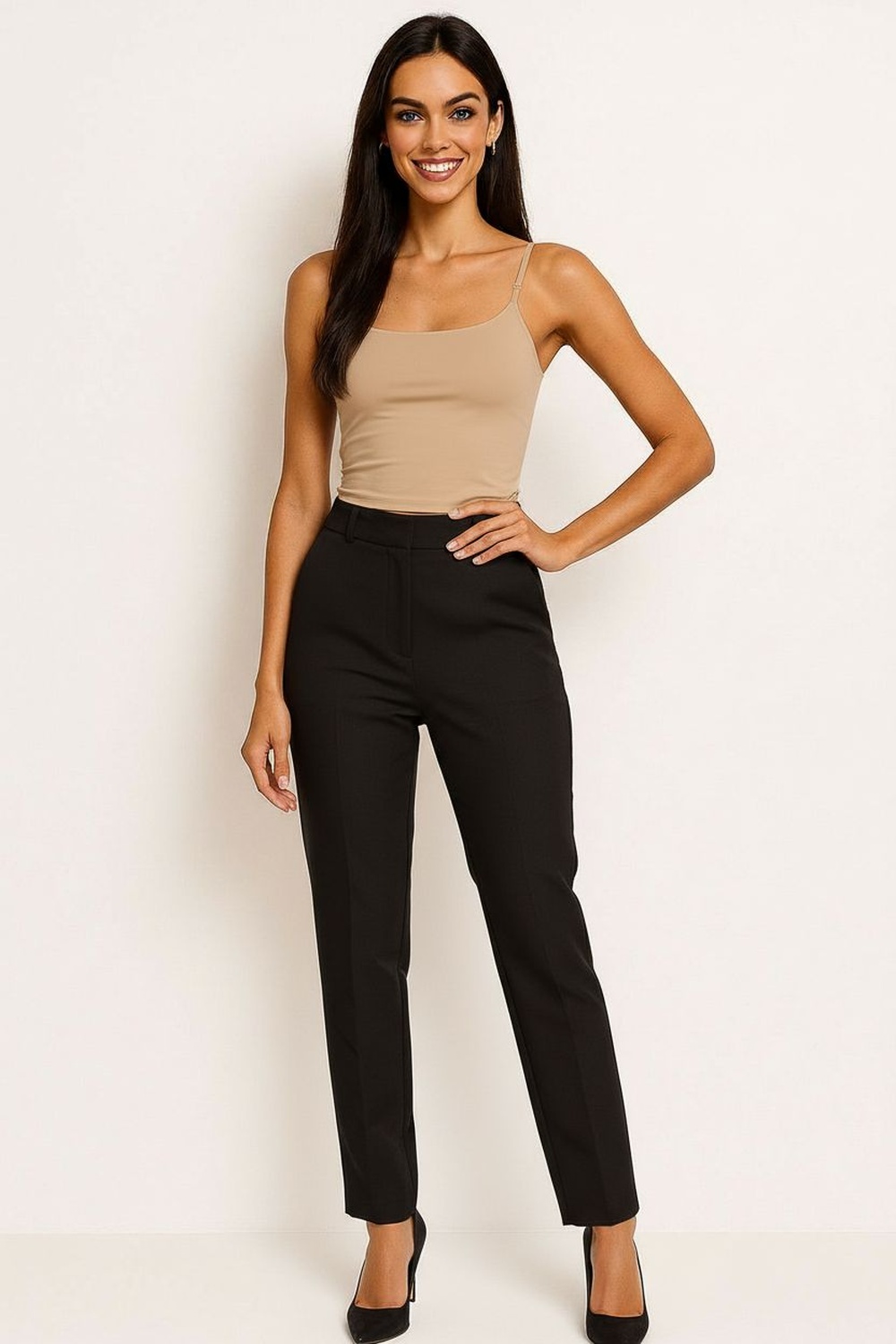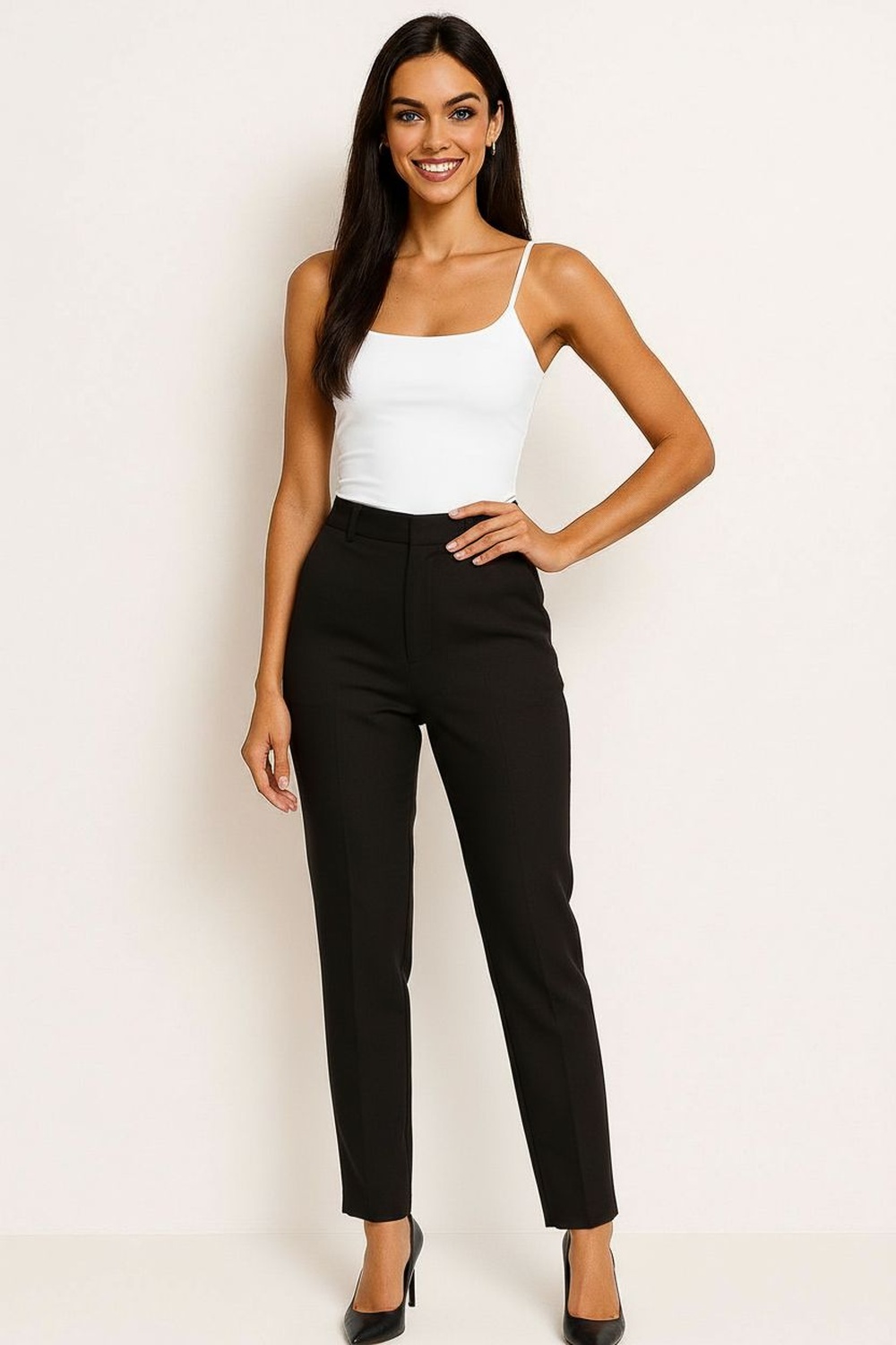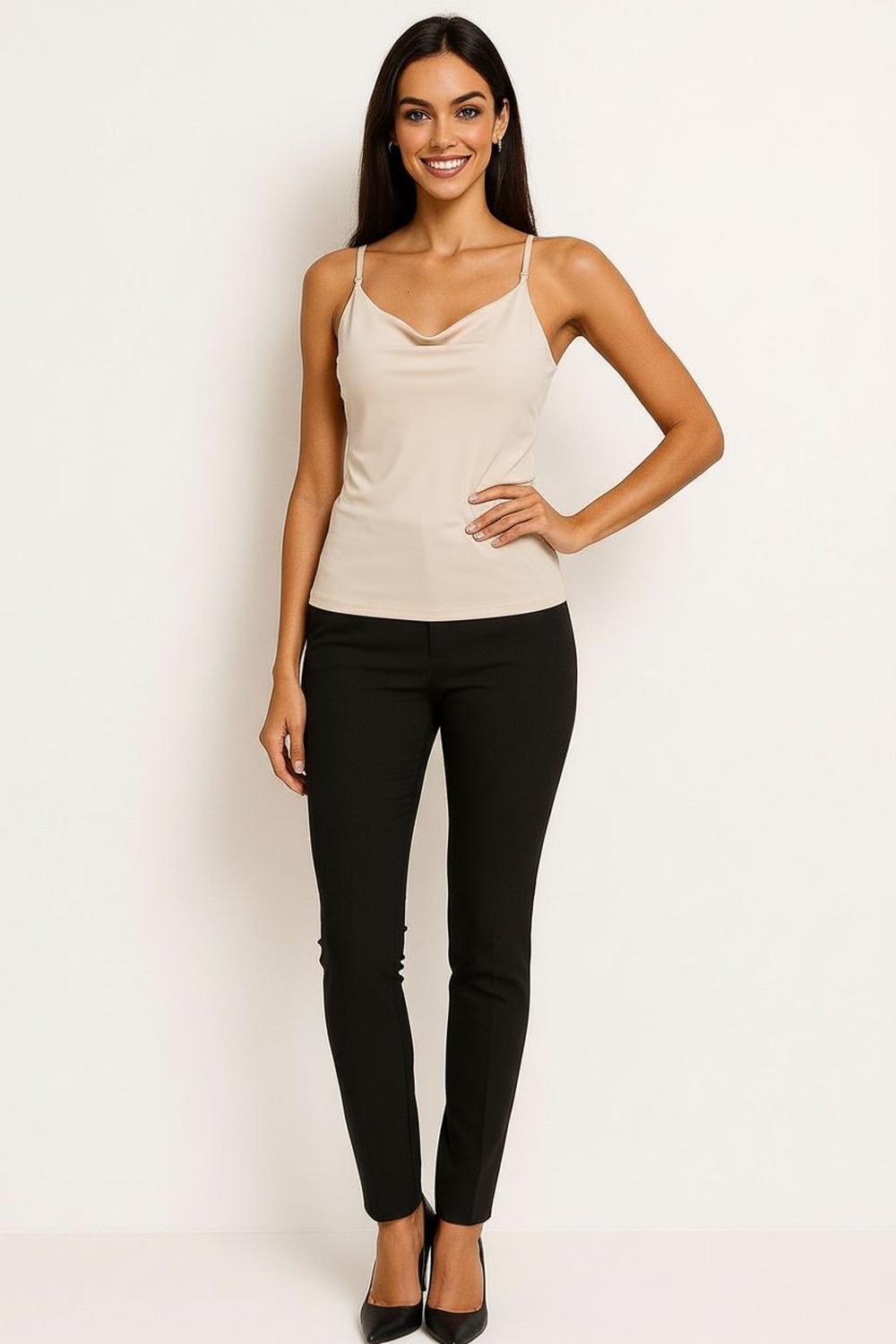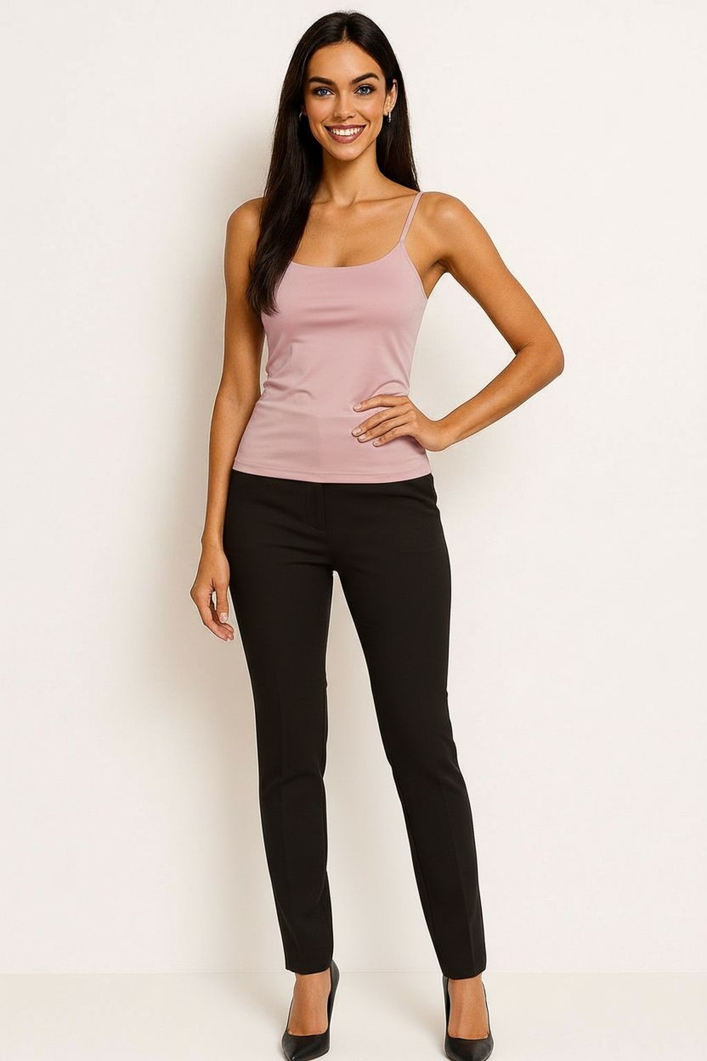Playera de tirantes delgados, escote recto, ajuste al cuerpo, confección elástica, caída ligera, terminados suaves, ajuste cómodo