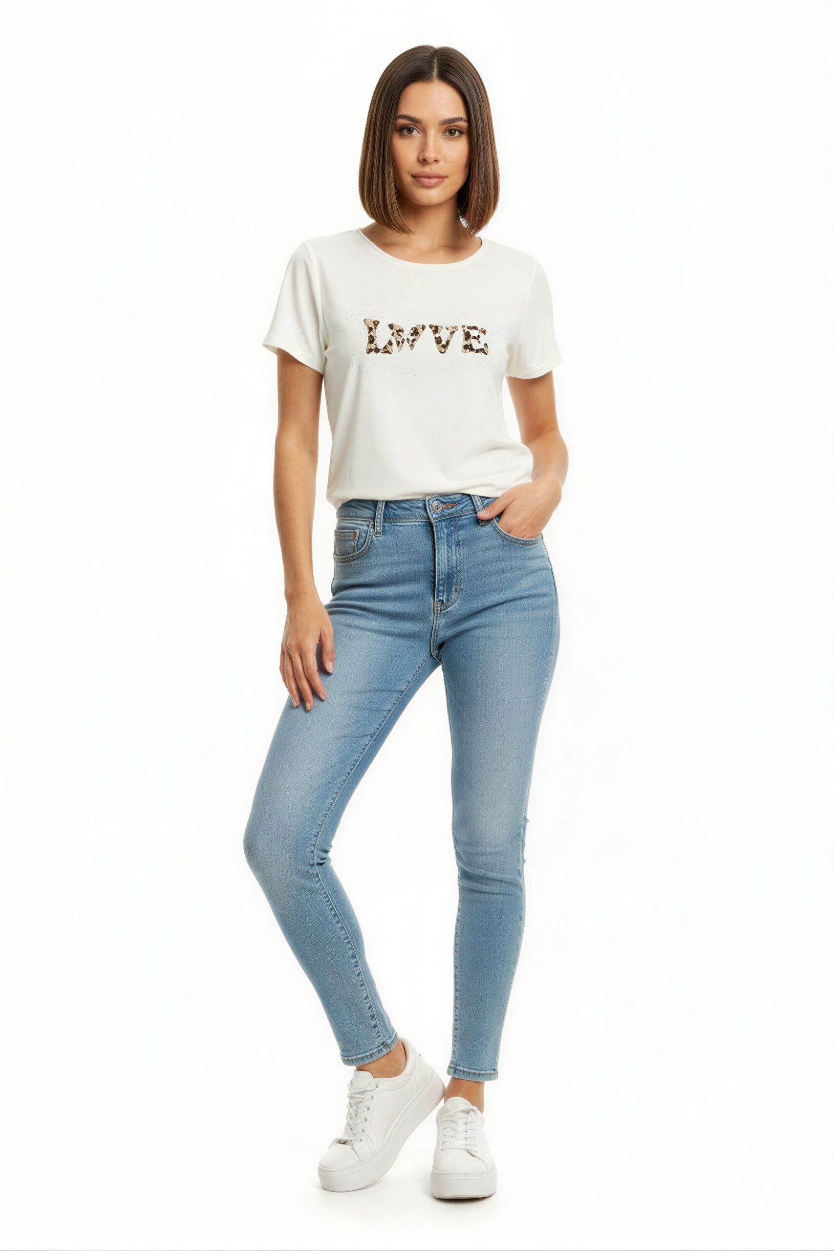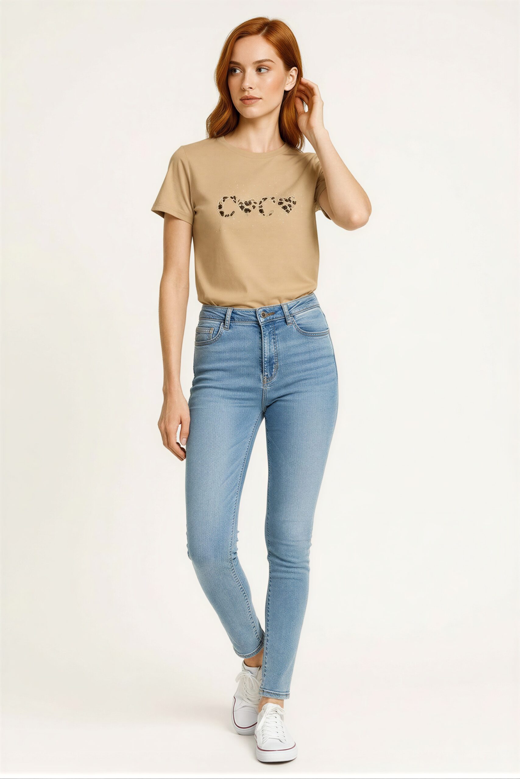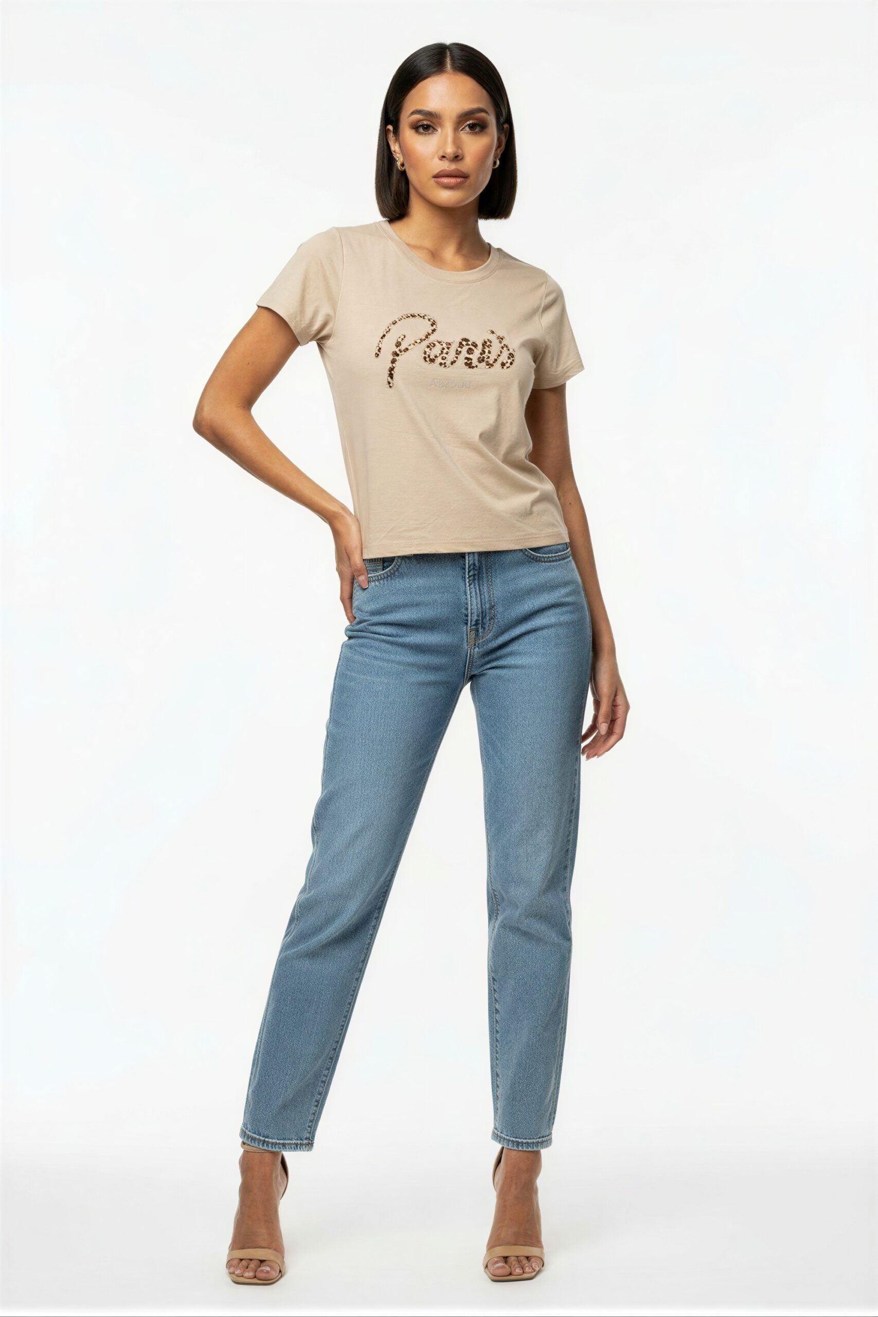 Playera cuello redondo manga corta con aplicación frontal y acabado suave al tacto