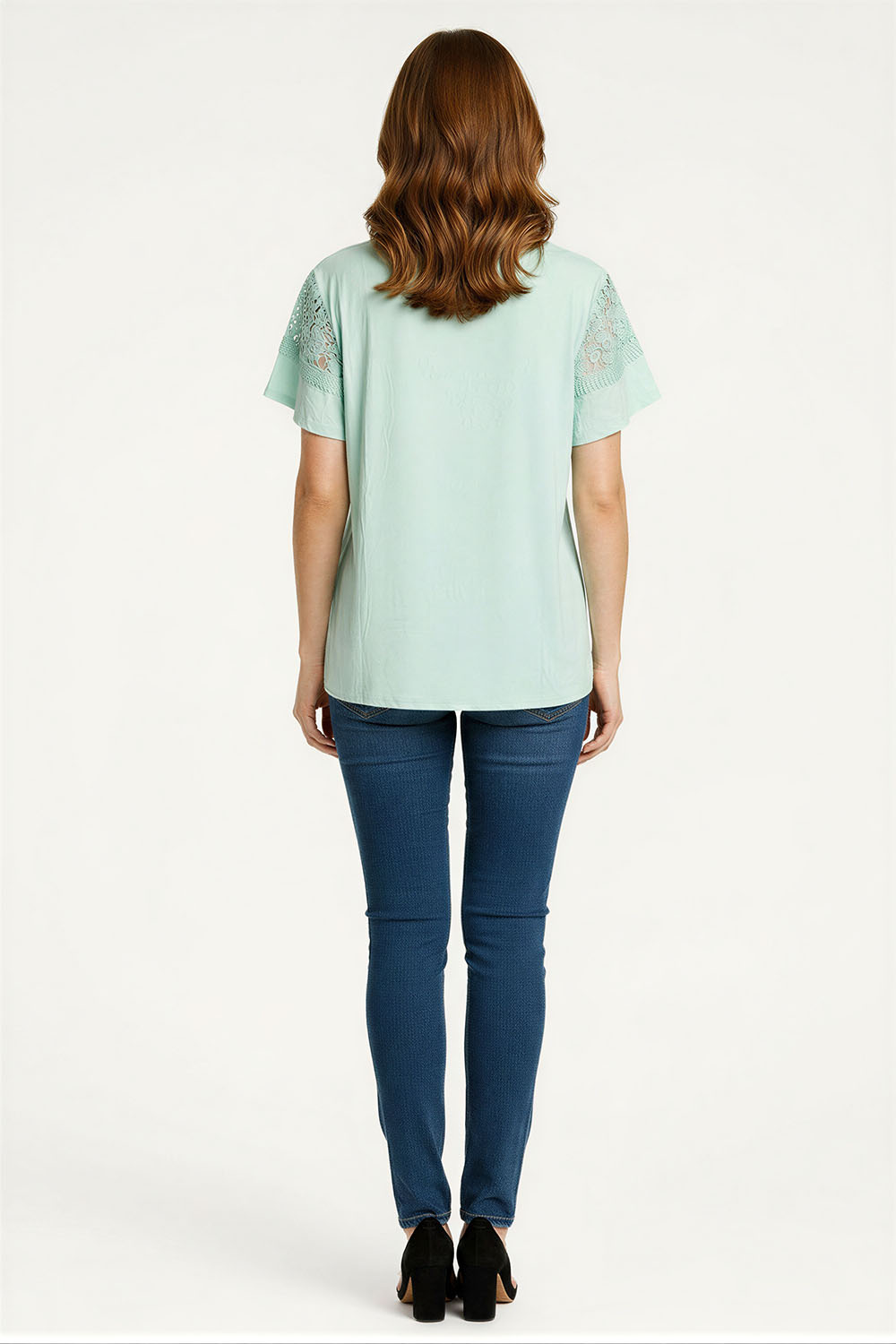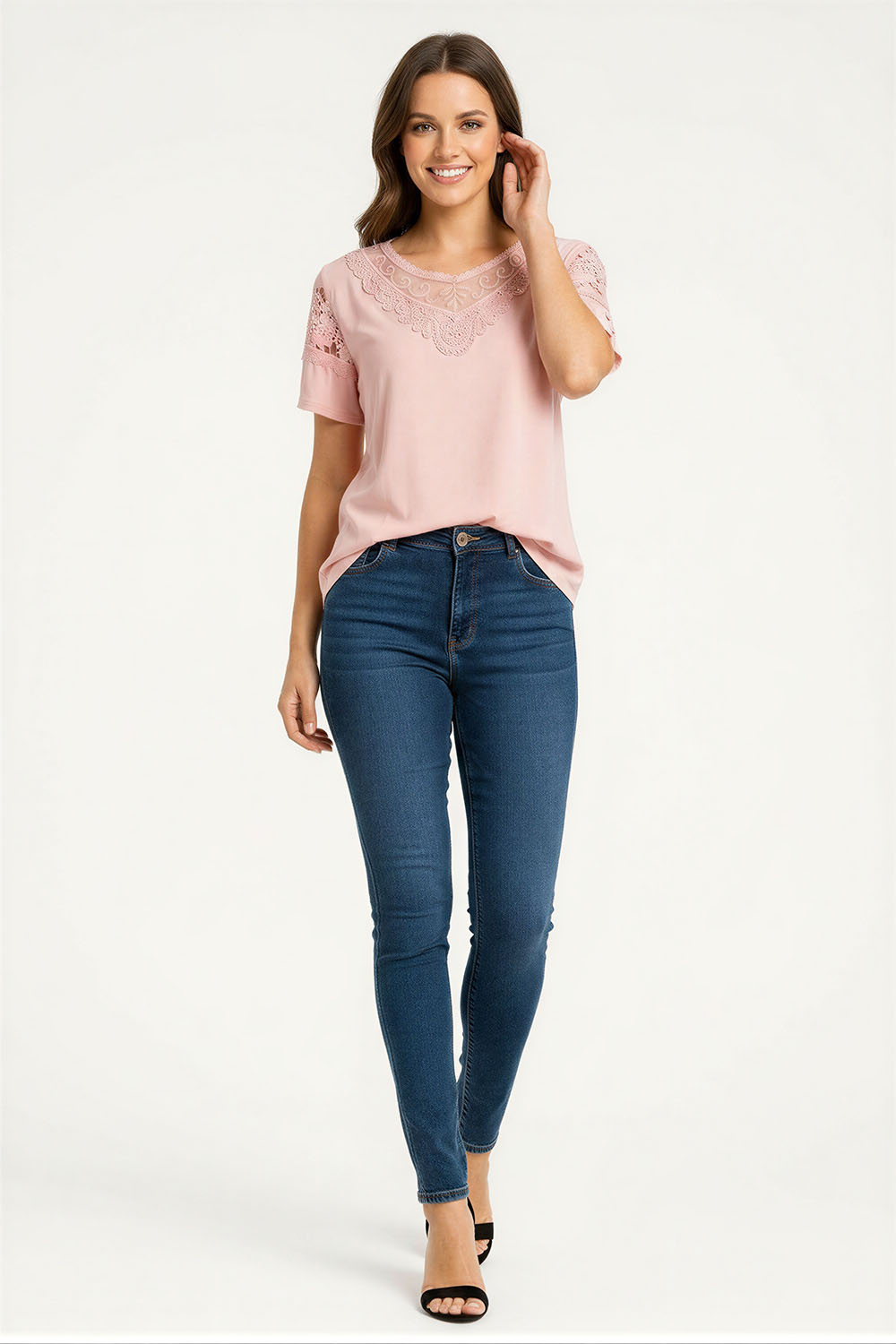 Playera de manga corta con aplicación tipo crochet en parte superior, escote redondo, caída ligera con ajuste relajado, terminaciones suaves que brindan comodidad