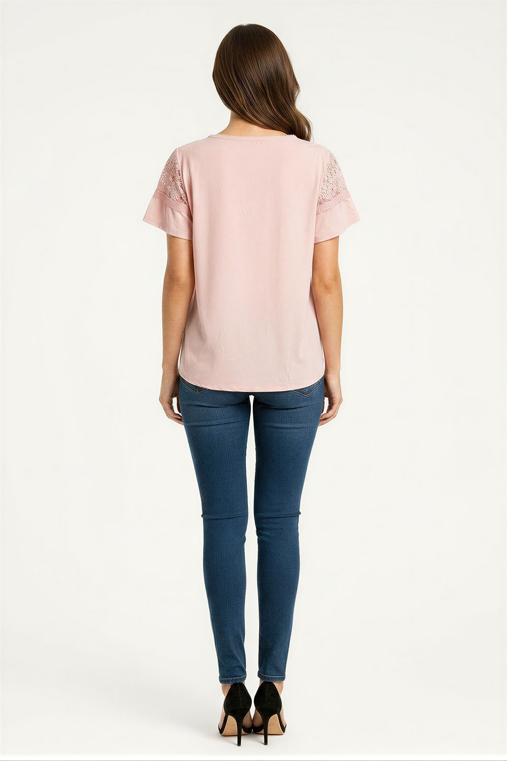 Playera cuello redondo con fruncido y manga corta de crochet