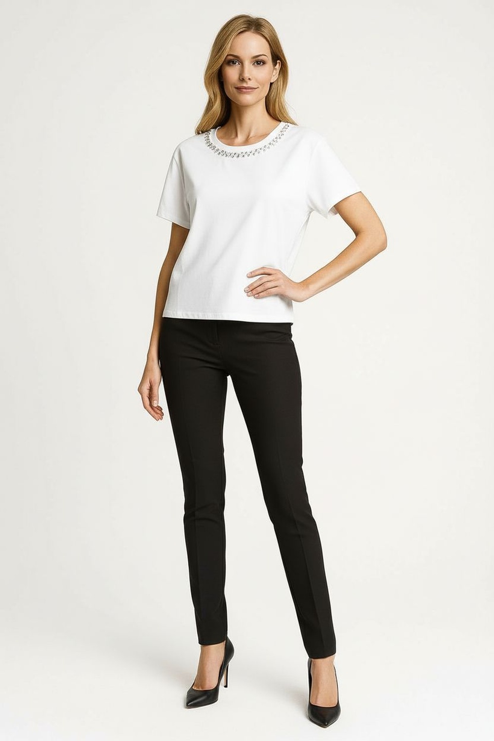 Playera de manga corta con cuello redondo decorado con aplicaciones brillantes integradas, corte recto que brinda comodidad, confección en tejido ligero con buena caída, estructura flexible que permite movimiento, acabados prolijos en mangas y bajo