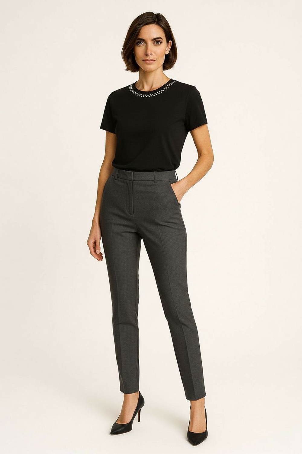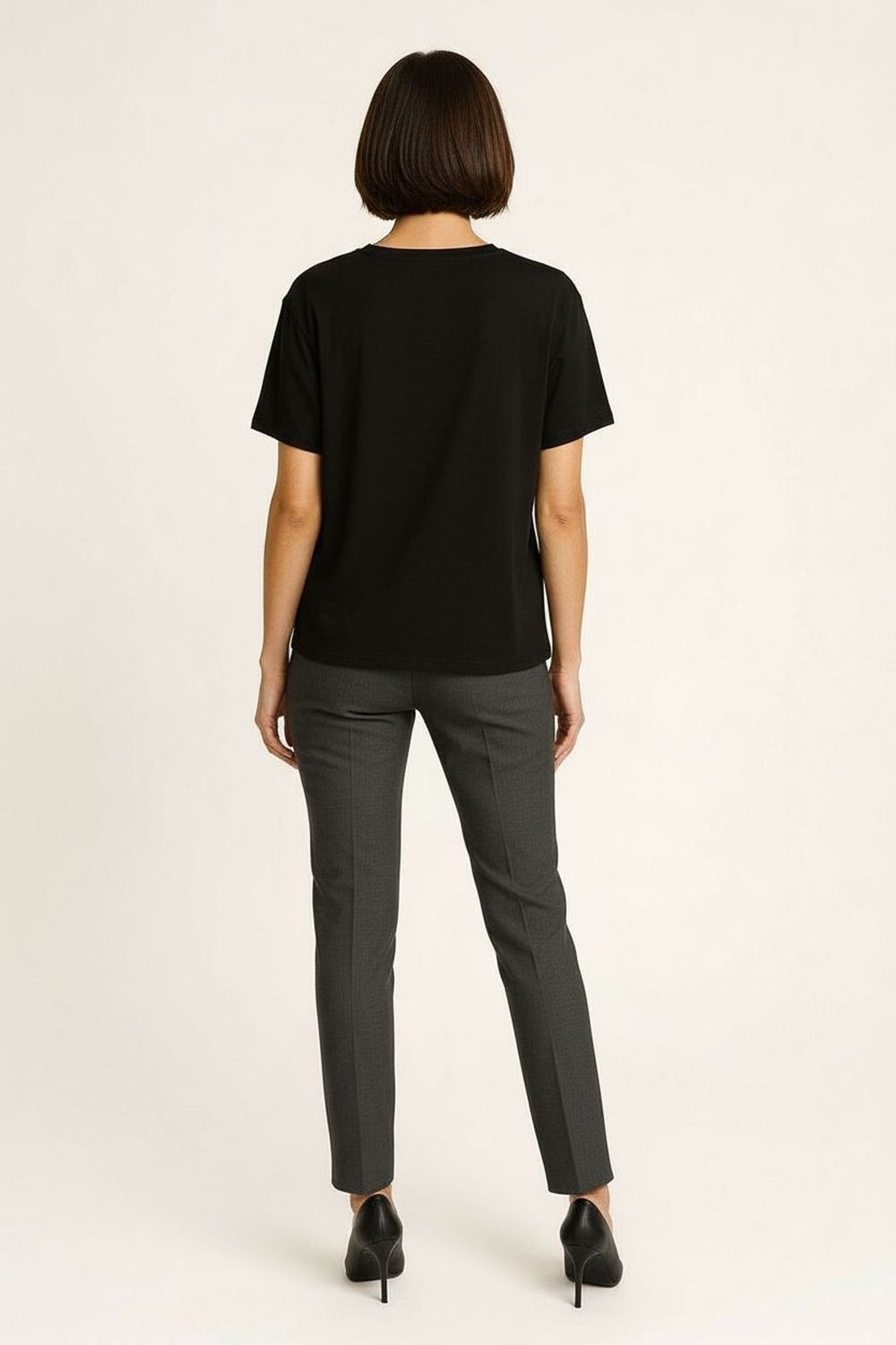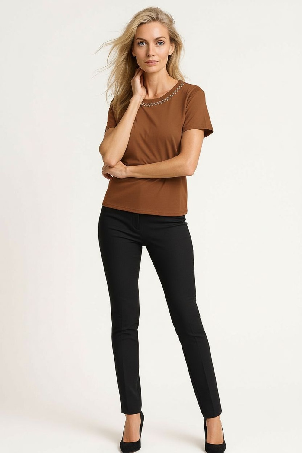 Playera de manga corta con cuello redondo y silueta recta, confección en tejido suave al tacto con aplicaciones brillantes colocadas de manera uniforme, estructura ligera que se adapta al cuerpo, terminaciones limpias en cuello mangas y bajo para mejor presentación