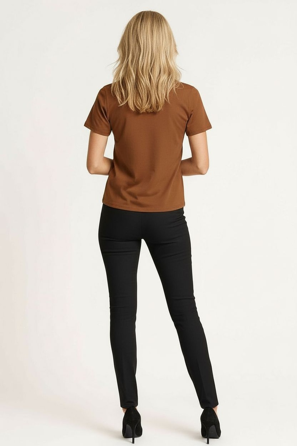 Playera con efecto medio brilloso que aporta un estilo básico con acabado formal, confeccionada en tela ligera con sutil luminosidad que realza el diseño, cuello redondo clásico que ofrece versatilidad para diferentes ocasiones, manga corta tipo farol que añade un detalle femenino y moderno, ideal para atuendos casuales y formales de temporada, una prenda versátil que combina comodidad con un toque elegante