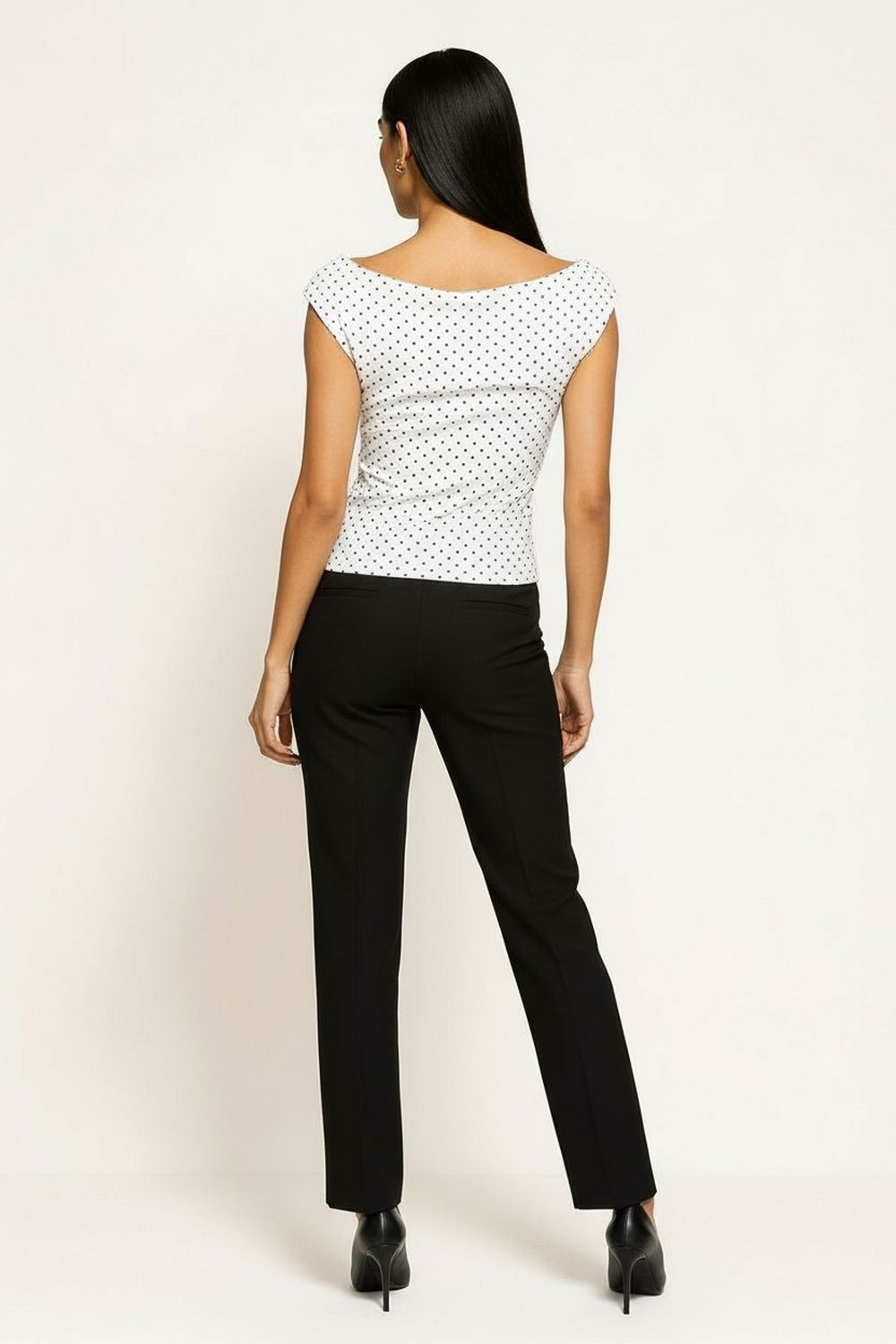 Playera con cuello redondo y jareta ajustable que permite personalizar el escote, manga corta con doble vuelo que aporta dinamismo, confección en tela ligera con caída natural, detalle de aplicación metálica al final de las cintas que añade un acabado sofisticado