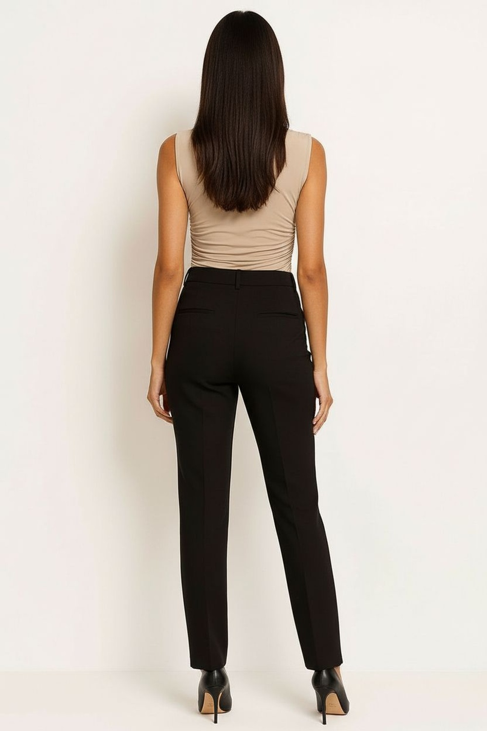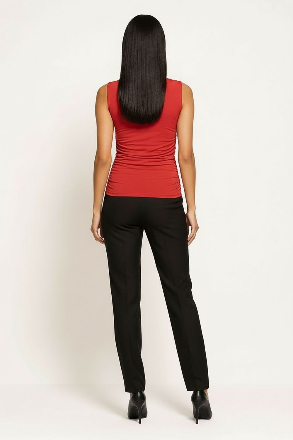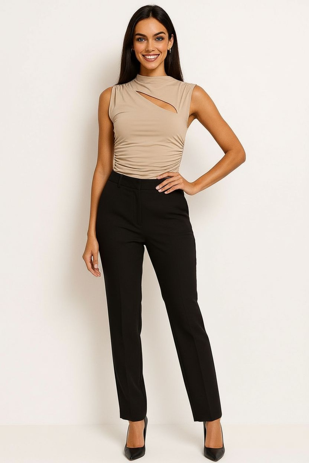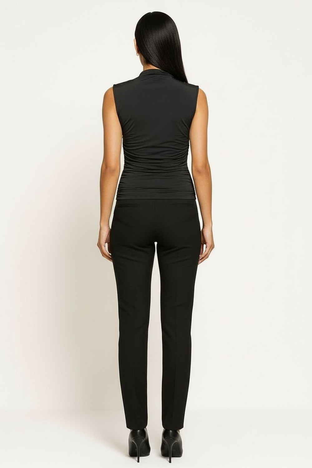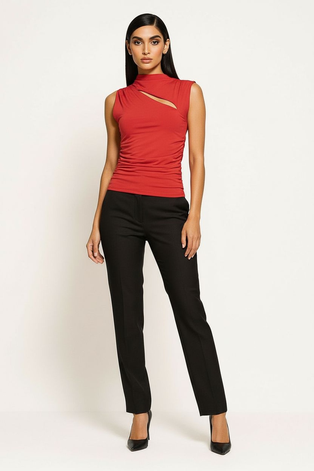Playera sin mangas con cuello alto y diseño asimétrico con abertura frontal discreta, drapeado lateral que aporta textura y definición a la silueta, confección en tela elástica de tacto suave que se adapta al cuerpo, largo a la cadera que brinda ajuste cómodo y estructura estilizada