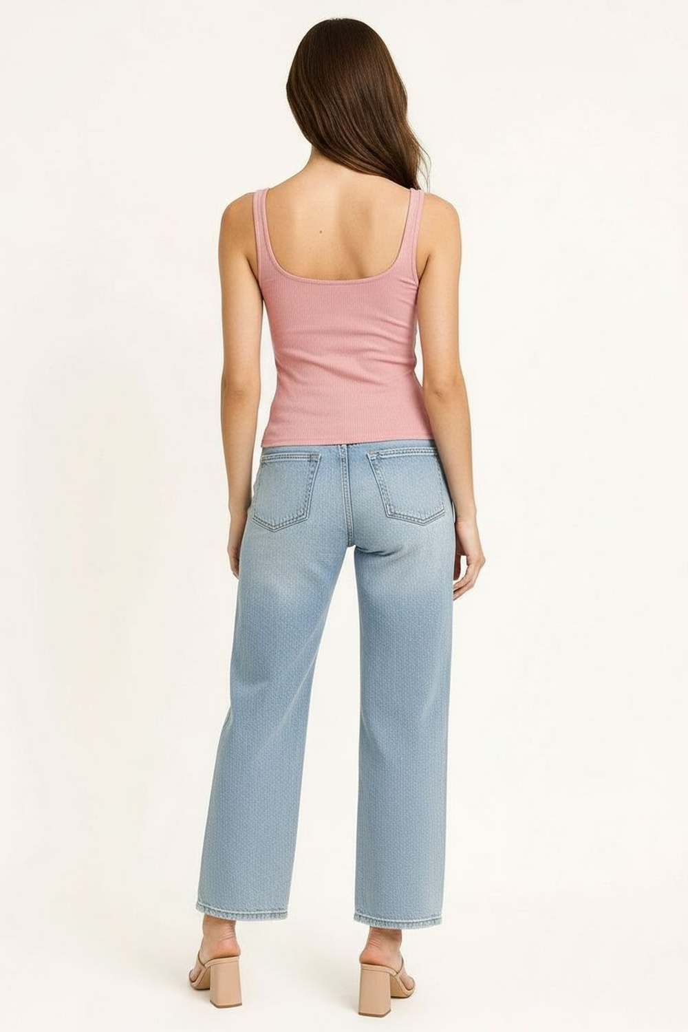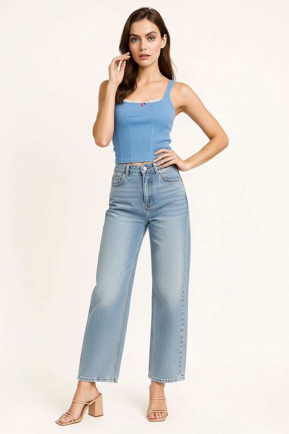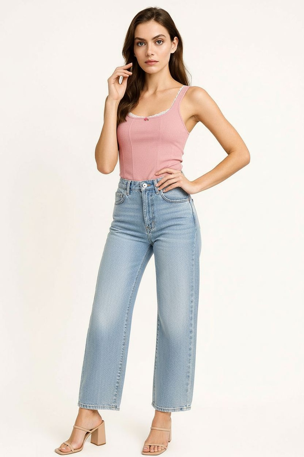 Playera sin mangas con escote cuadrado decorado con encaje delicado que enmarca el área superior, corte semiajustado que define la silueta sin limitar movimiento, largo a la cintura con terminación recta, confección en tejido acanalado de textura elástica que aporta adaptación cómoda al cuerpo