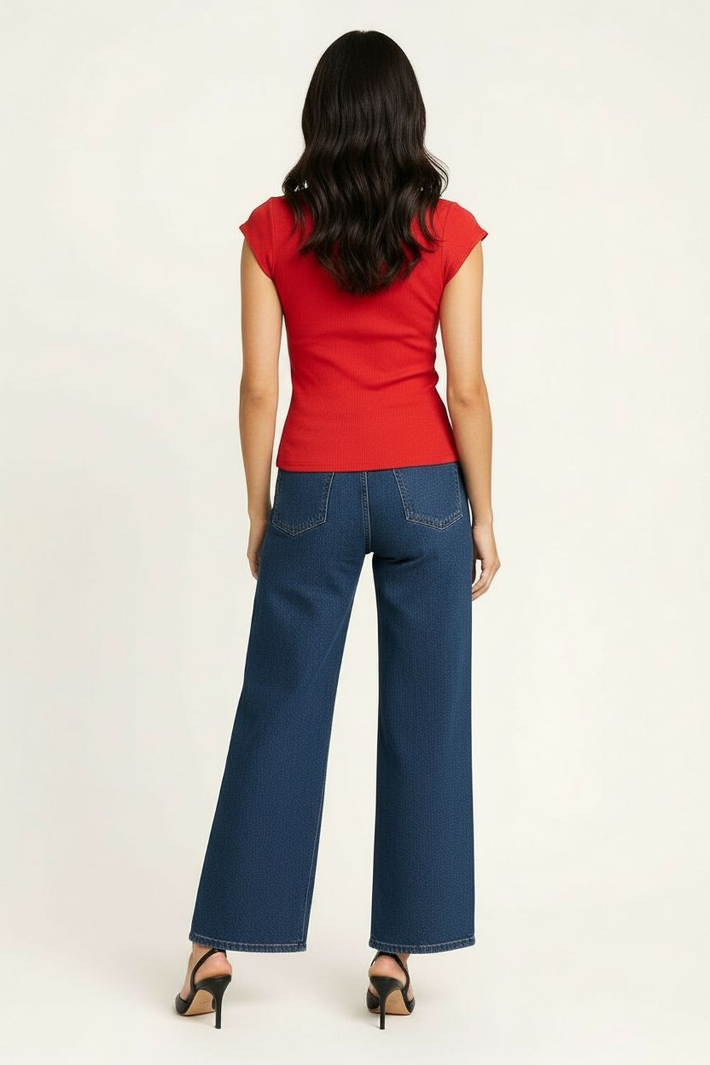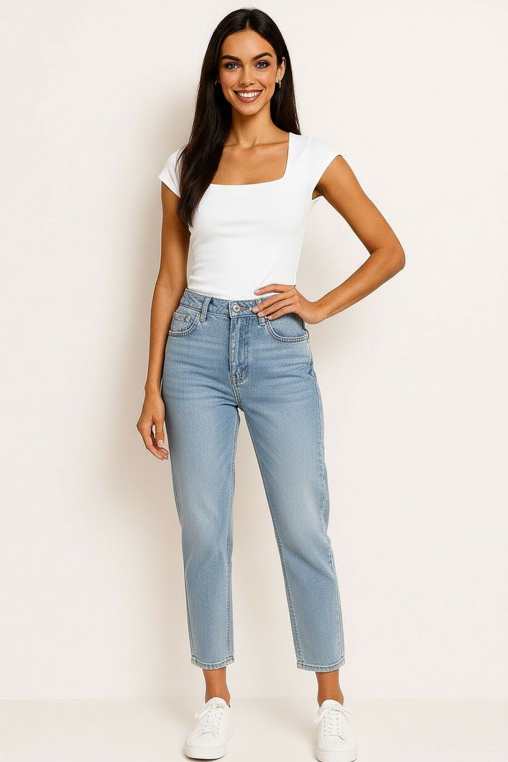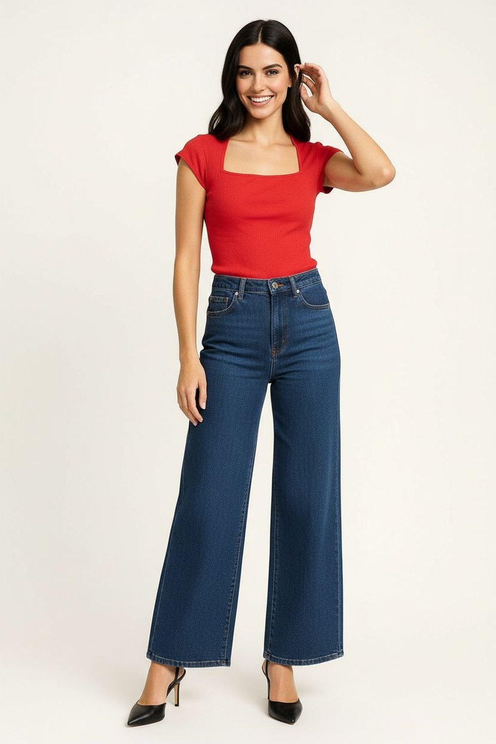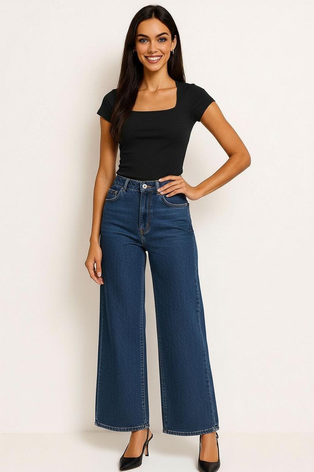 Playera de manga corta con escote cuadrado, confeccionada en tejido de textura suave, ajuste ceñido que define el contorno, superficie uniforme con terminaciones limpias, diseño cómodo y funcional