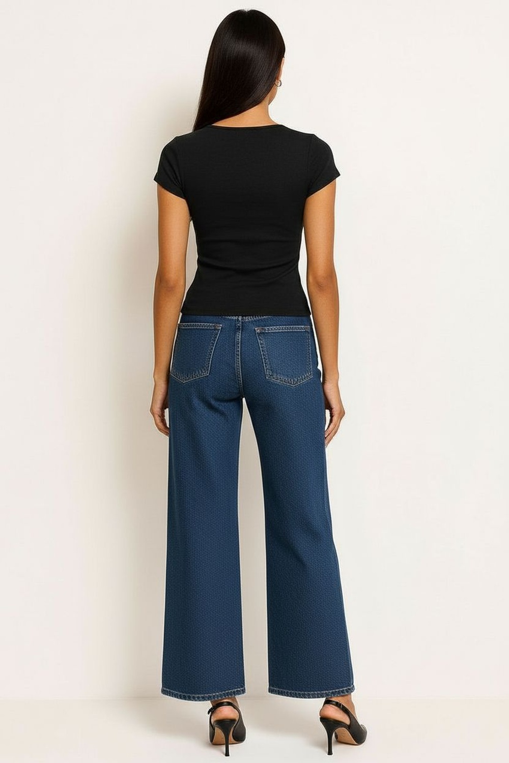 Playera de manga corta con cuello redondo, confeccionada en tejido suave, detalle decorativo al frente con aplicación textil que aporta realce visual, estructura cómoda con caída natural, costado recto que mantiene equilibrio en la silueta