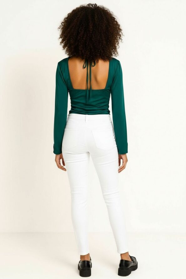 Playera de manga larga con corte ajustado que realza la silueta, escote profundo en V con detalle de unión frontal que aporta un toque atrevido y sofisticado, espalda descubierta con amarre que brinda sujeción segura y un acabado moderno, confección en tejido suave y flexible que se adapta cómodamente al cuerpo