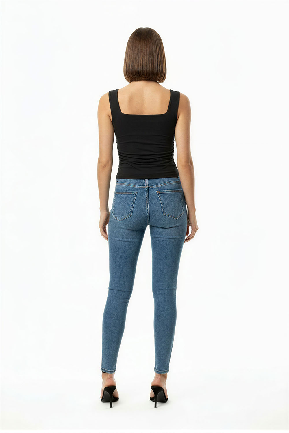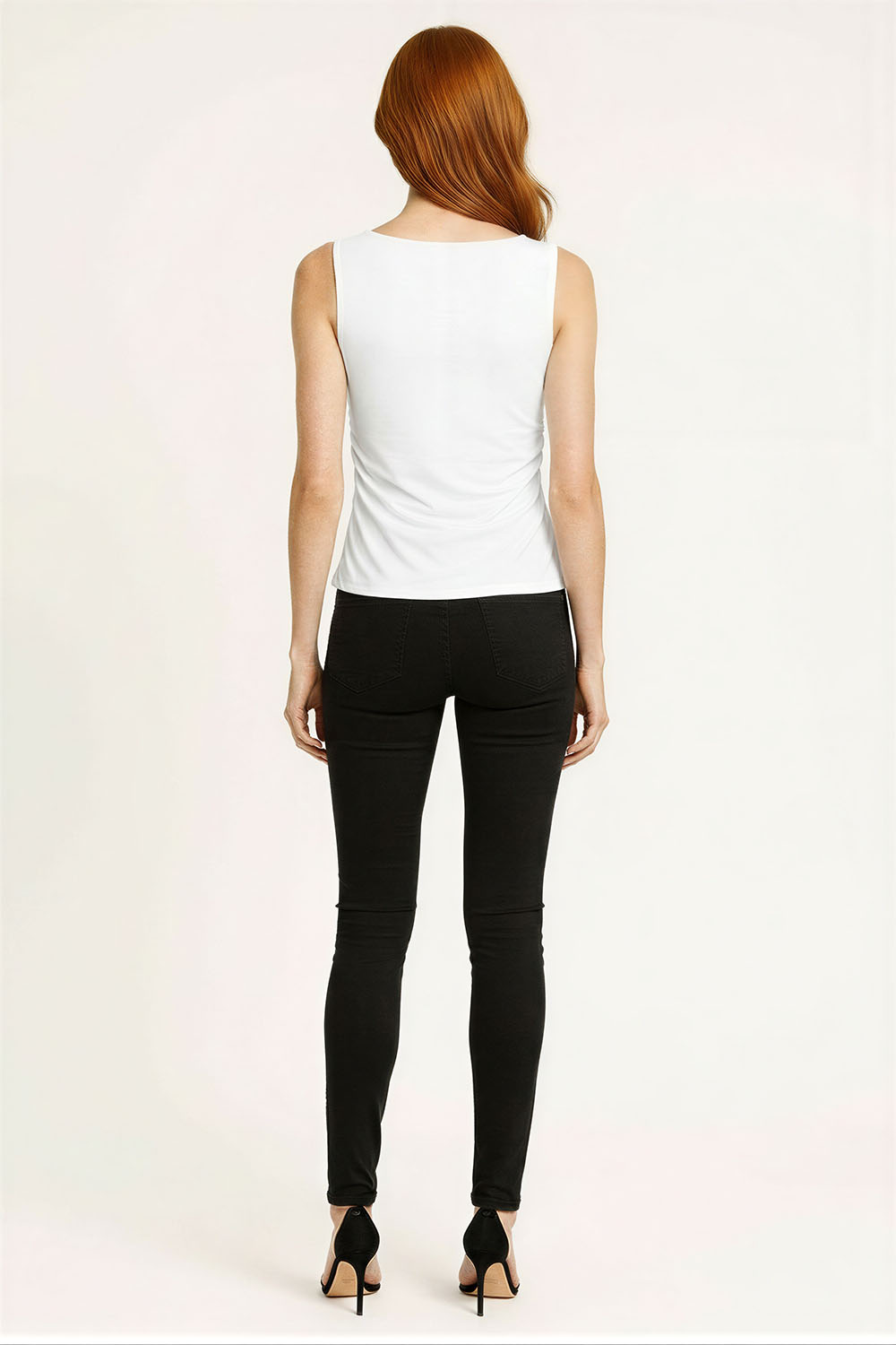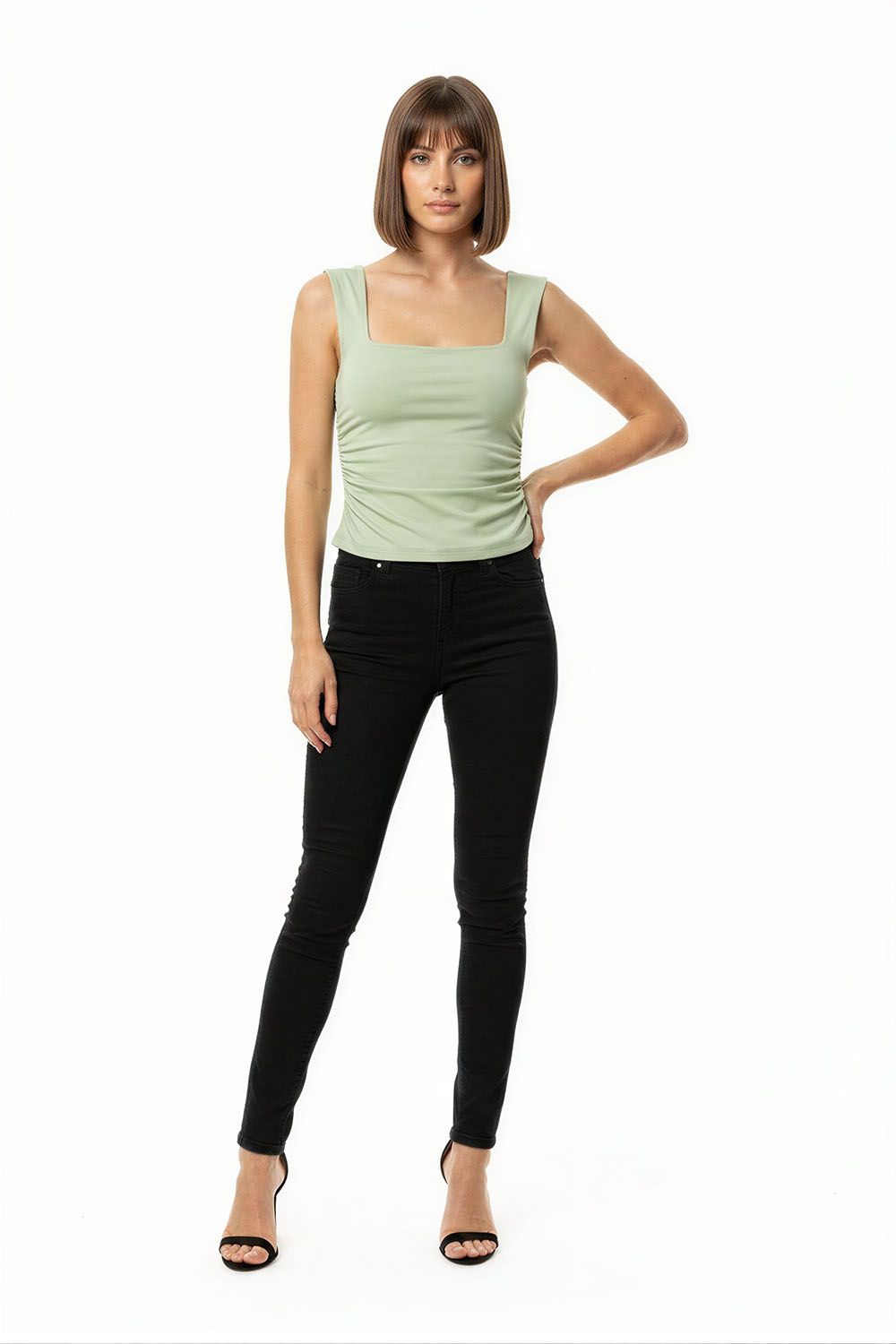 Playera sin mangas con escote recto y tirantes anchos que brindan soporte, corte recto con ajuste ligero que favorece la comodidad, confección en tejido elástico que permite libertad de movimiento, diseño limpio ideal para uso diario
