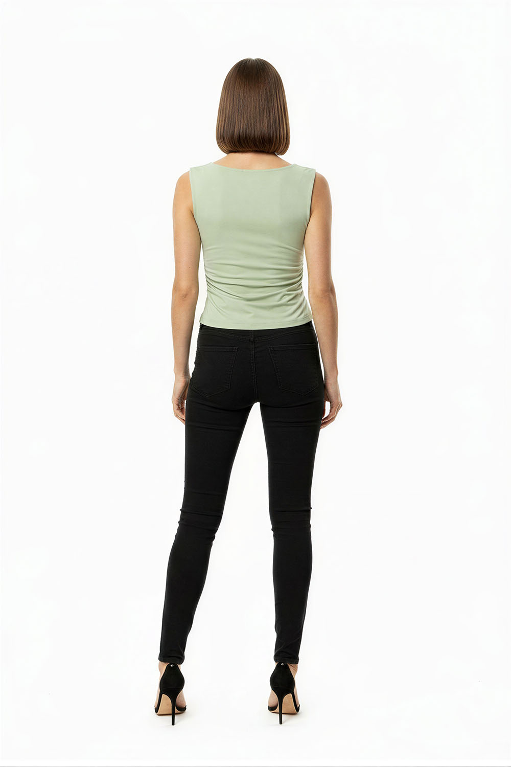 Blusa sin mangas con cuello plisado que aporta volumen y detalle, corte recto que brinda comodidad, diseño con abertura trasera que facilita el uso, confección ligera con caída suave que favorece la frescura, acabado fluido que estiliza la silueta