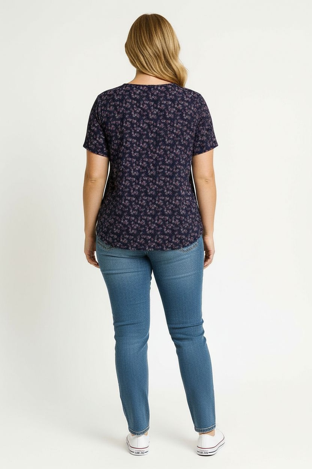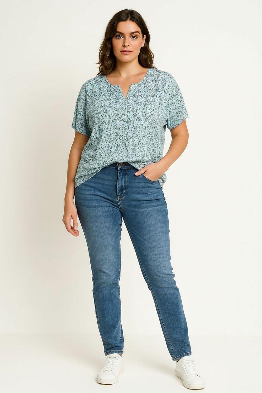 Blusa de manga corta con detalle de charreteras decorativas en los hombros, escote redondo con aplicación metálica que aporta un toque moderno, ruedo redondeado que favorece la caída natural de la prenda, ideal para combinar con pantalones de vestir o jeans para un look casual elegante